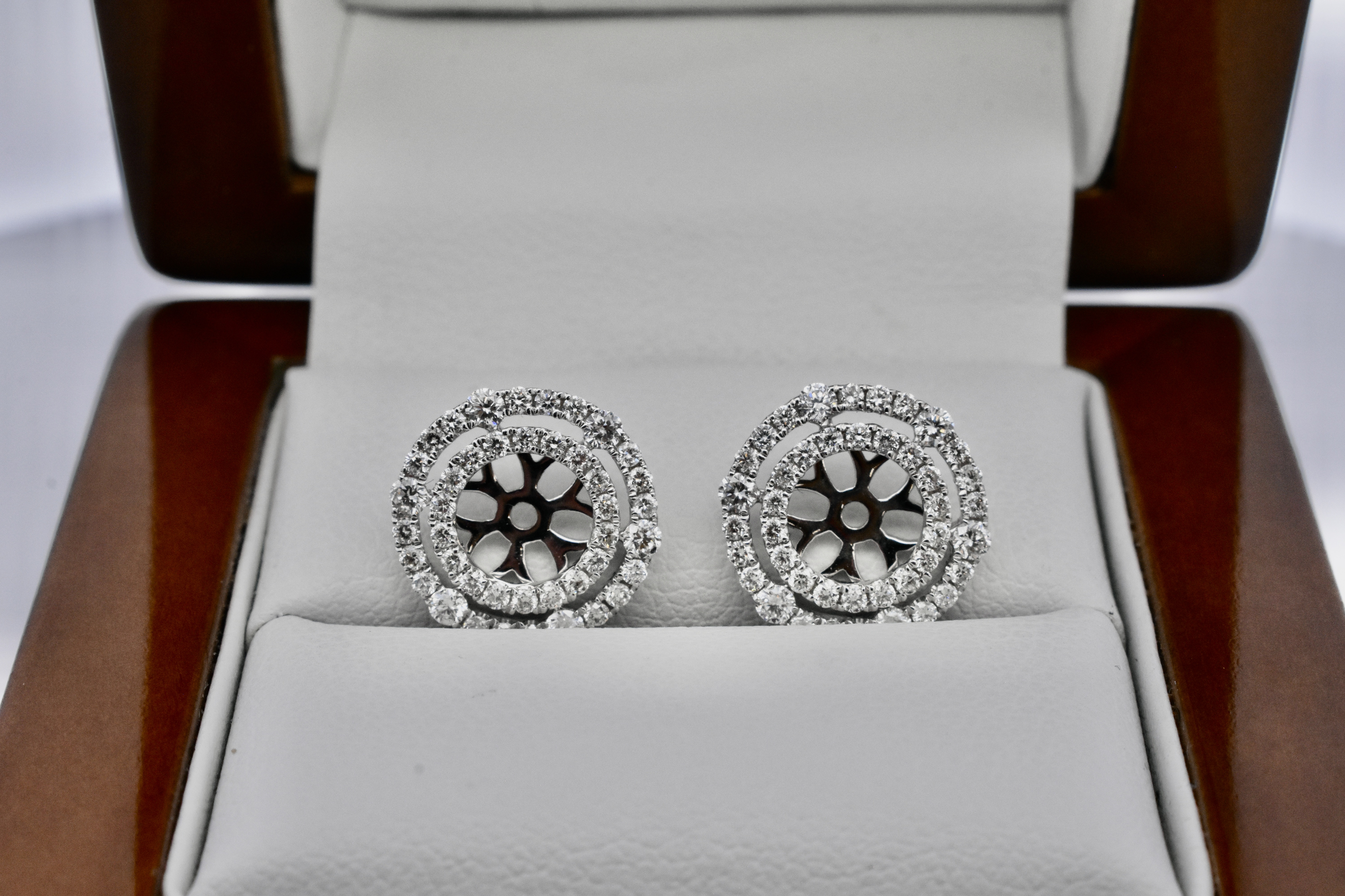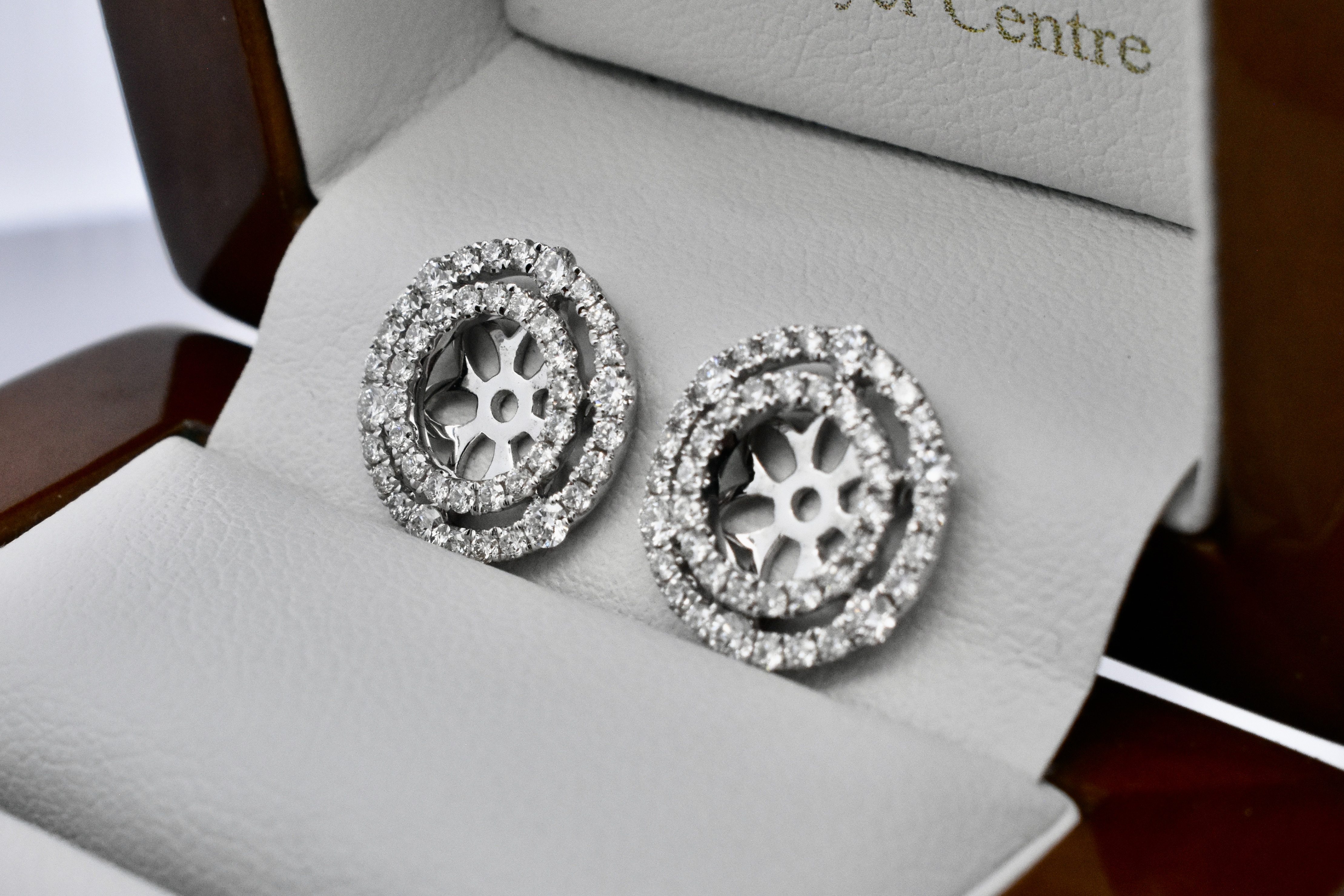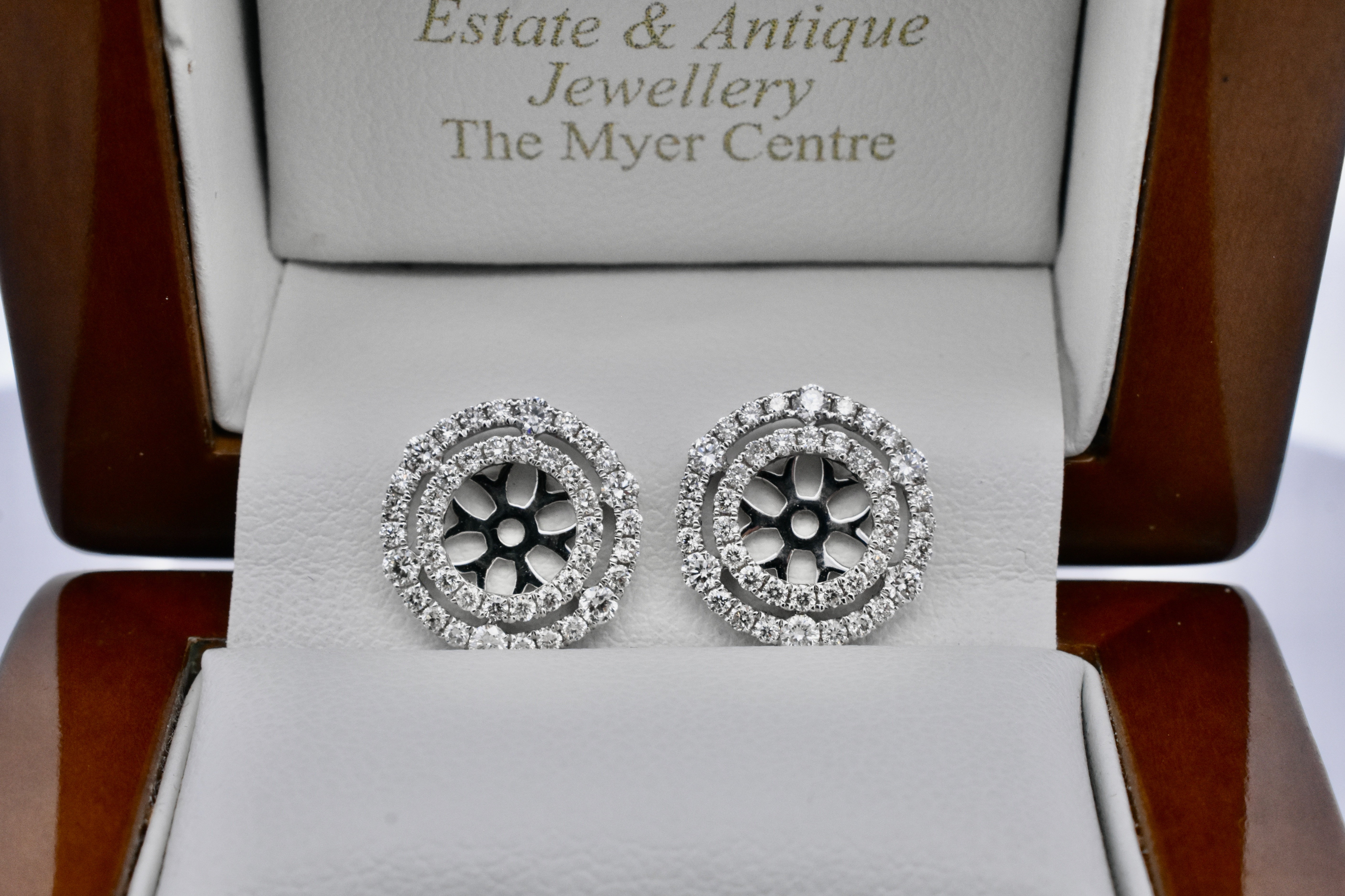 A stunning and versatile piece, these earring jackets are made from 18ct white gold and set with a double halo of white, sparkling diamonds and a cutout centre. The jackets are made to hold a pair of studs and give them an elevated and elegant evening style look. Total of eighty four diamonds equalling 0.84ct G/VS-SI