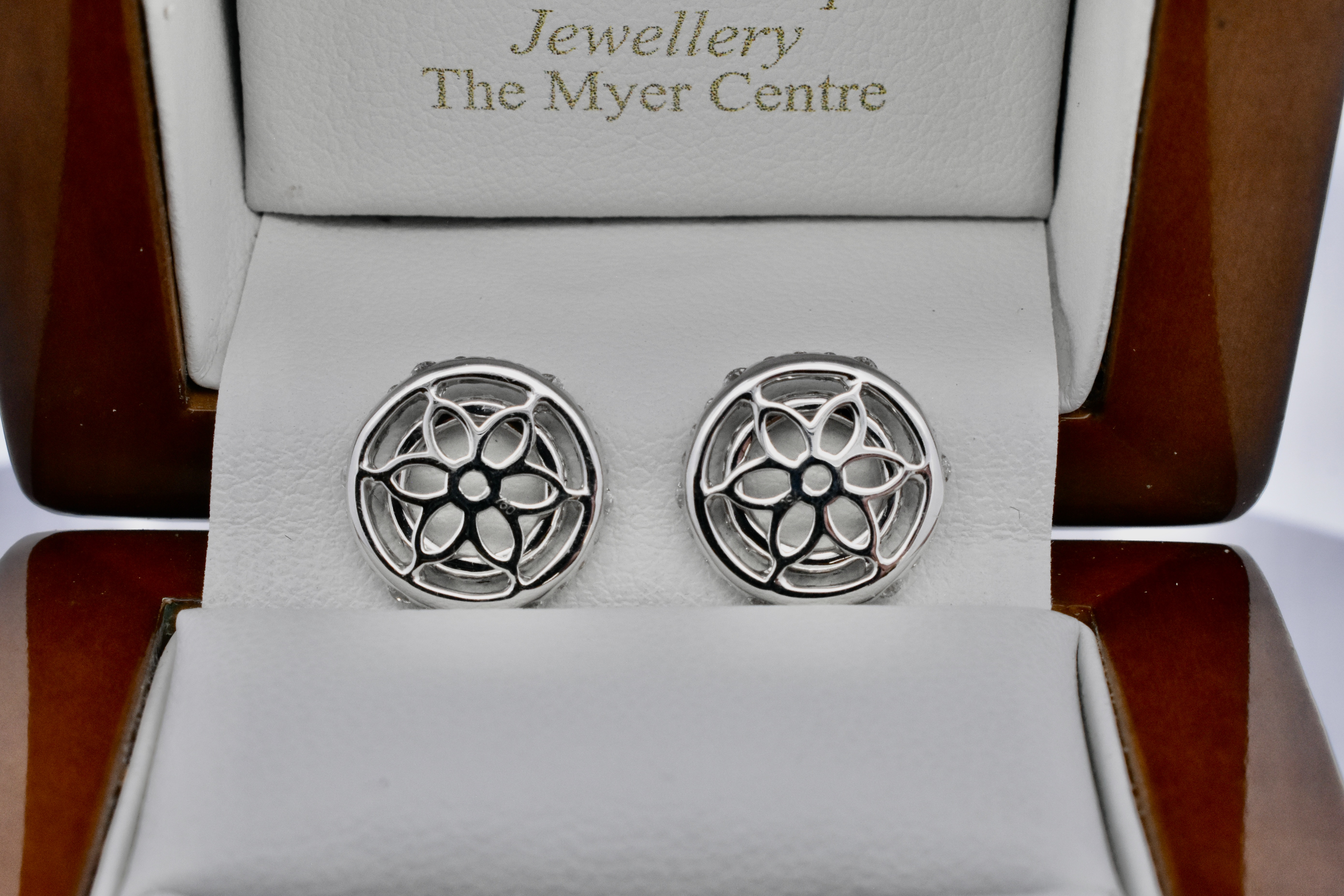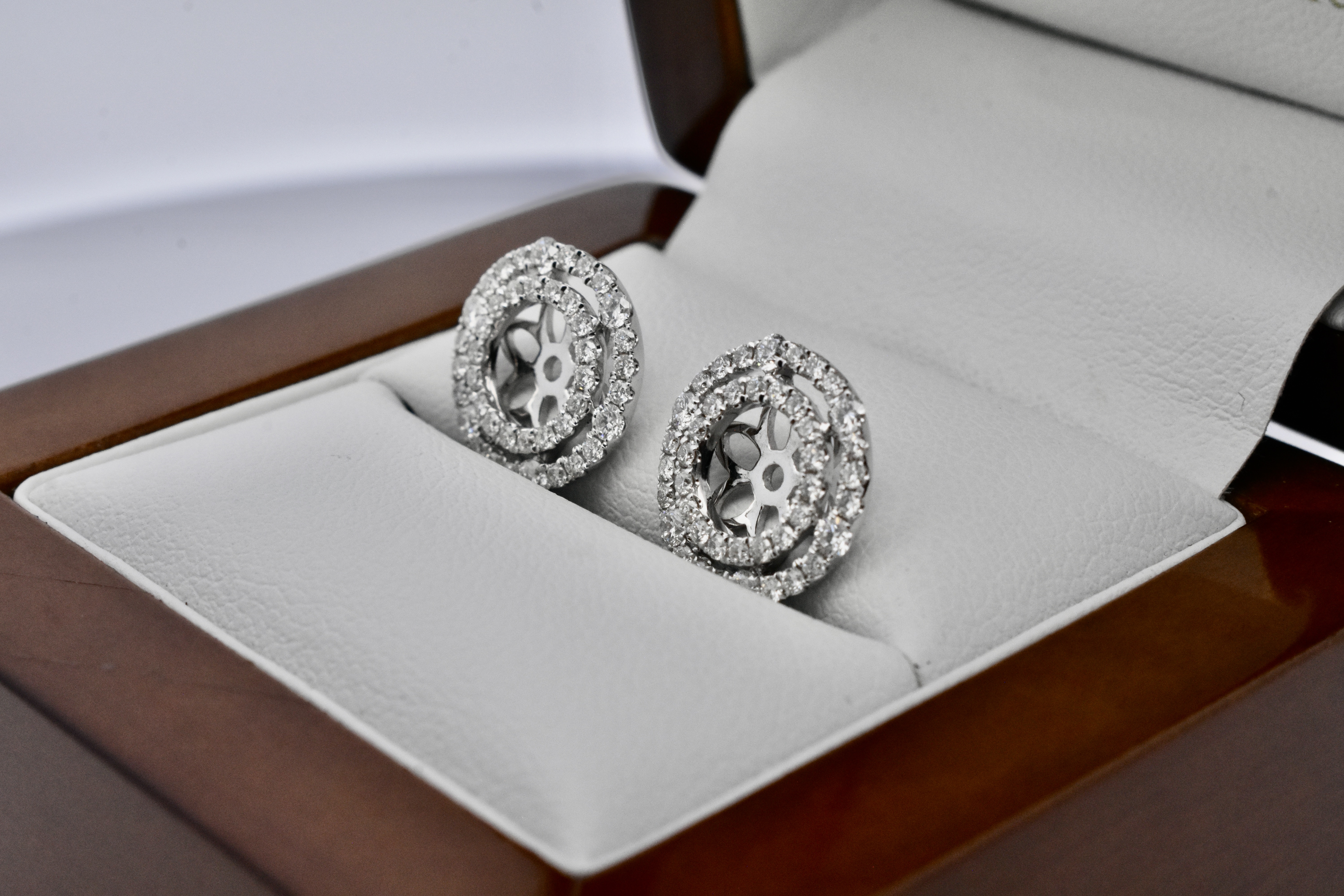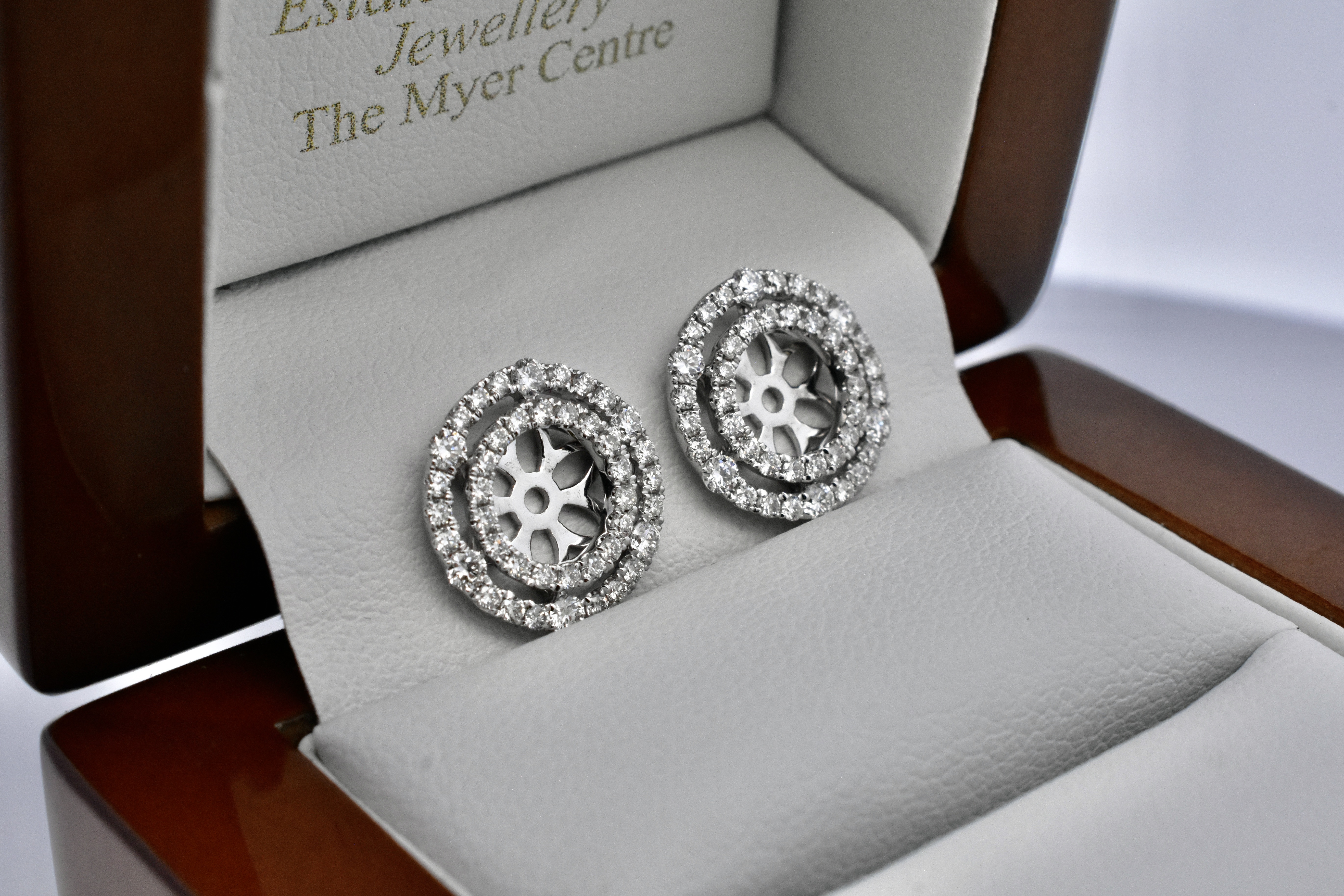 A stunning and versatile piece, these earring jackets are made from 18ct white gold and set with a double halo of white, sparkling diamonds and a cutout centre. The jackets are made to hold a pair of studs and give them an elevated and elegant evening style look. Total of eighty four diamonds equalling 0.84ct G/VS-SI
