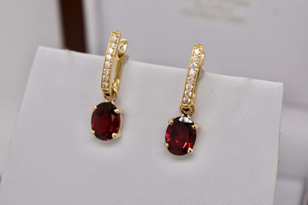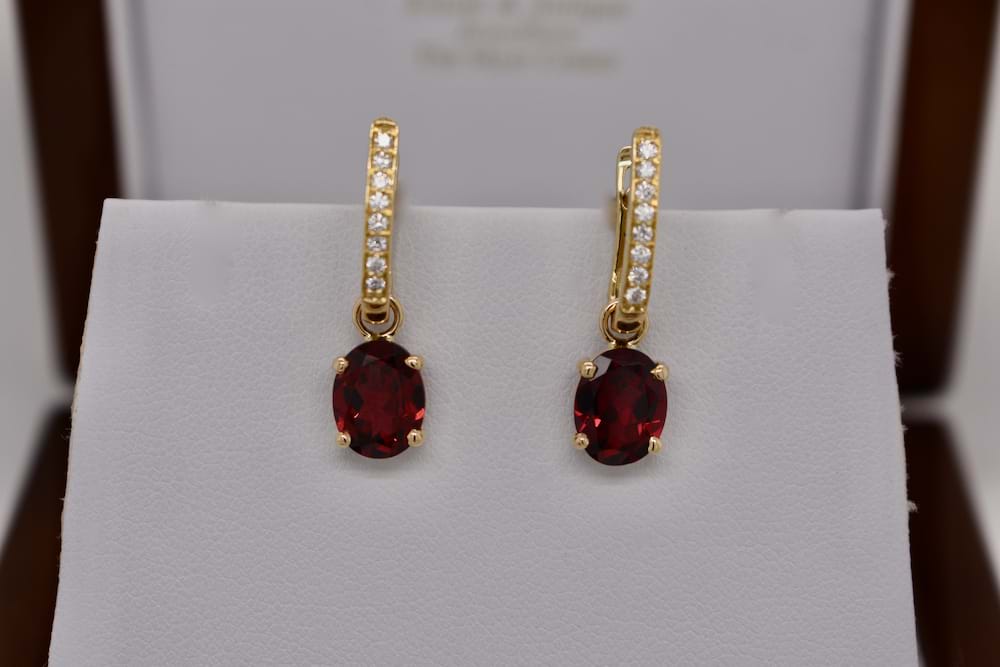 A pair of beautiful 18ct yellow gold huggies with 16 round brilliant cut diamonds equalling 0.152ct, featuring removable faceted oval garnet drops measuring 9 x 7mm claw set