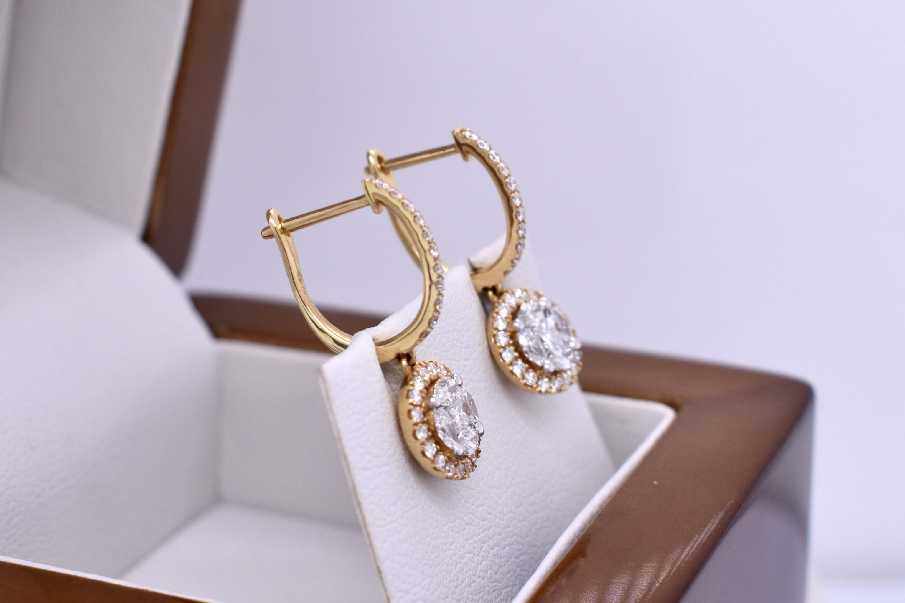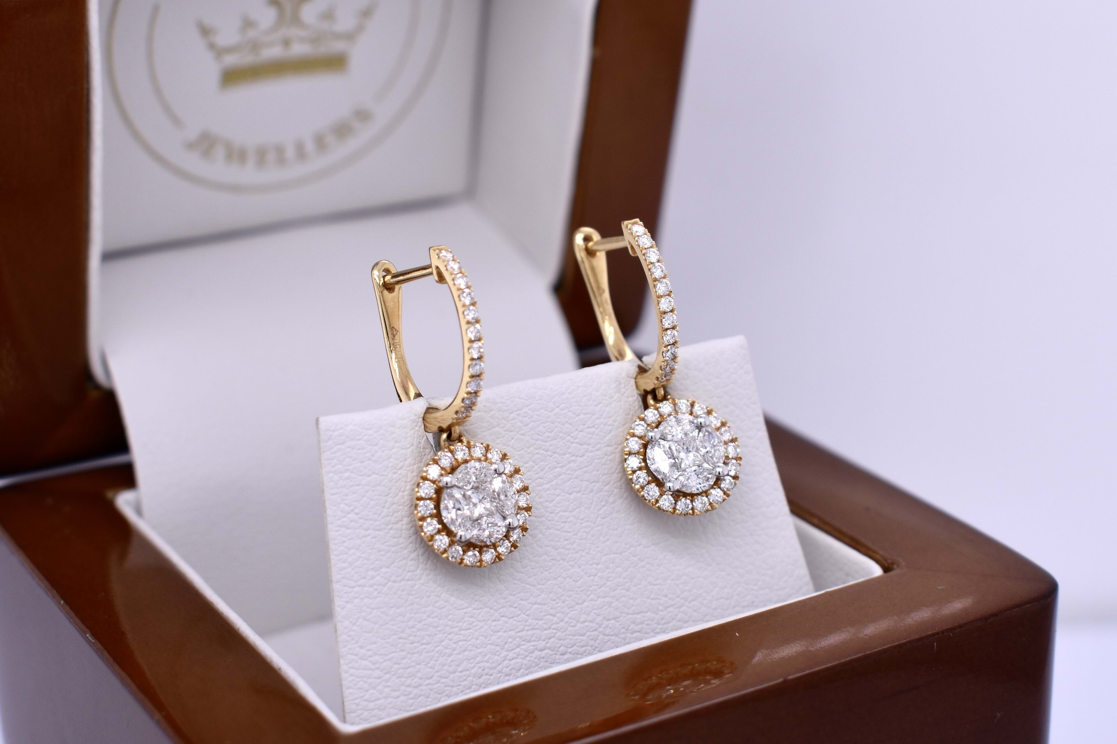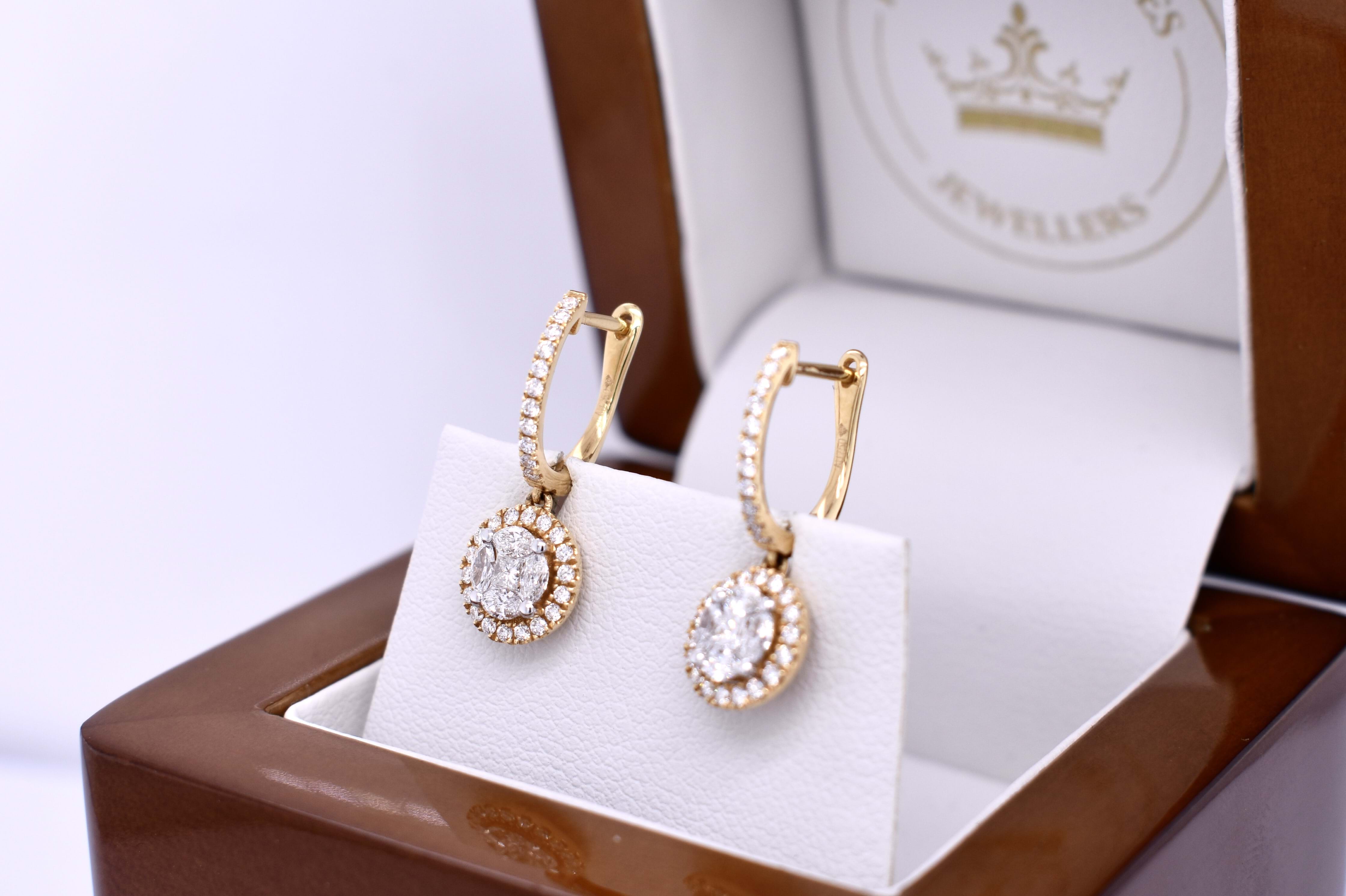 Crafted in 18ct yellow gold, these stunning huggies and round illusion drops. Huggies contain 11 round brilliant cut diamonds claw set in a hinged circular hoop with clipped post fittings. The drops give the illusion of a larger round diamond with a halo surround. They are designed using a princess cut diamond, 4 marquise and 18 round brilliant cut diamonds. Princess cut have a combined total of 0.08ct, marquise have a total of 0.33ct and round brilliant cut diamonds total 0.32ct FG VS-SI. The shared claws on the marquise diamonds are rhodium plated to blend in to the illusion setting. Independent Valuation Supplied.