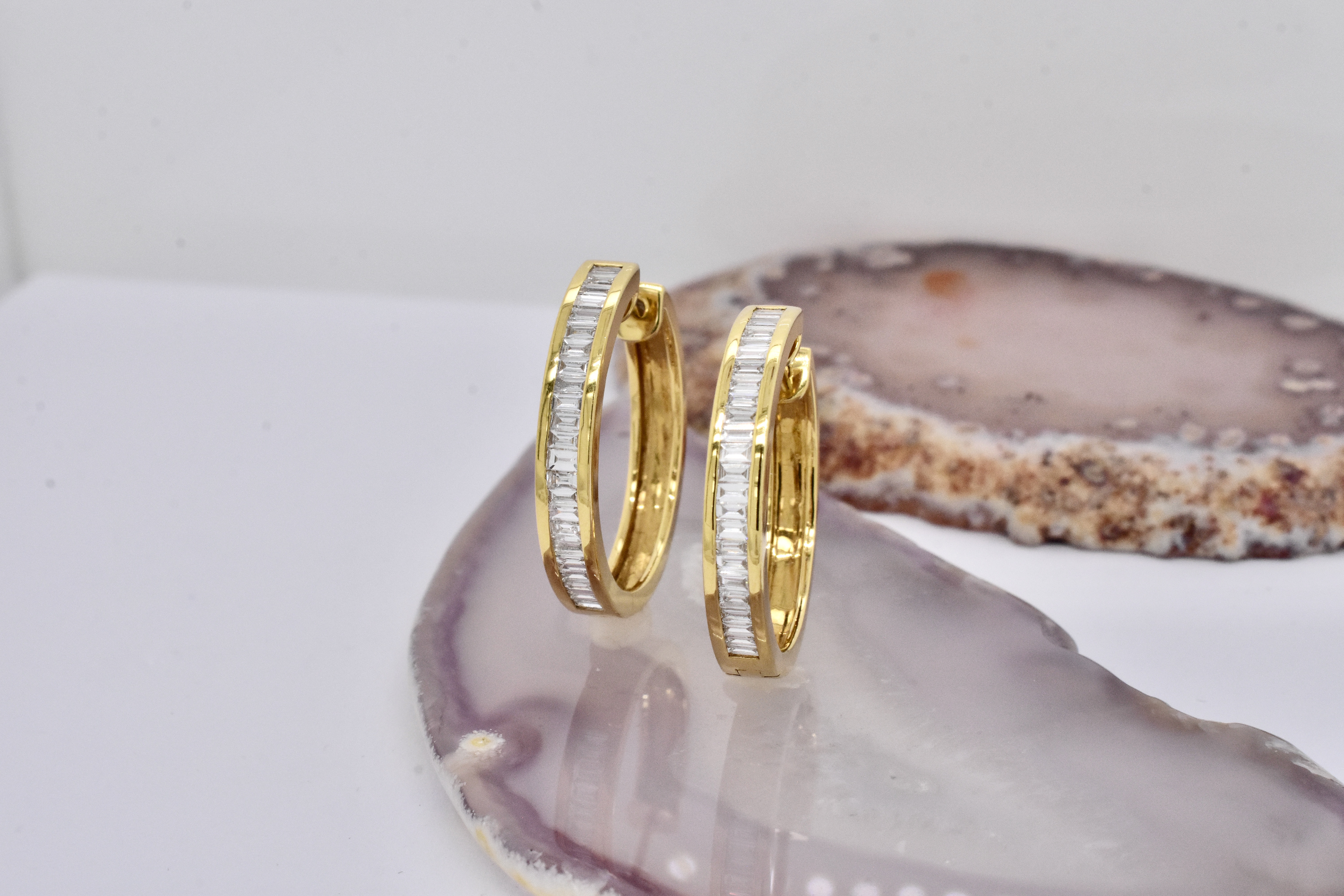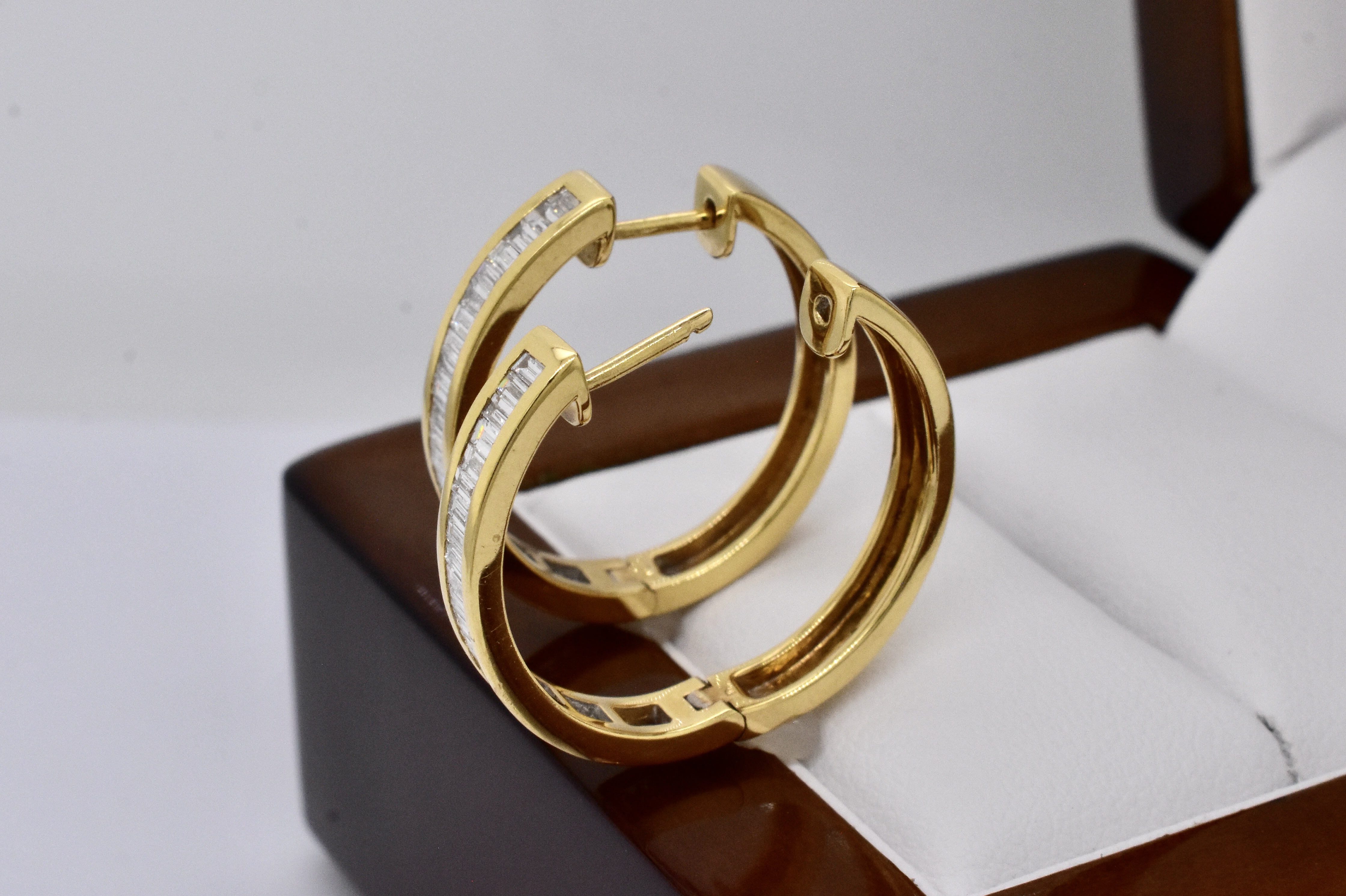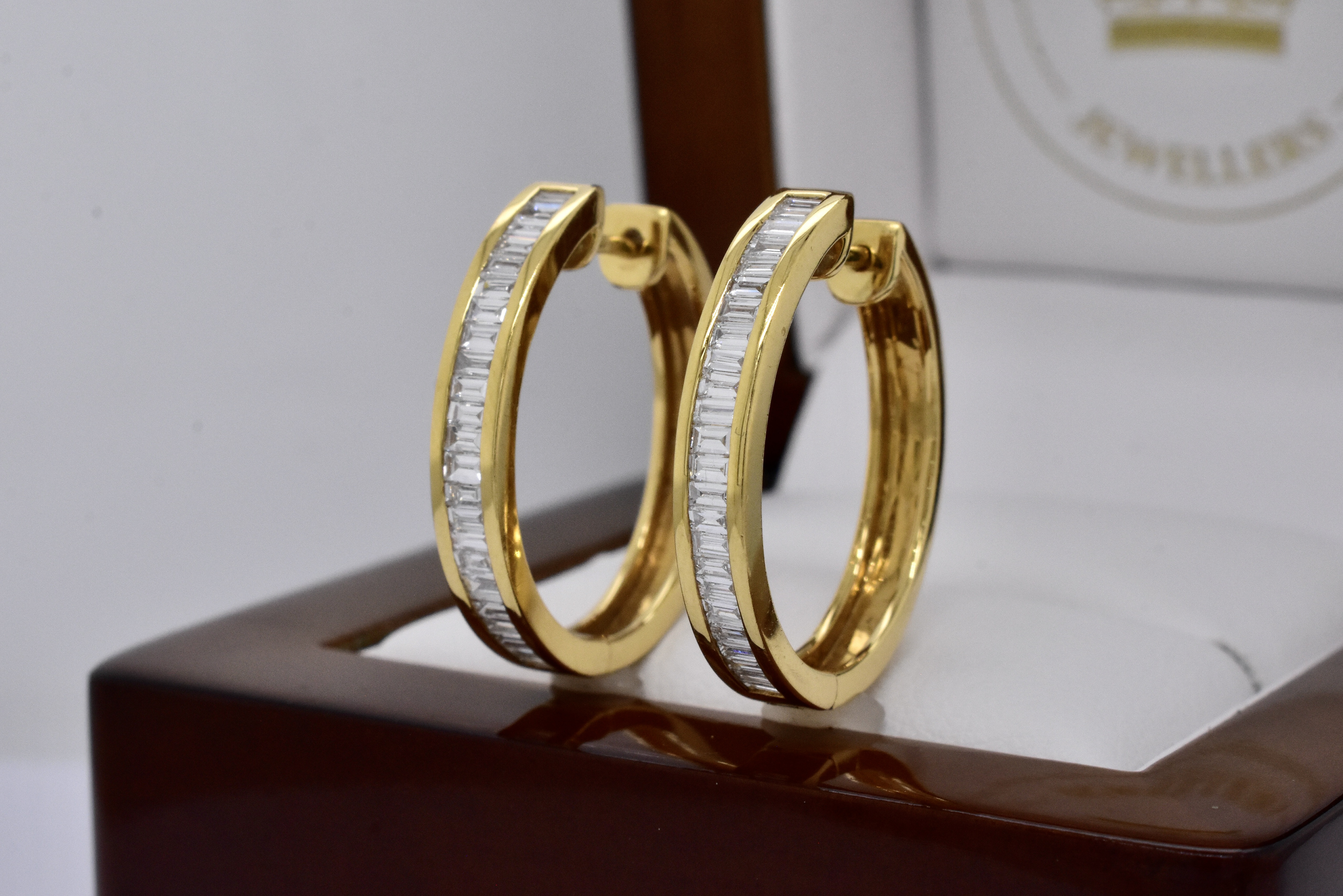 SOLD 18ct Yellow Gold 0.75ct Baguette Diamond Channel Set Oval Huggies