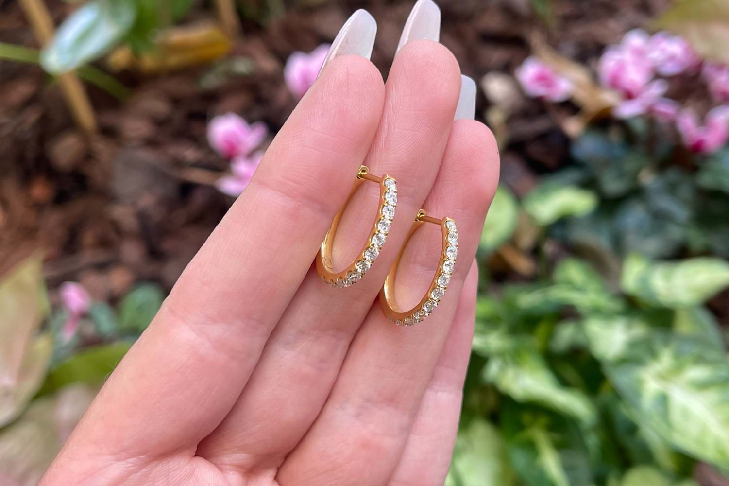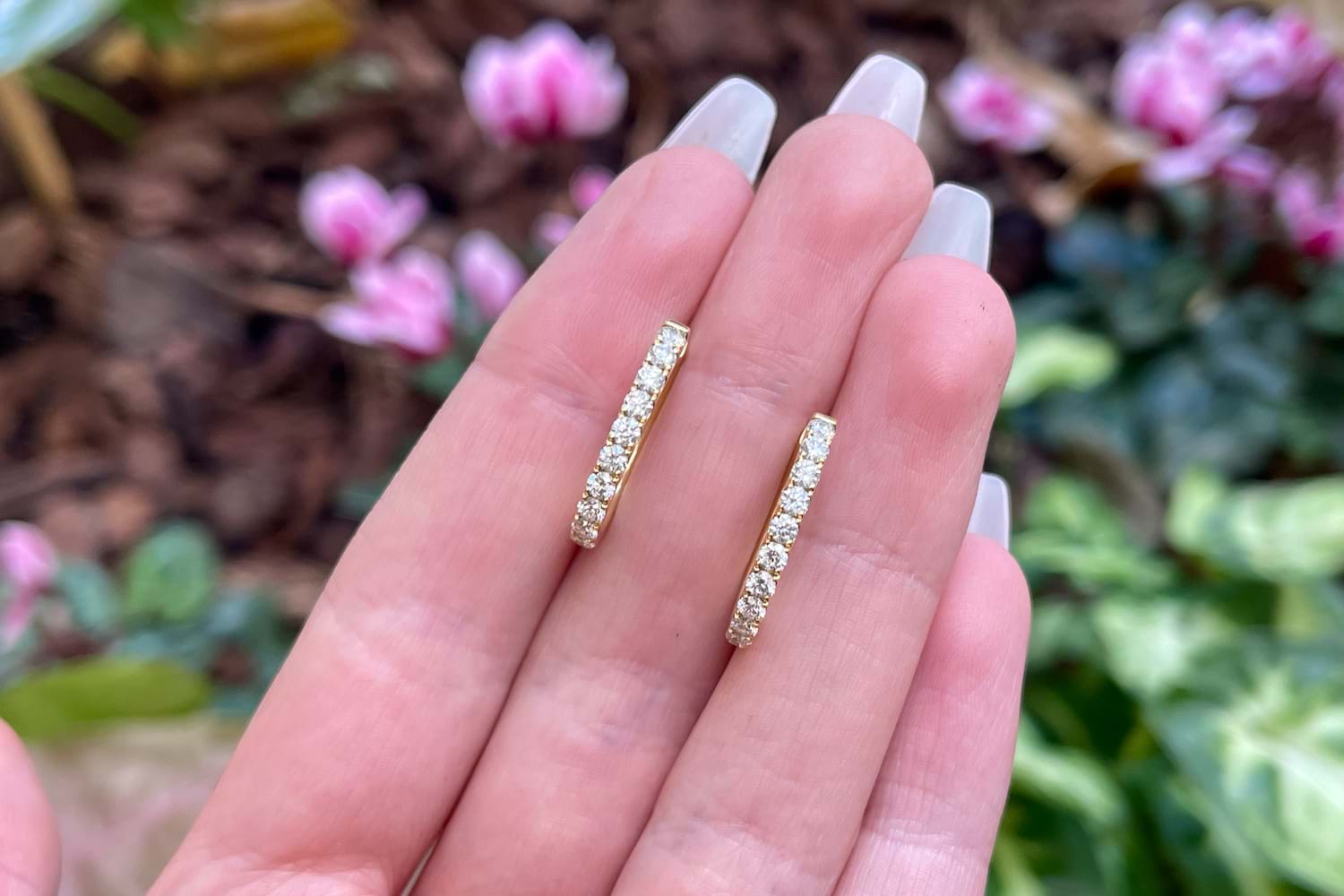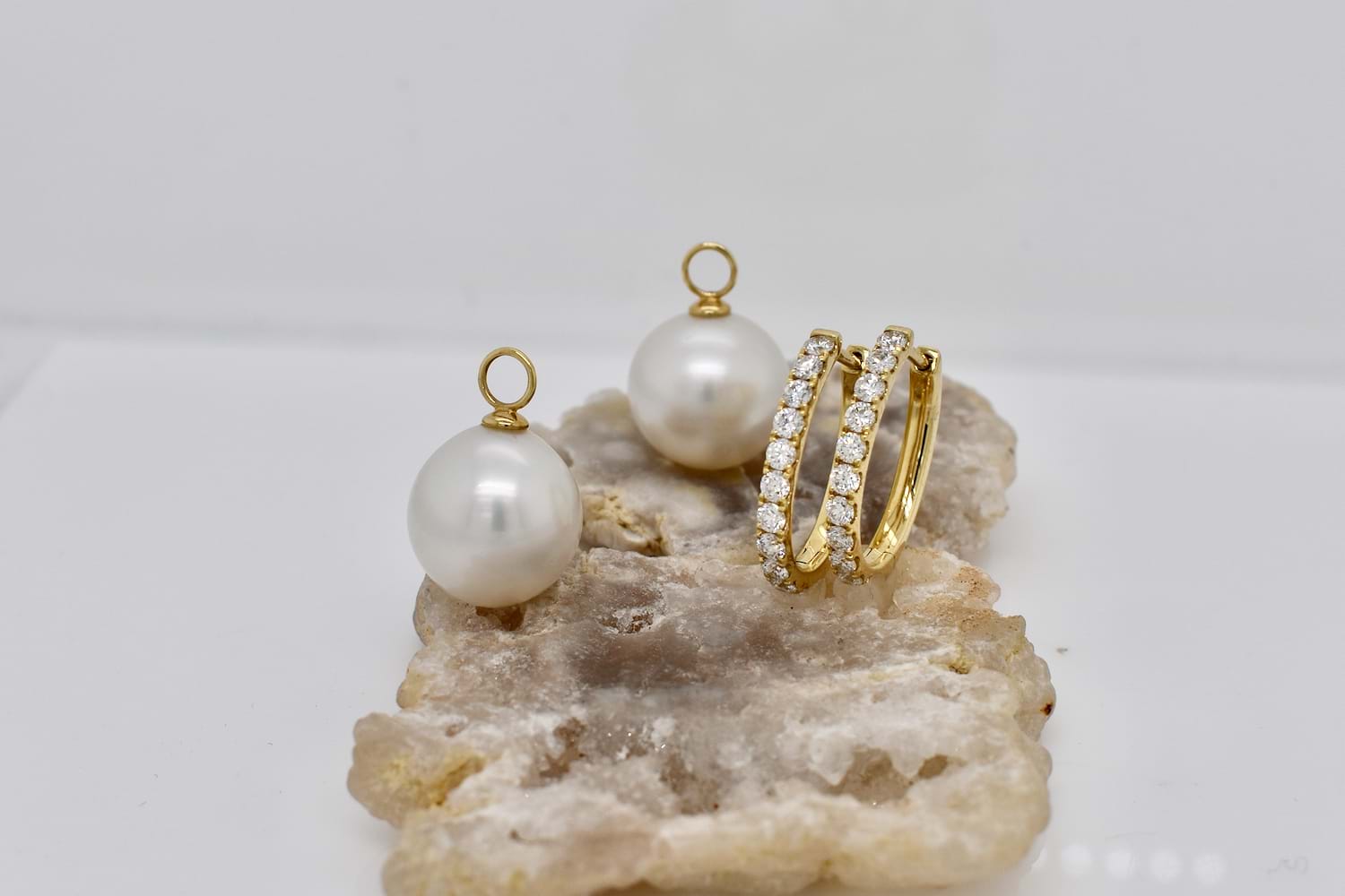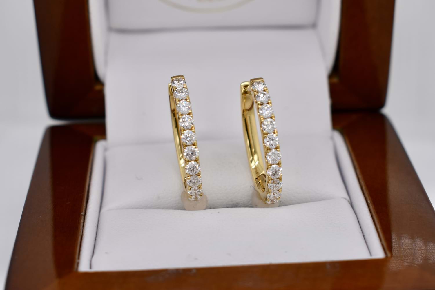 Our dazzling diamond huggies, crafted in 18ct yellow gold, in a flattering and elegant U shape design with each earring containing eleven round brilliant cut diamonds cut down claw set and a combined total of 0.93cts (FG/VS). These earrings are stunning on their own or paired with our pearl or gem set earring enhancers. Independent Valuation Supplied. Pearls available for separate purchase.