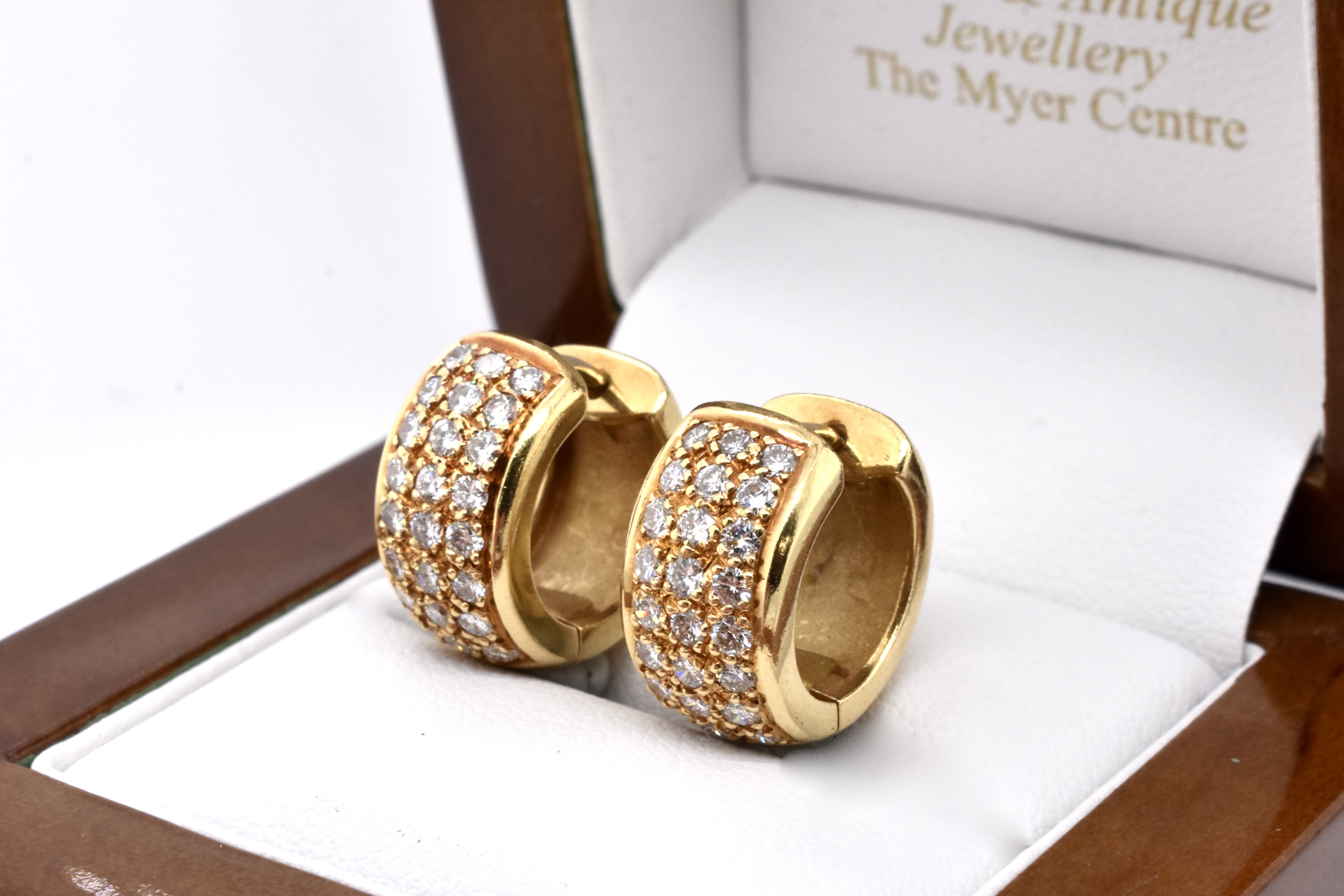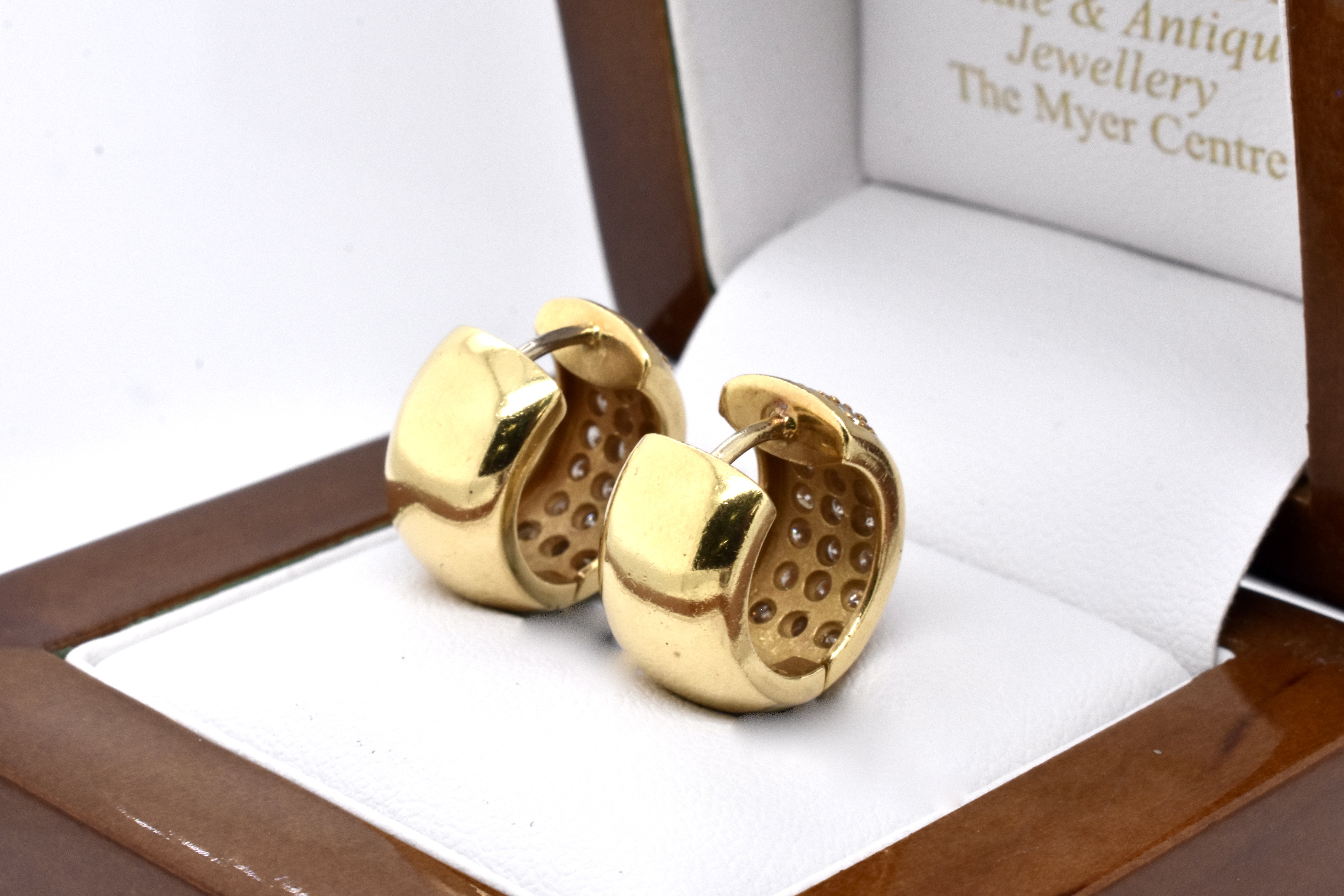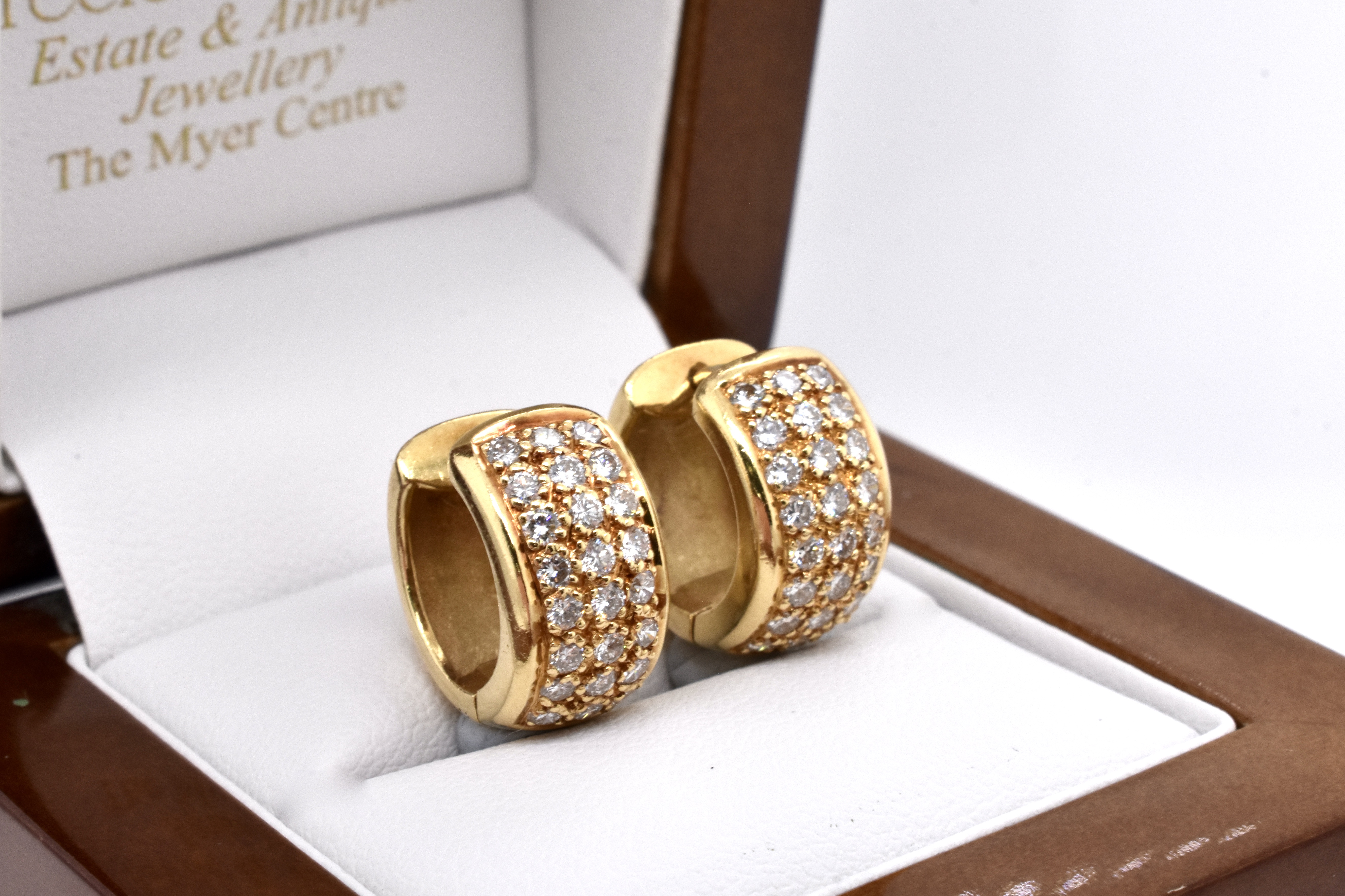 A sparkling pair of 18ct yellow gold wide huggies, with a total of 42 shimmering I/SI diamonds equalling 1.00ct grain set to the front half of the huggie with hinged post closures. Huggies measure 16mm in diameter and 8.25mm wide with a weight of 13.05 grams