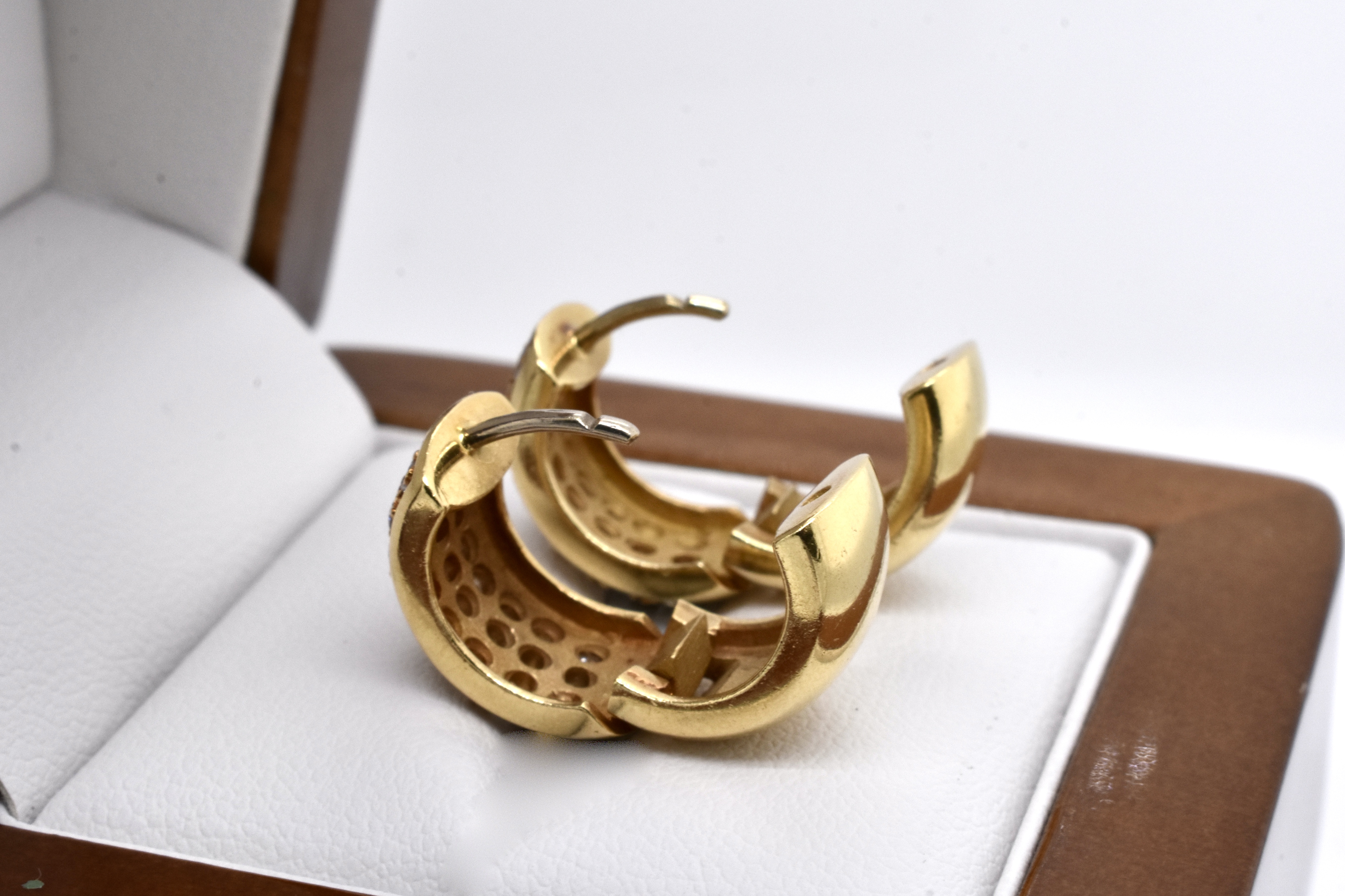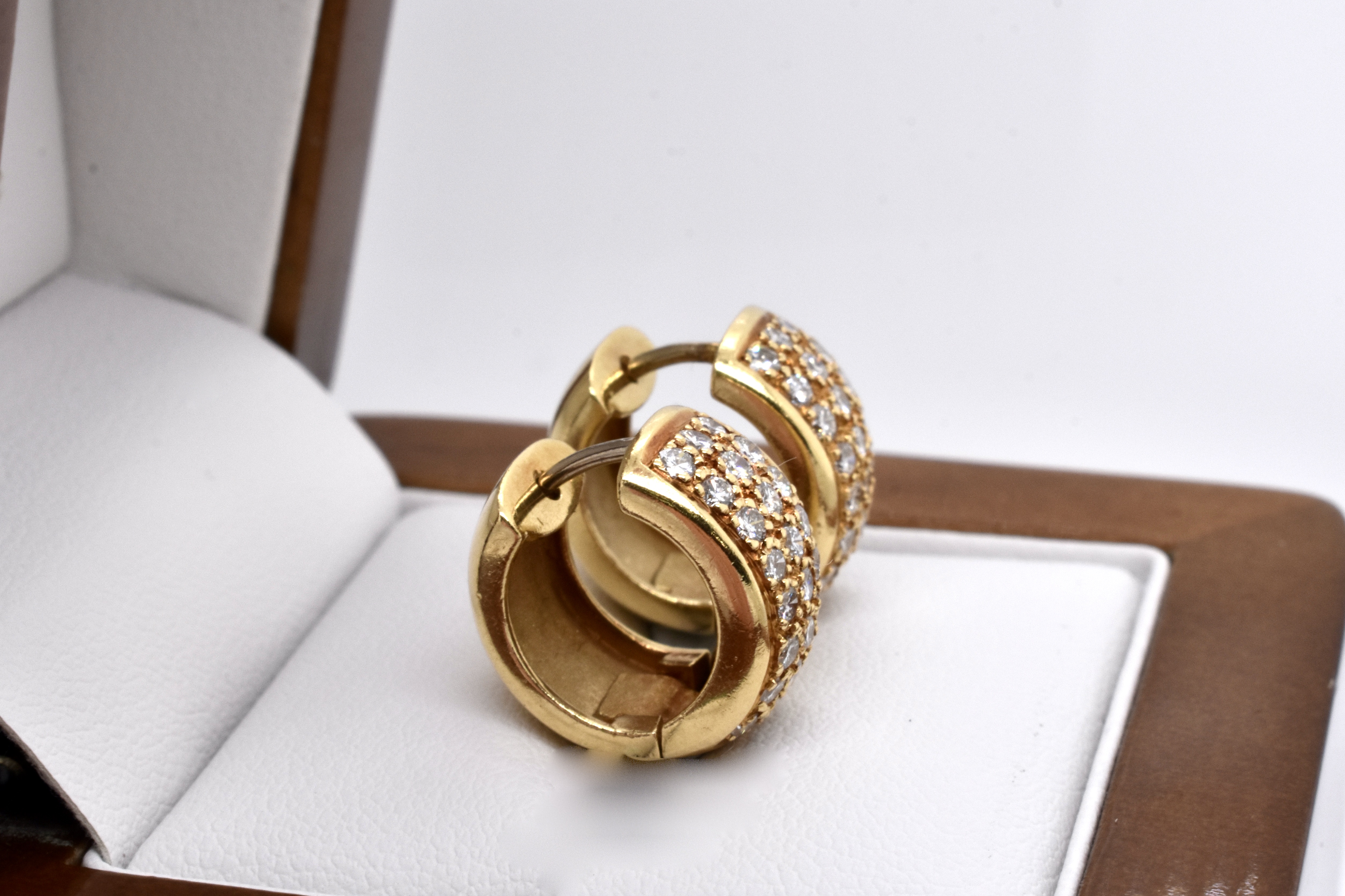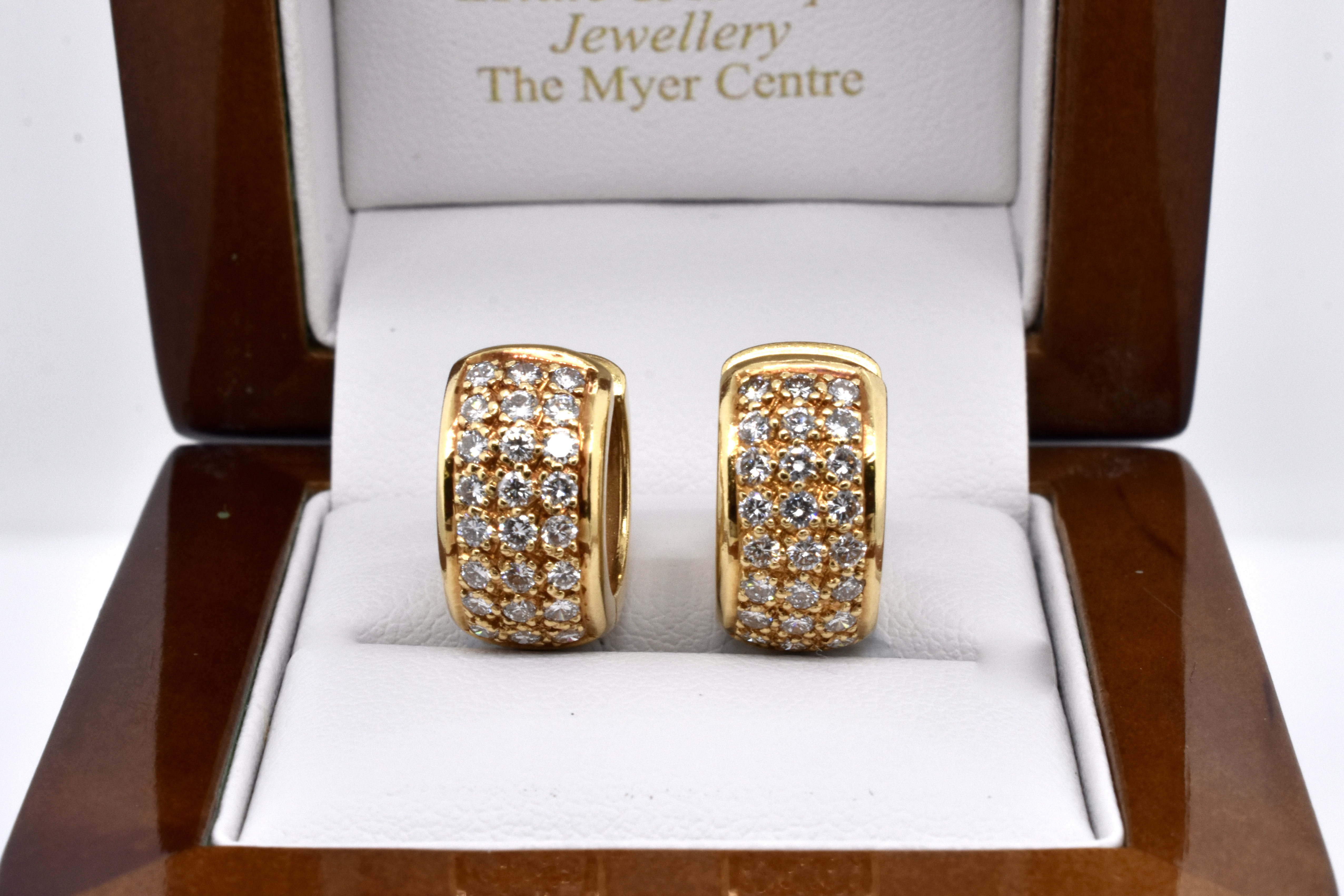 A sparkling pair of 18ct yellow gold wide huggies, with a total of 42 shimmering I/SI diamonds equalling 1.00ct grain set to the front half of the huggie with hinged post closures. Huggies measure 16mm in diameter and 8.25mm wide with a weight of 13.05 grams