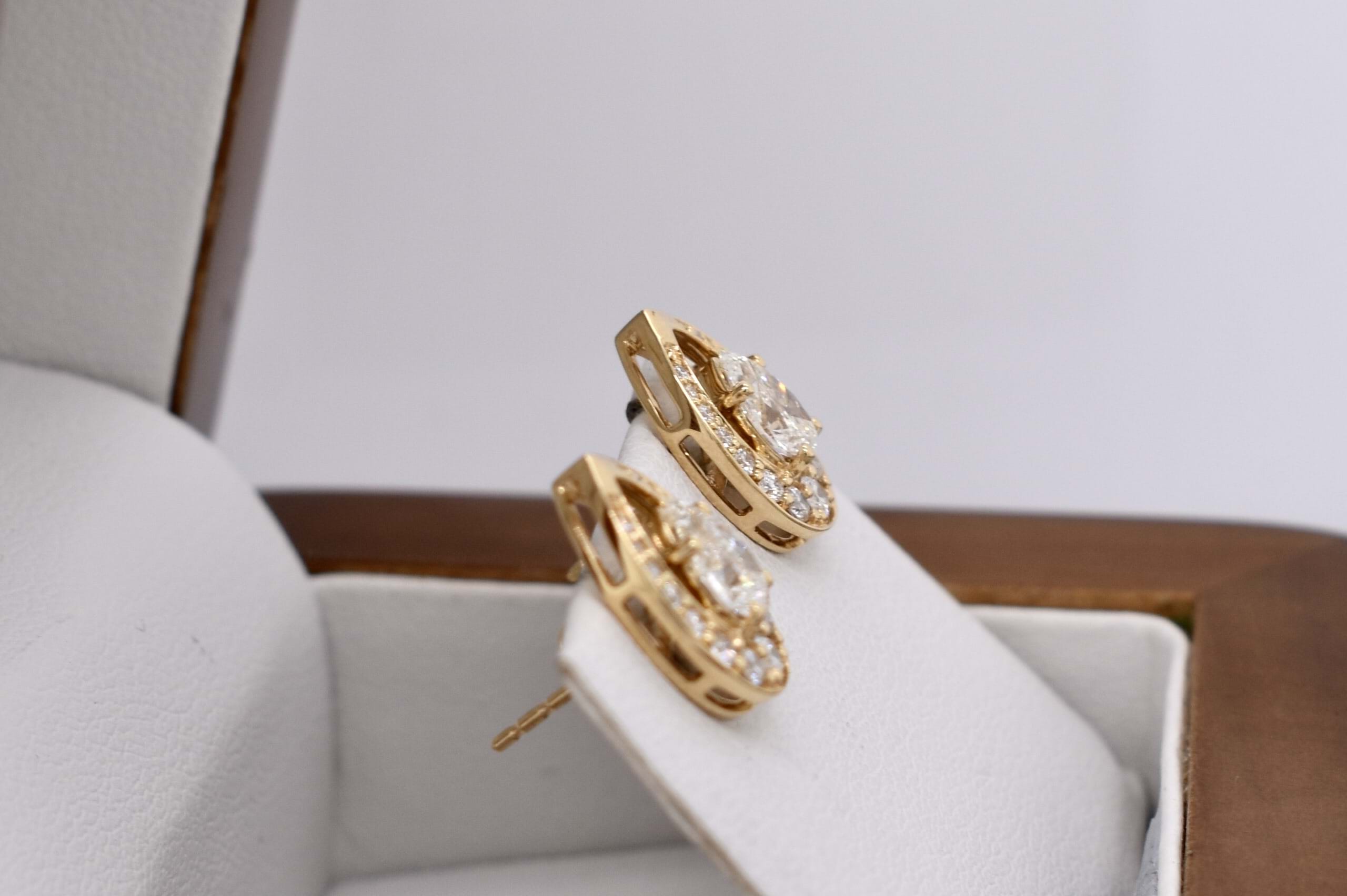 Beautiful and sparkly, these studs are crafted in 18ct yellow gold and feature two pear shaped diamonds in the centre, totalling 0.70ct G SI1. Followed by a grain set gapped pear shaped halo set with a further 30 round brilliant cut diamonds, equalling 0.31ct. Total diamond weight of 1.01ct G SI1. Completed with post and butterfly fittings. Independent Valuation available upon purchase.