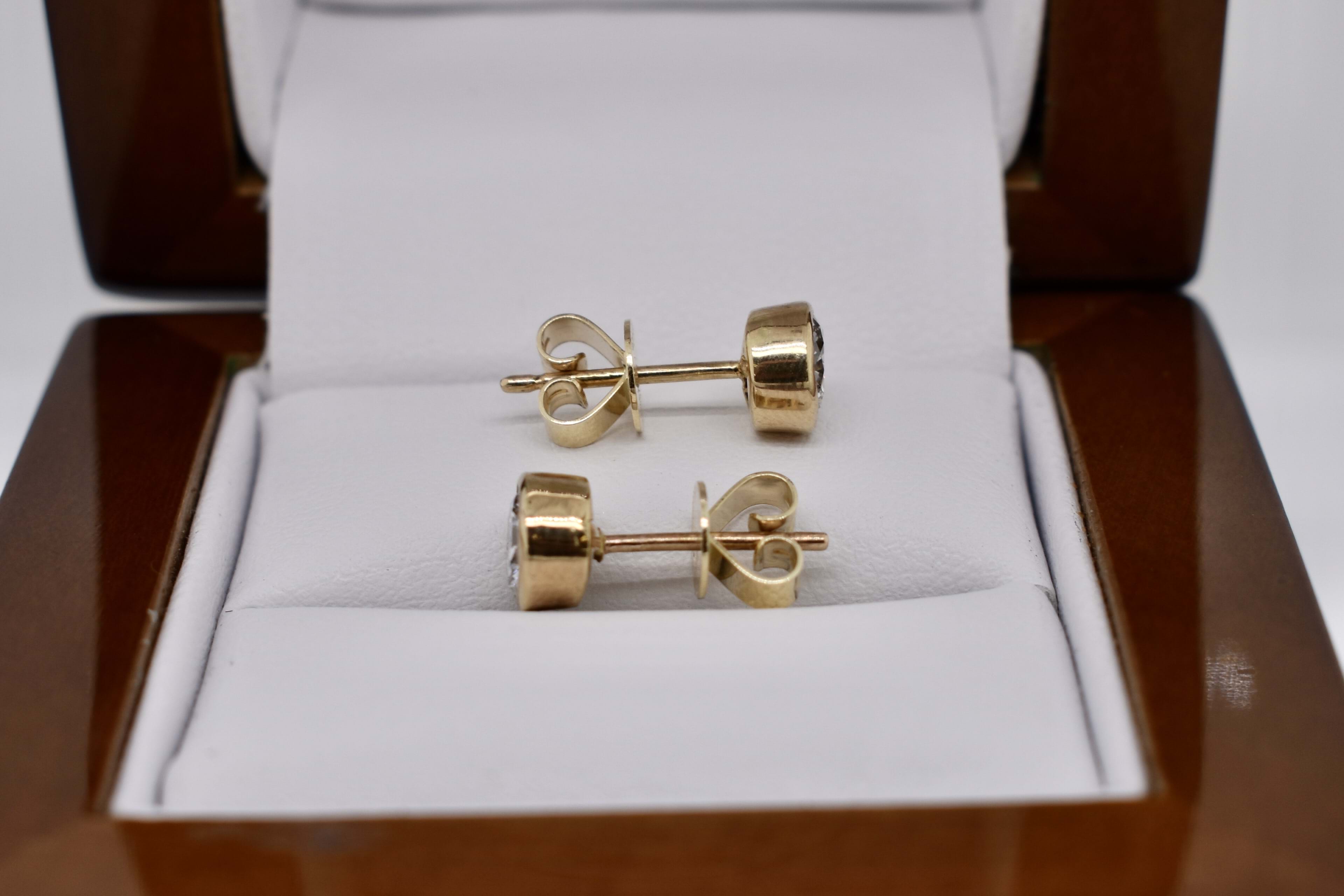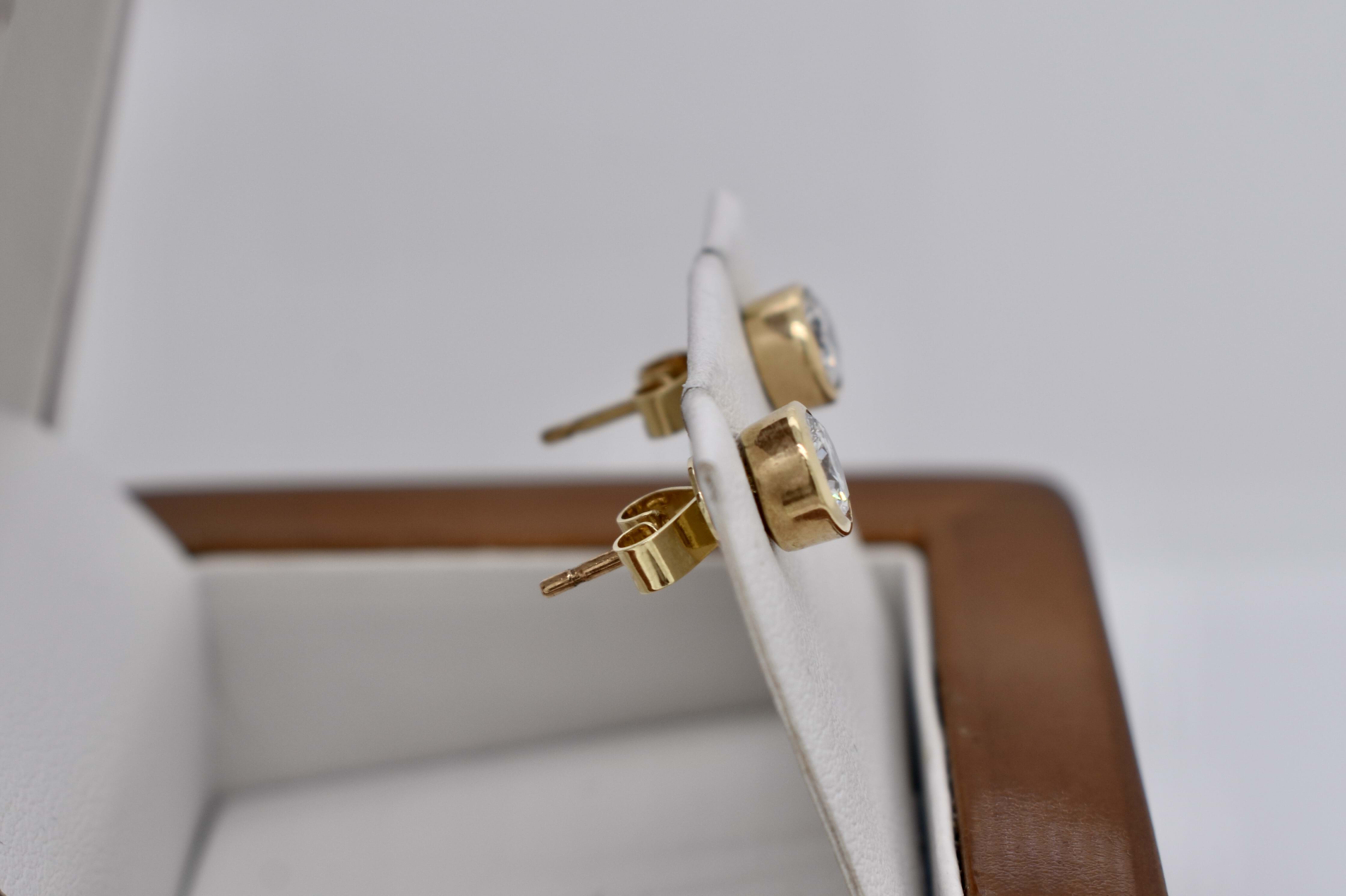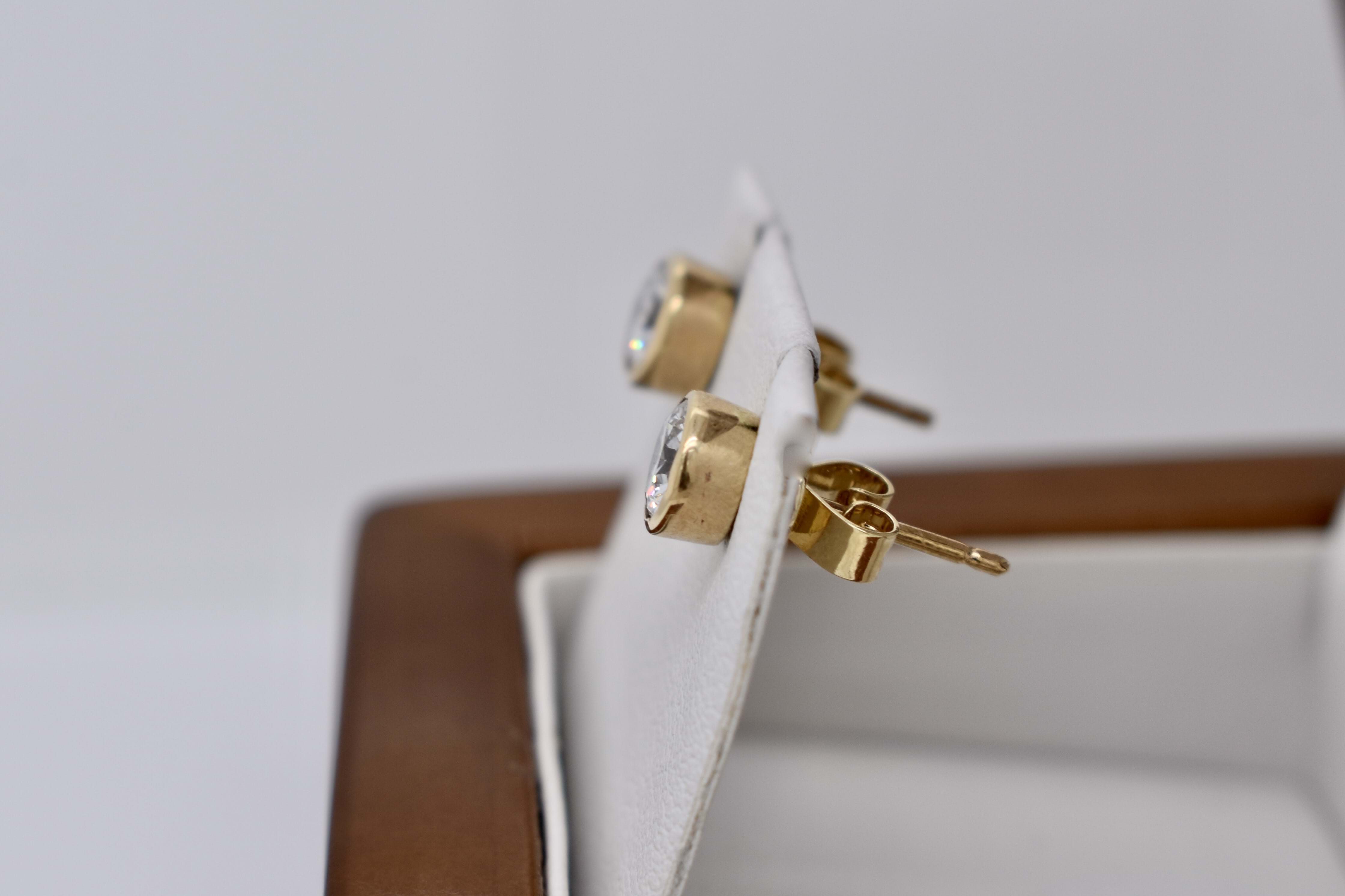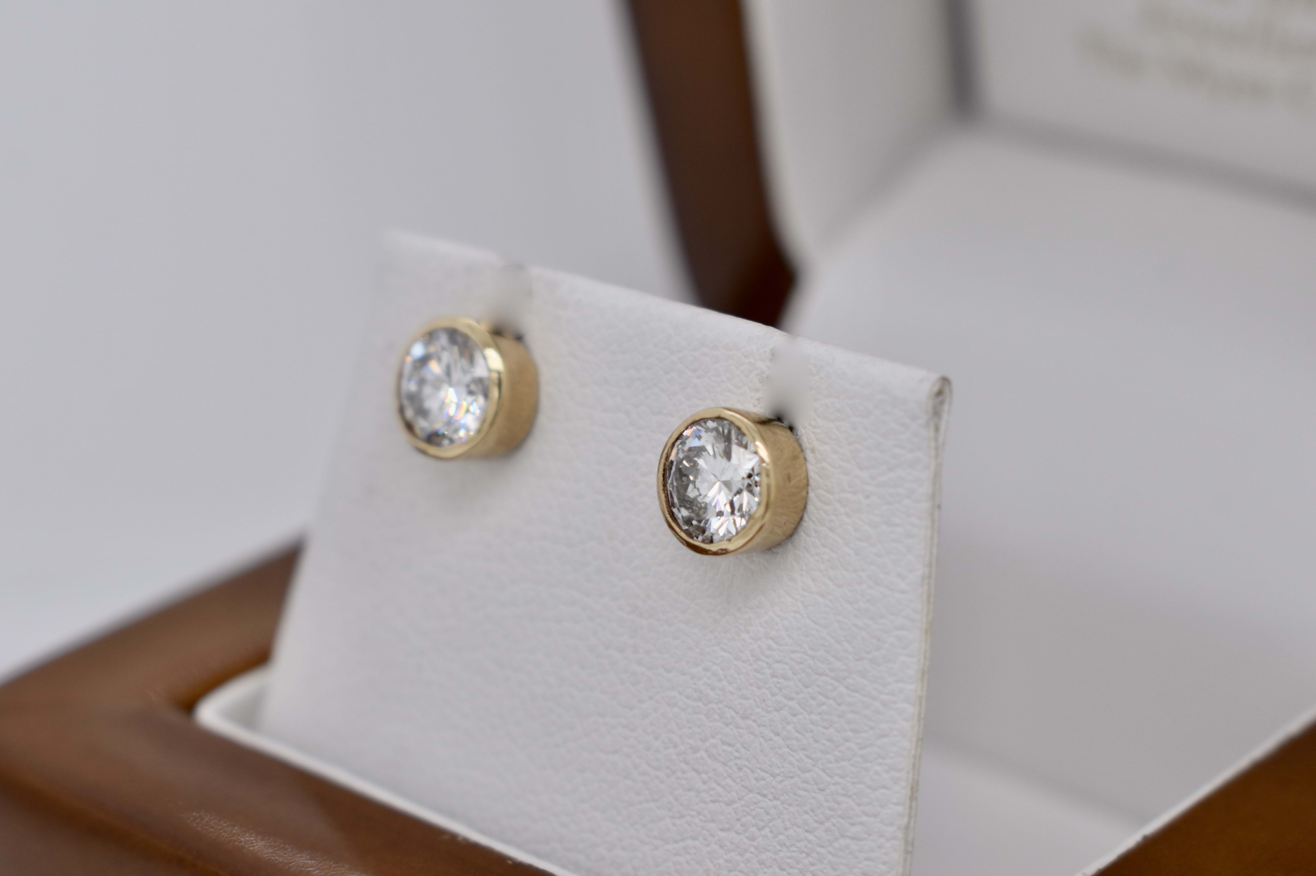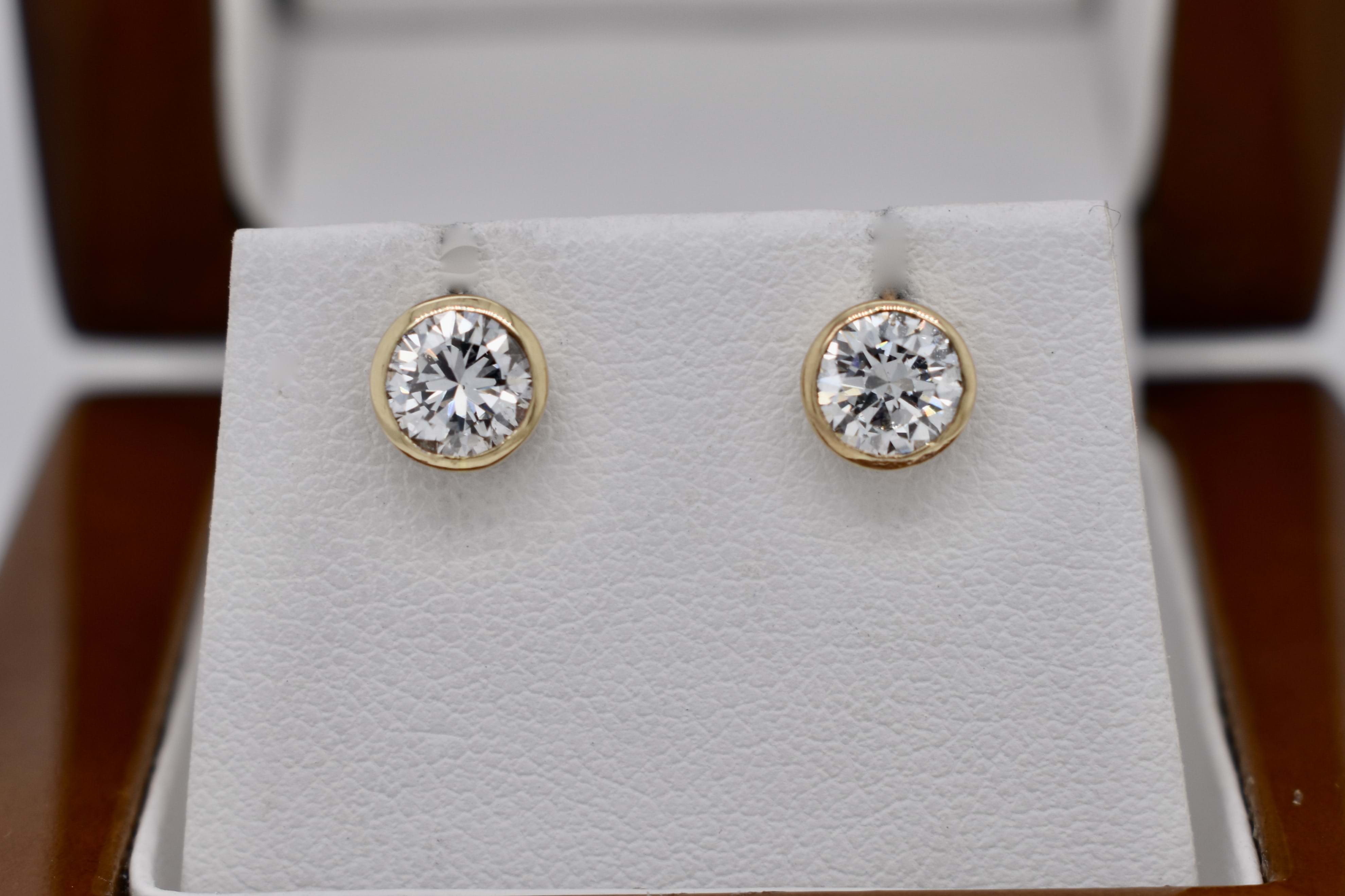 Classic and old school. Featuring two scintillating round brilliant cut diamonds totalling 1.20cts, GH colour and VS clarity, set into simple bezel set 9ct yellow gold stud earrings. Independent Valuation Supplied..