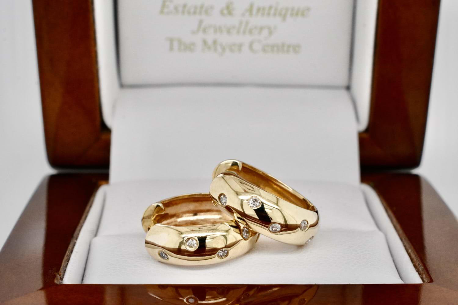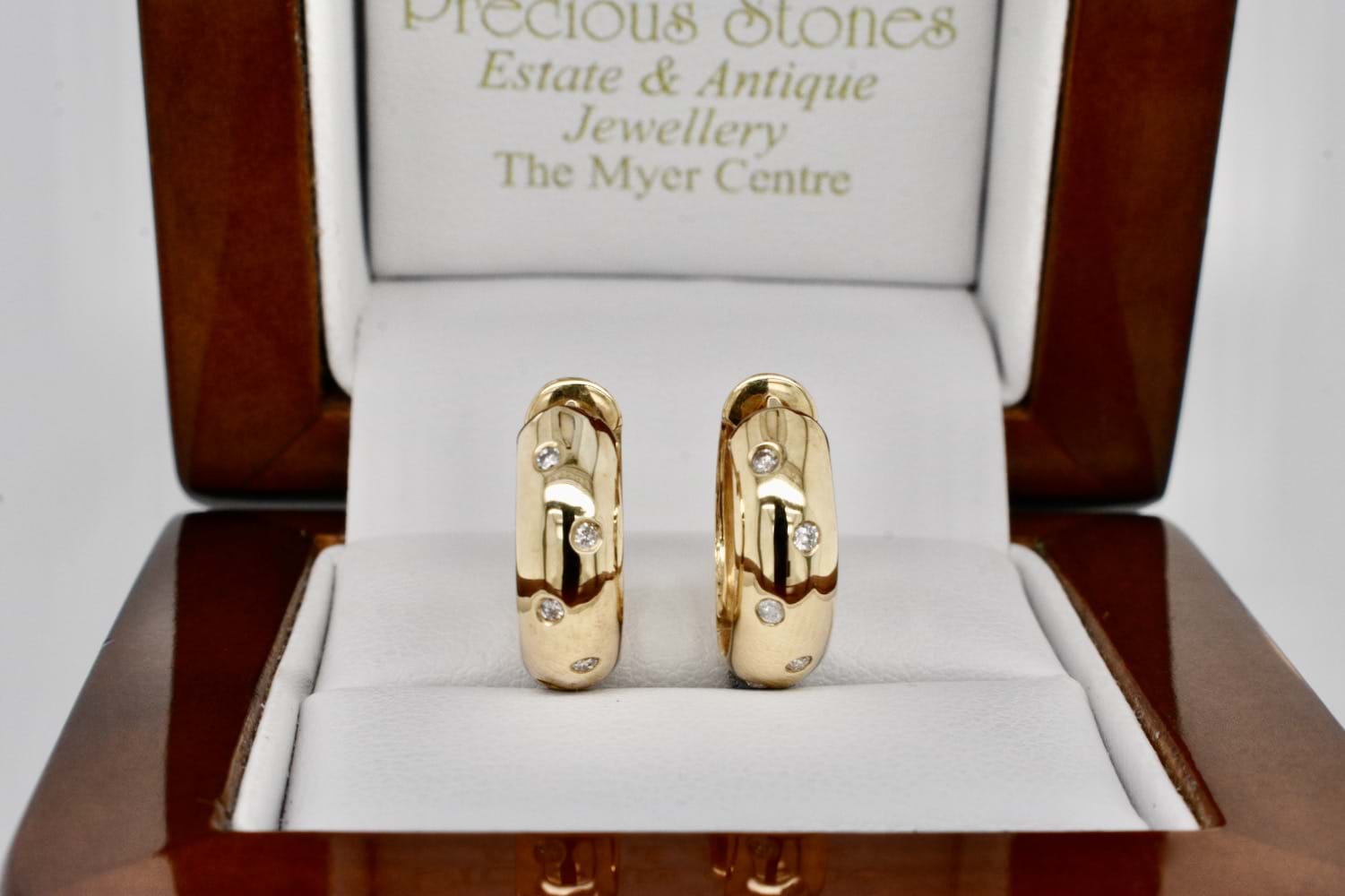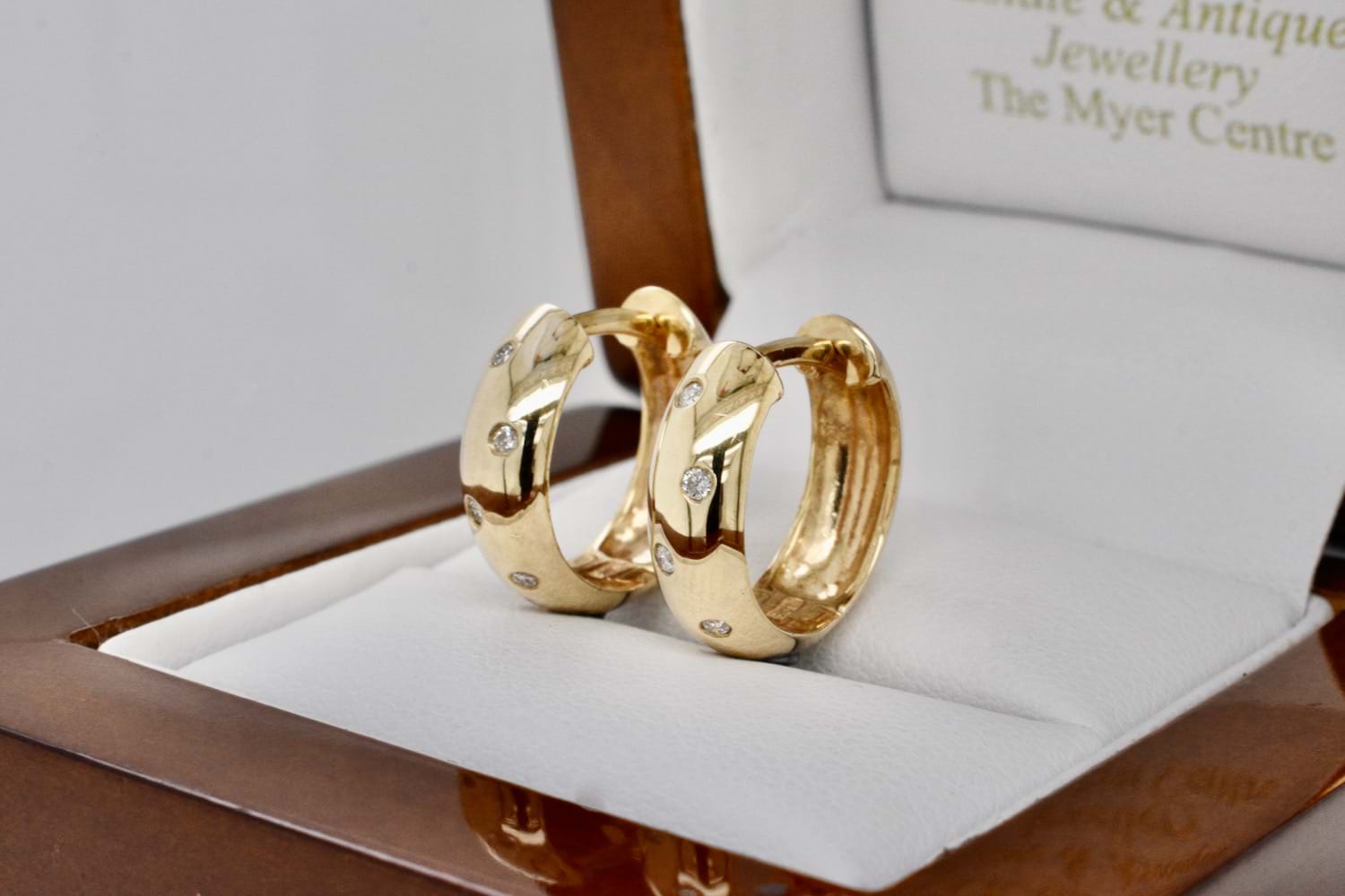 A classic and versatile pair of petite, round 9ct yellow gold domed huggies with scattered pressure set, sparkly white RBC diamonds. The huggies measure approx. 5.15mm wide and have a polished finish, which along with the diamonds gives them a lustrous overall look