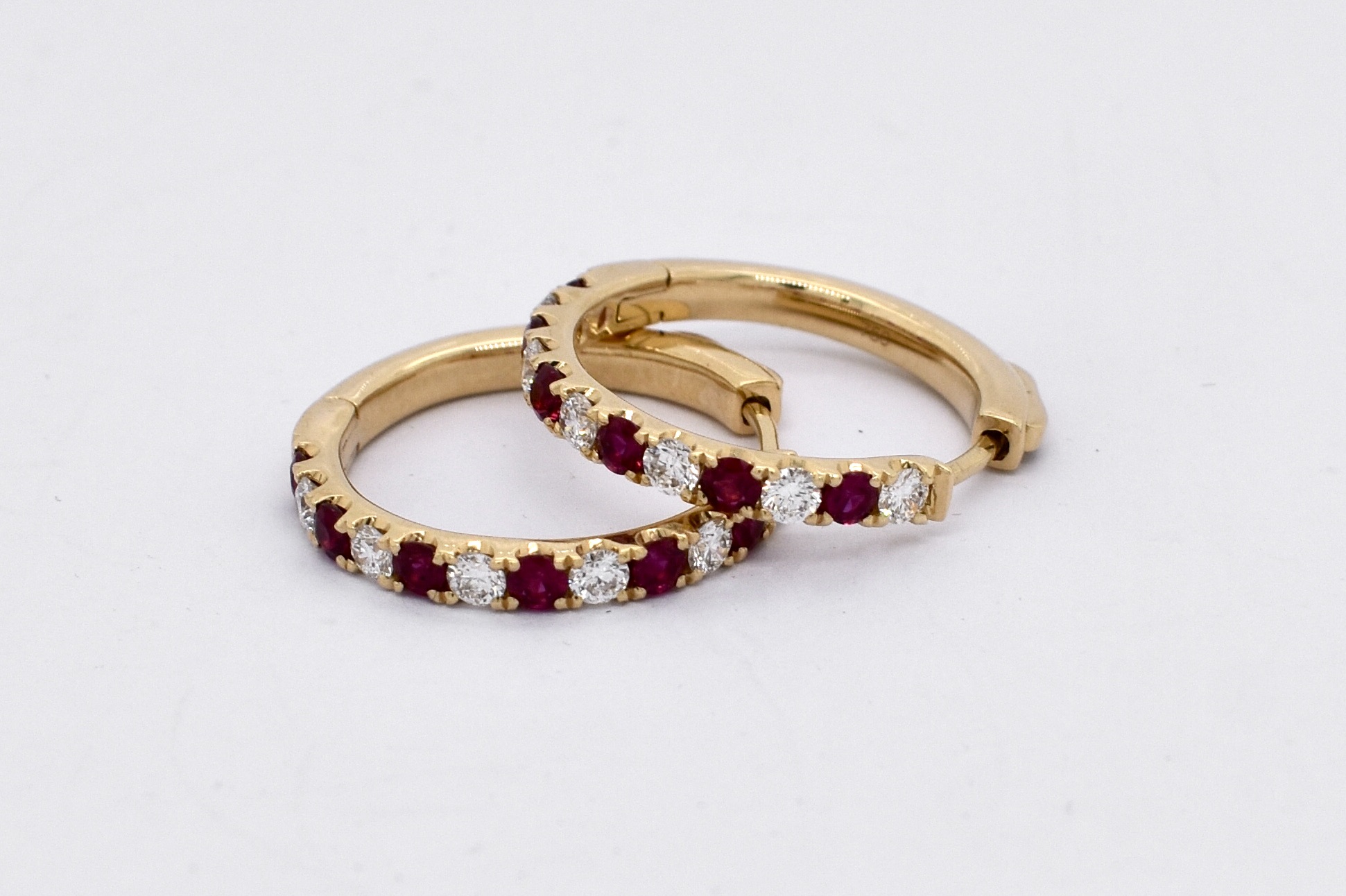 Sparkly and vibrant, these 18ct yellow gold huggies feature 12 round 2.1mm rubies totalling 0.71ct, alternating with 12 round brilliant cut 2.20mm diamonds totalling 0.57ct G VS, with push button clipped post closures. Independent Valuation Supplied