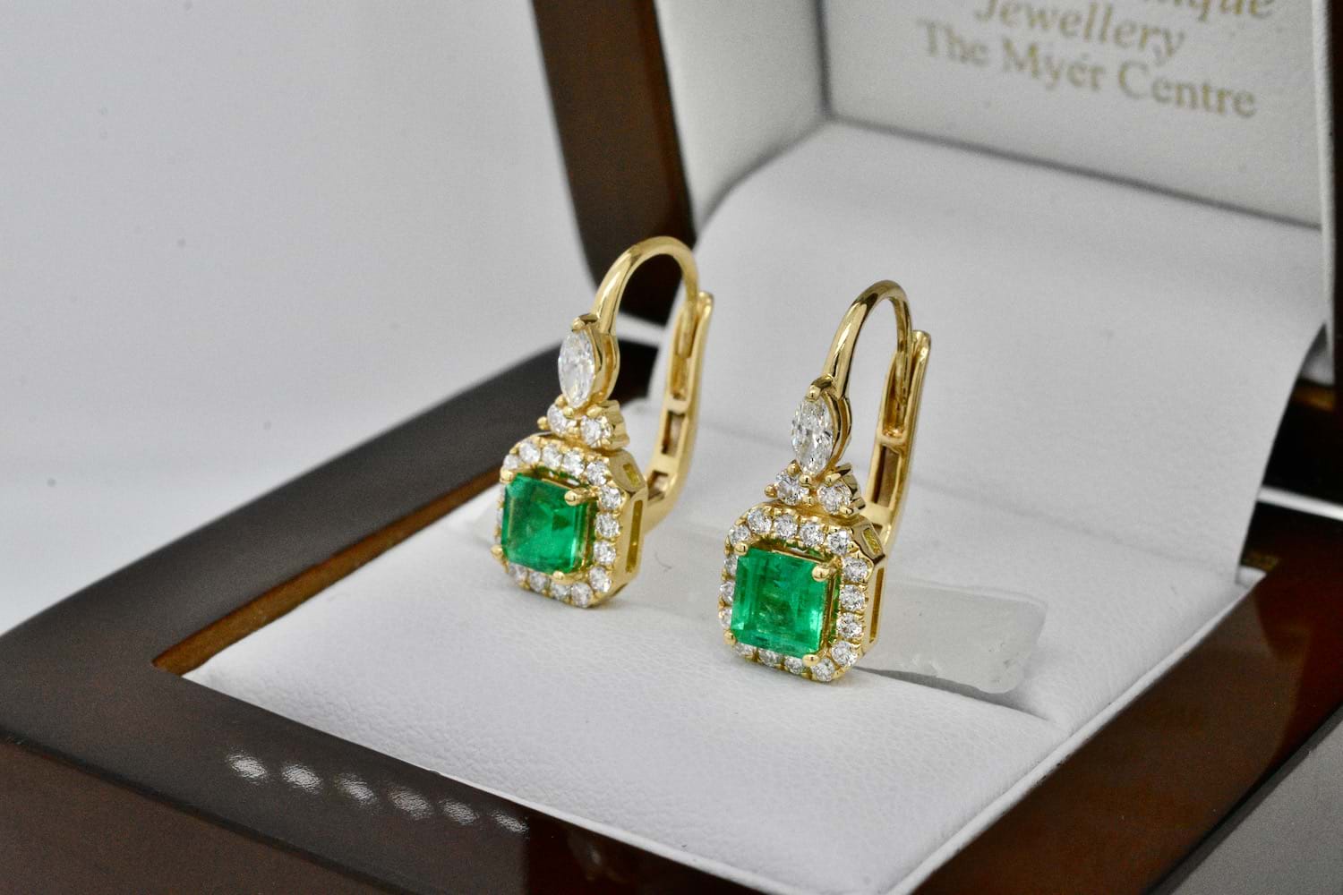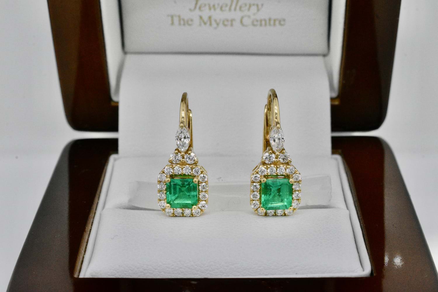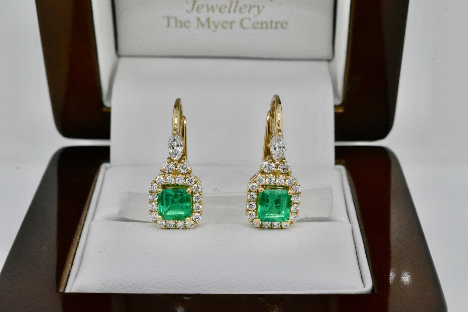 This gorgeous pair of 18ct yellow gold earrings were designed specifically to showcase this spectacular pair of Colombian emeralds. The two emeralds are a bright, mid green and total 0.97cts. Each emerald is set into four claws surrounded by a halo of sparkling round brilliant cut diamonds and suspended from European hinged hook fittings with a marquise diamond and two round brilliant cut diamonds as a feature motif. Total diamond content equals 0.58cts GVS. Independent Valuation Supplied