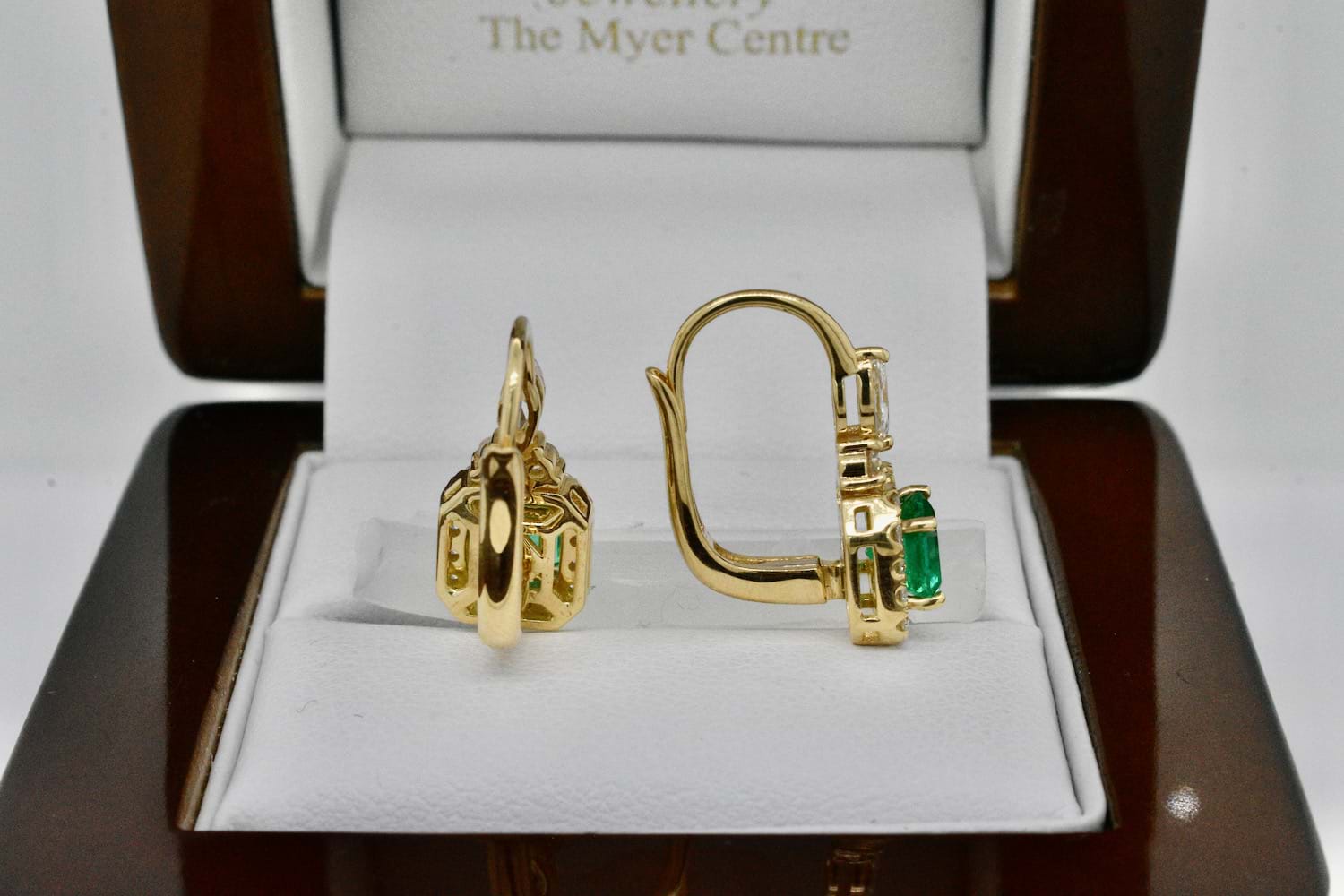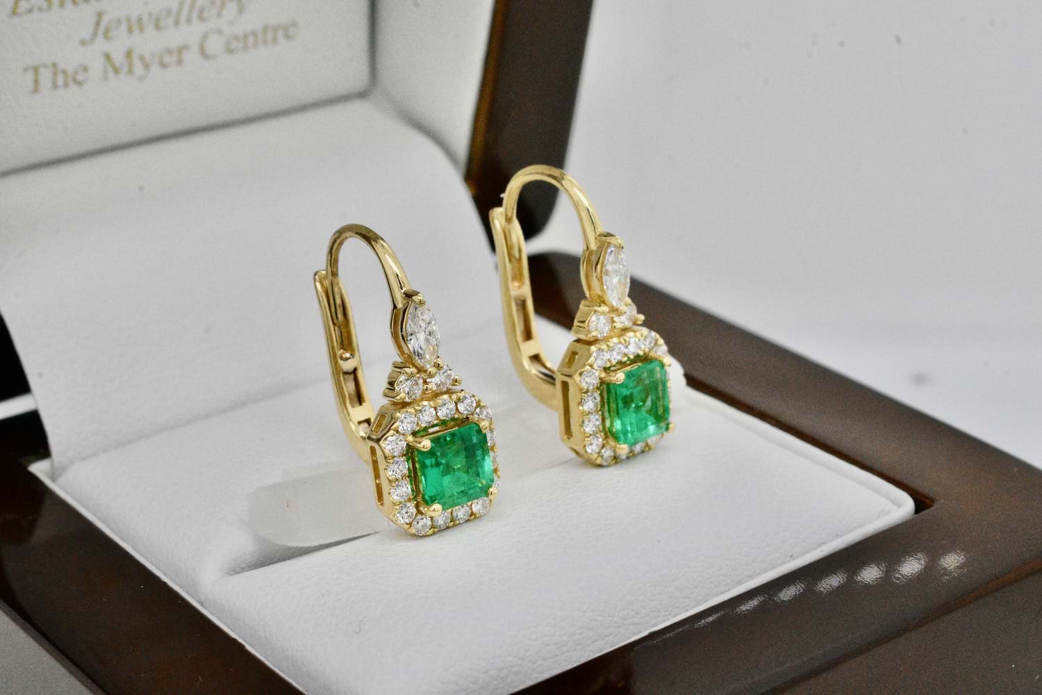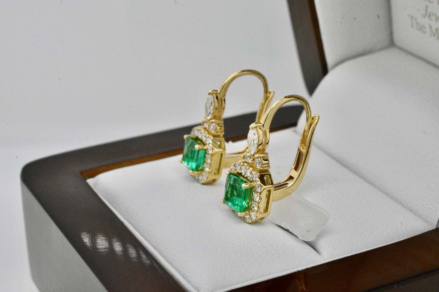 This gorgeous pair of 18ct yellow gold earrings were designed specifically to showcase this spectacular pair of Colombian emeralds. The two emeralds are a bright, mid green and total 0.97cts. Each emerald is set into four claws surrounded by a halo of sparkling round brilliant cut diamonds and suspended from European hinged hook fittings with a marquise diamond and two round brilliant cut diamonds as a feature motif. Total diamond content equals 0.58cts GVS. Independent Valuation Supplied