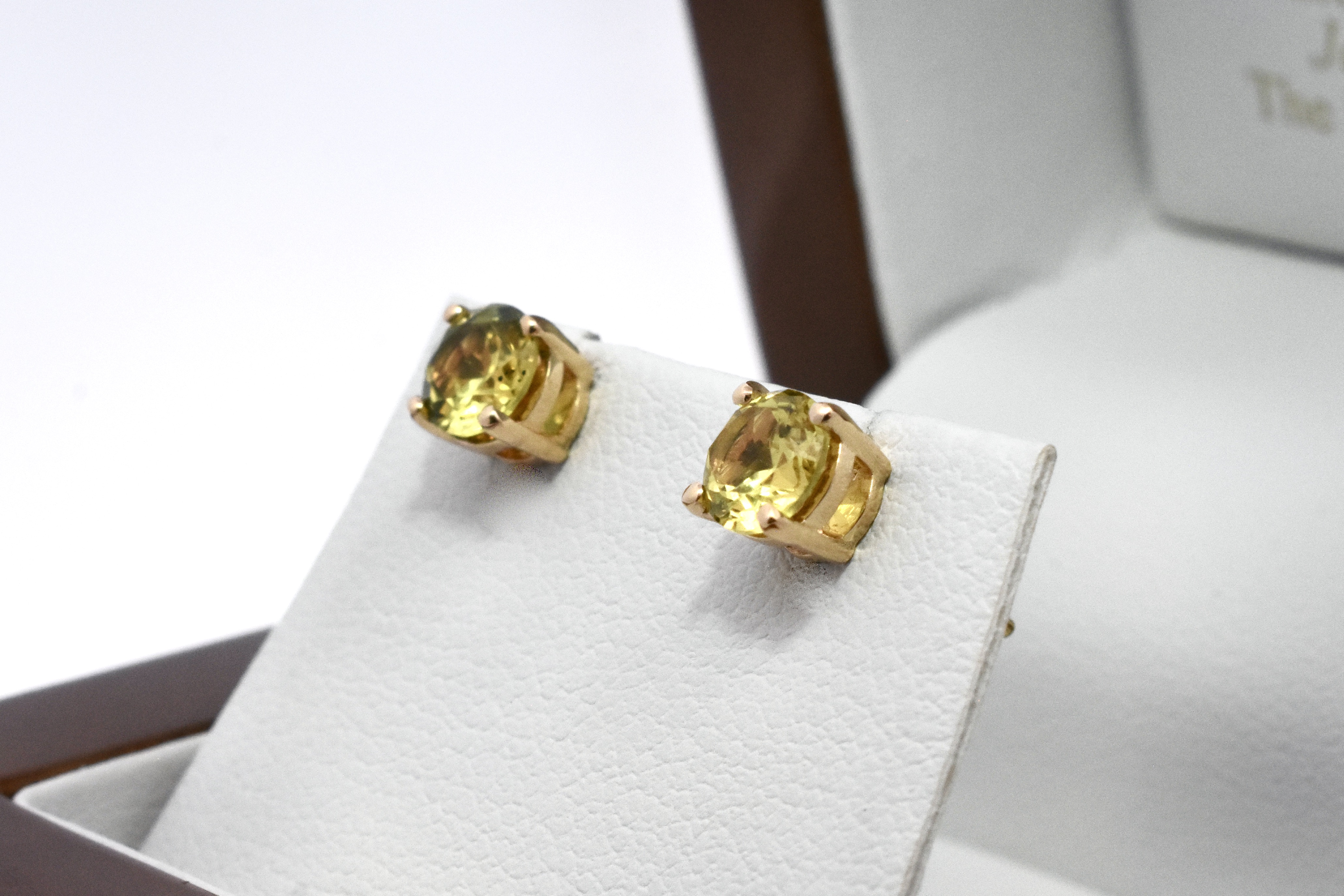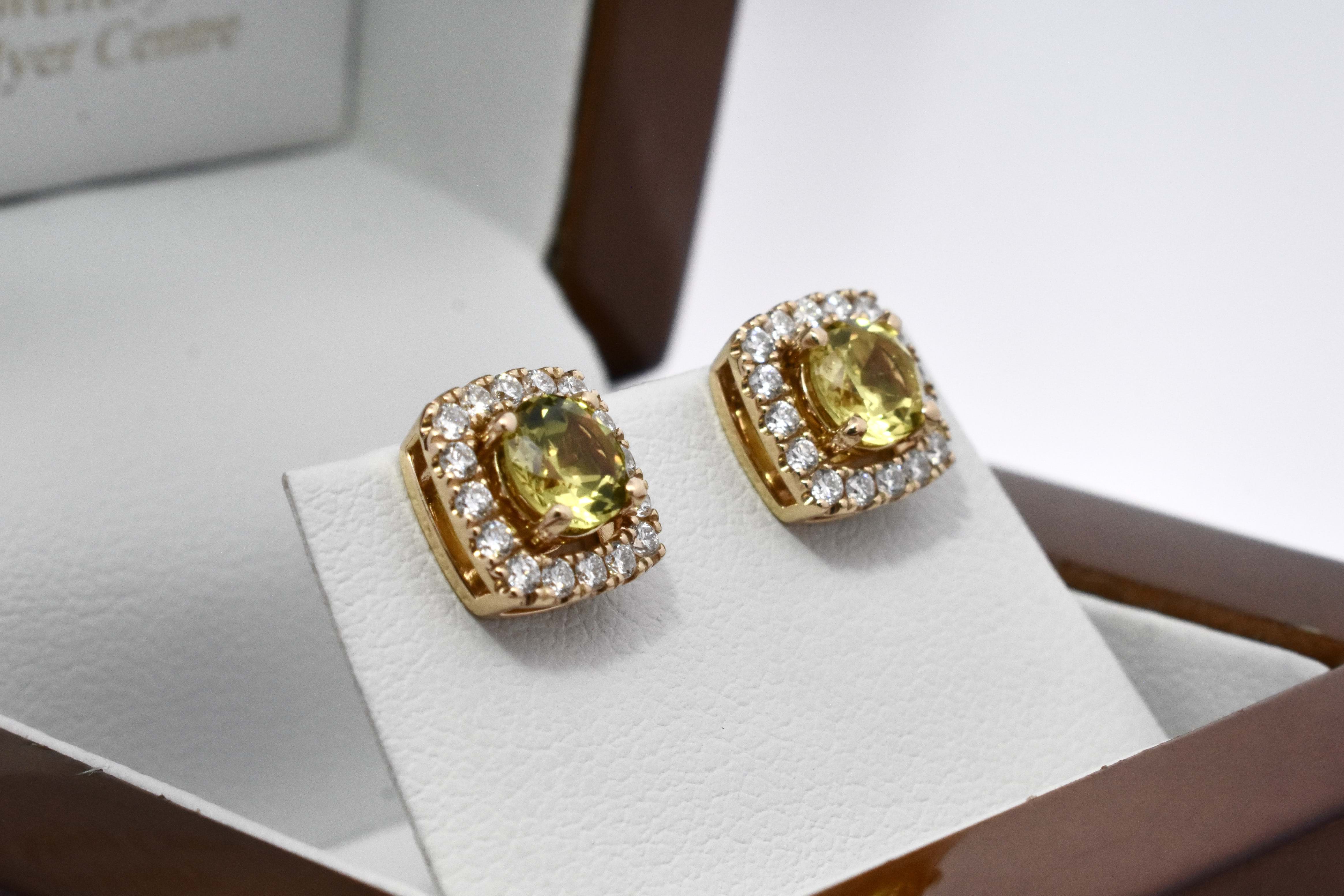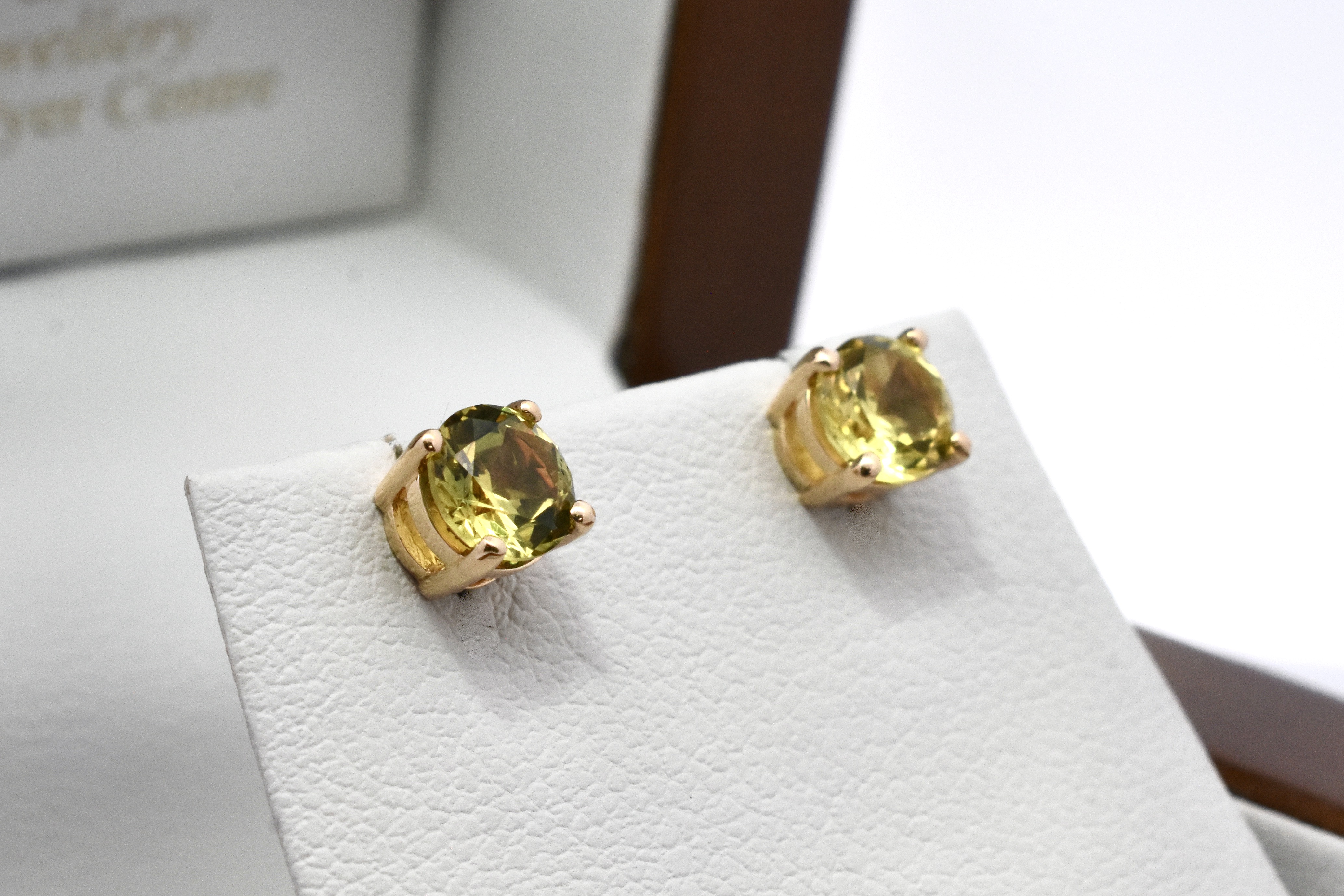 This stunning and sparkly pair of studs is crafted in 18ct yellow gold with two centre round bright mid yellow Australian sapphires, with post and butterfly fittings. Total of two sapphires equalling 1.37ct. Look amazing worn alone or add some sparkle with jackets. Pictured with 20349806 available for separate purchase. Independent Valuation Supplied.