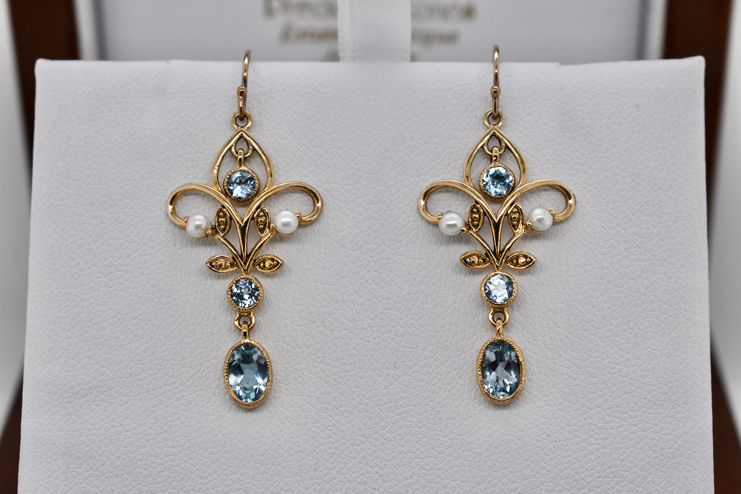 An Edwardian inspired pair of 9ct yellow gold drop earrings featuring blue topaz and seed pearls