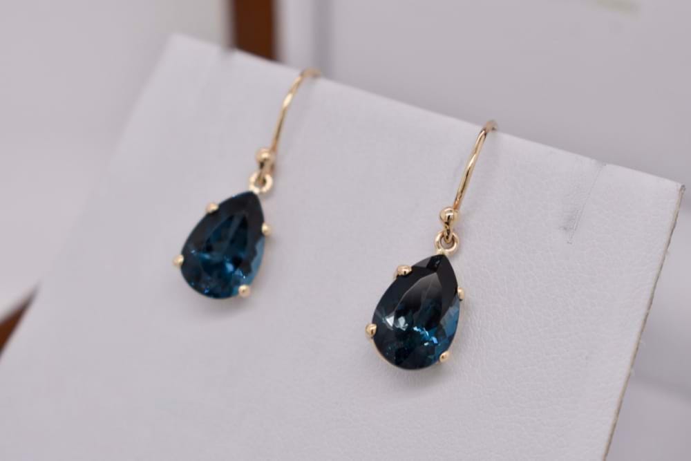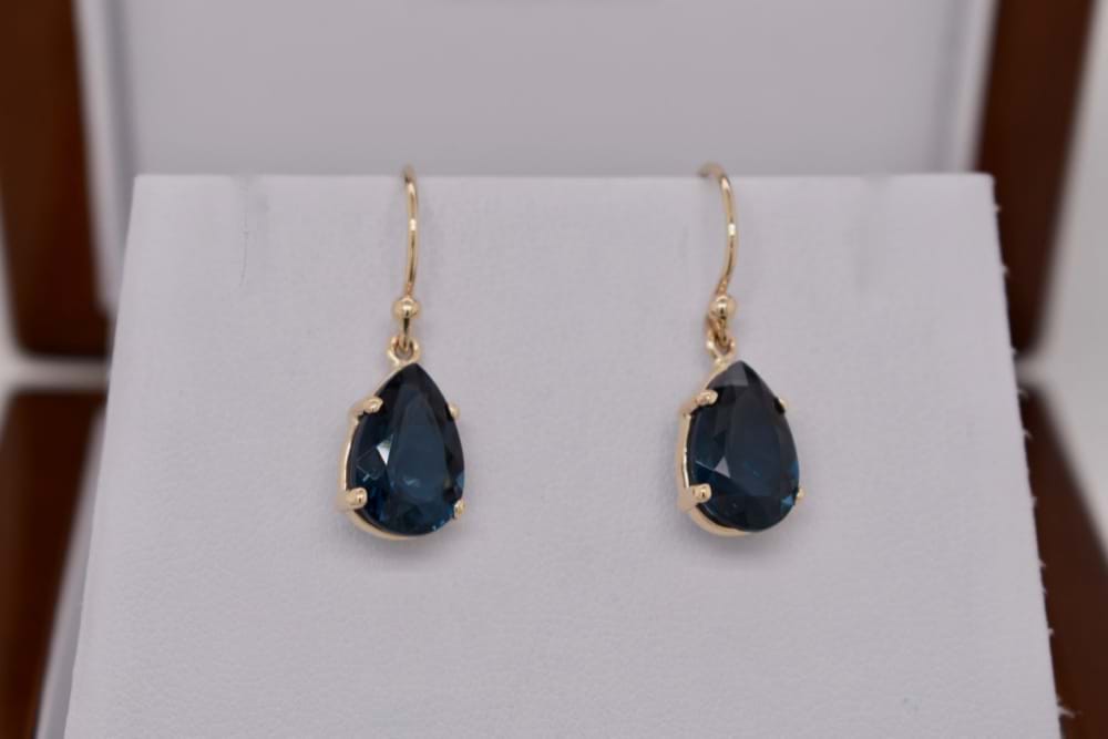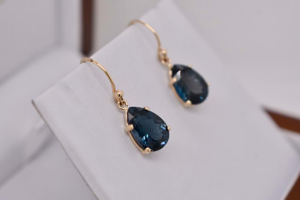 Hand crafted 9ct yellow gold shepherd hook drop earrings each containing a pear shape 12x8mm London Blue Topaz