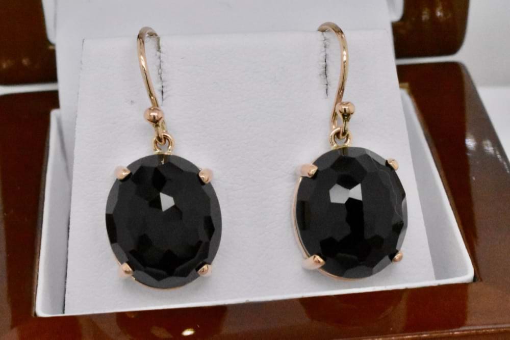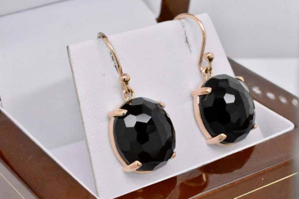 These fabulous checkerboard cut black onyx domes measure 13mm round and are set into simple and complimenting 9ct yellow gold handmade settings and suspended from shepherd hook fittings