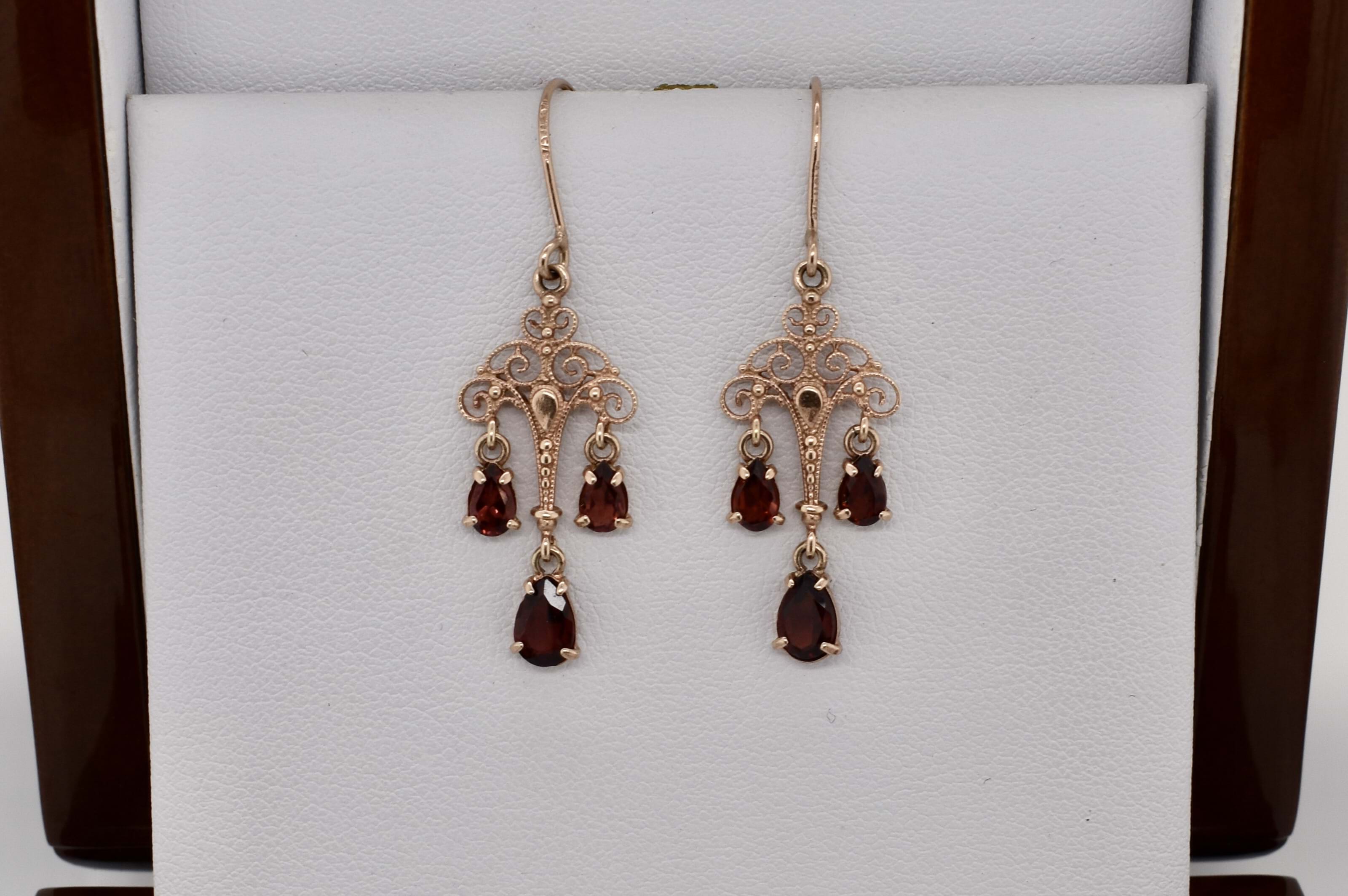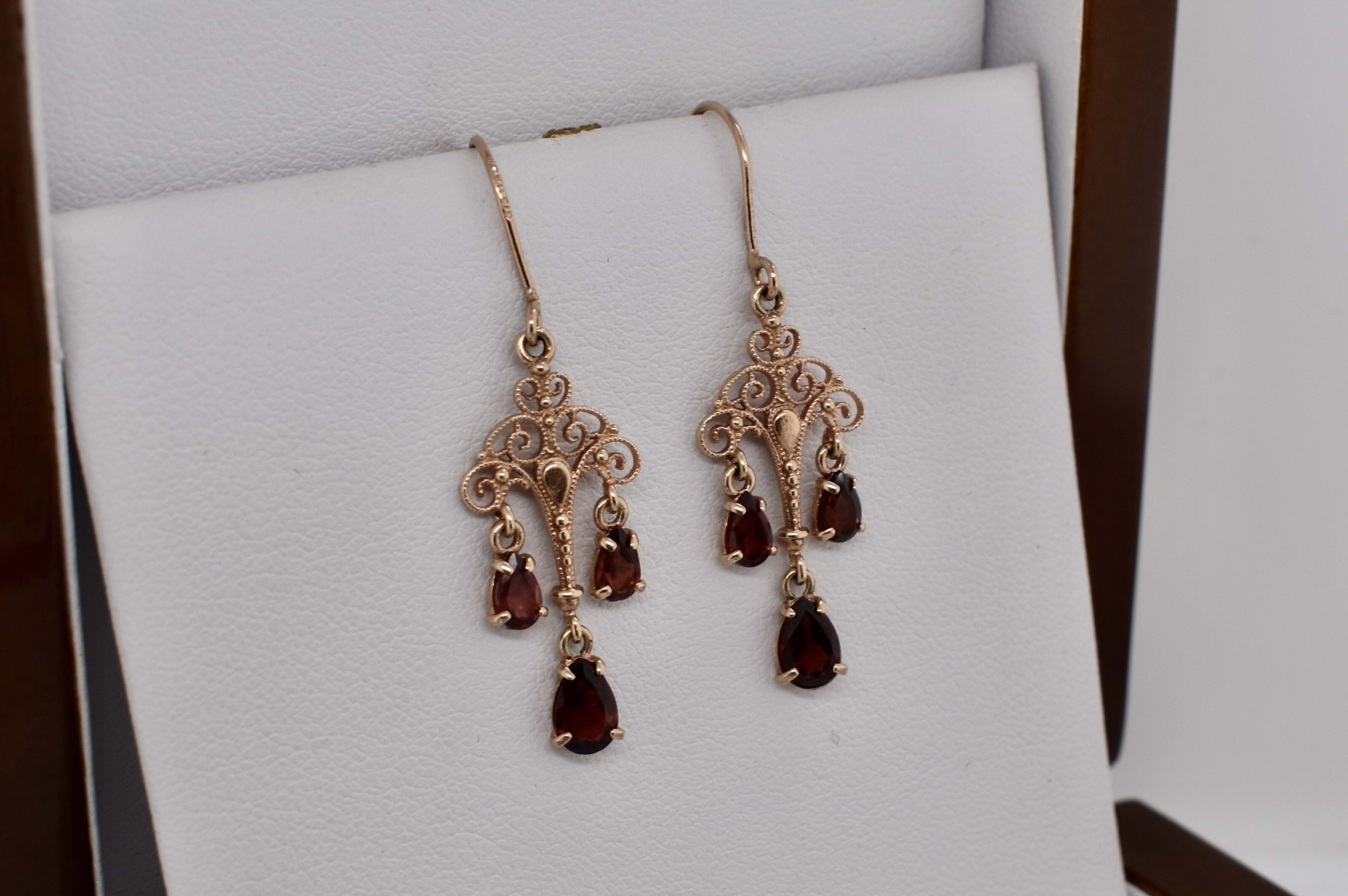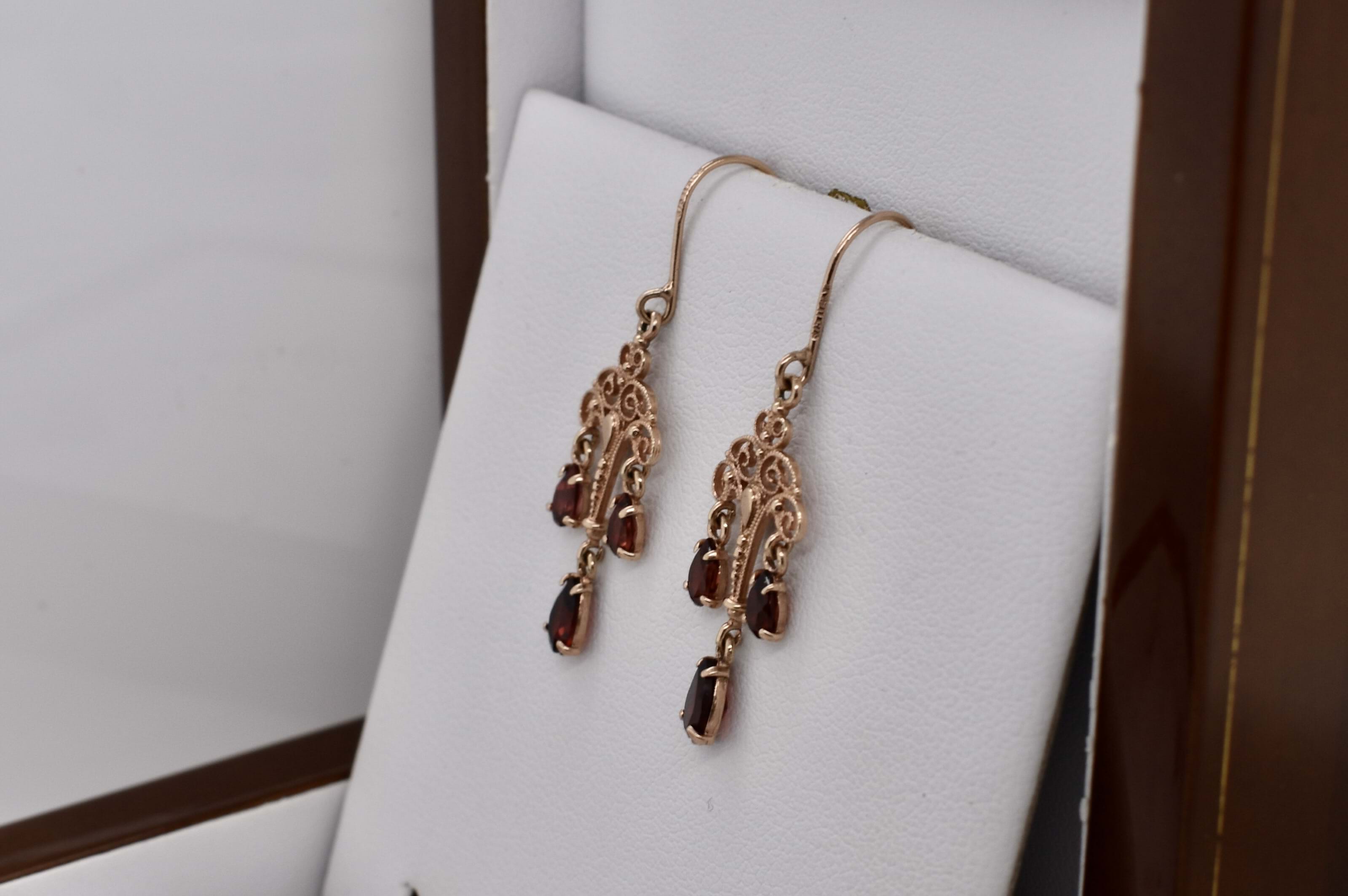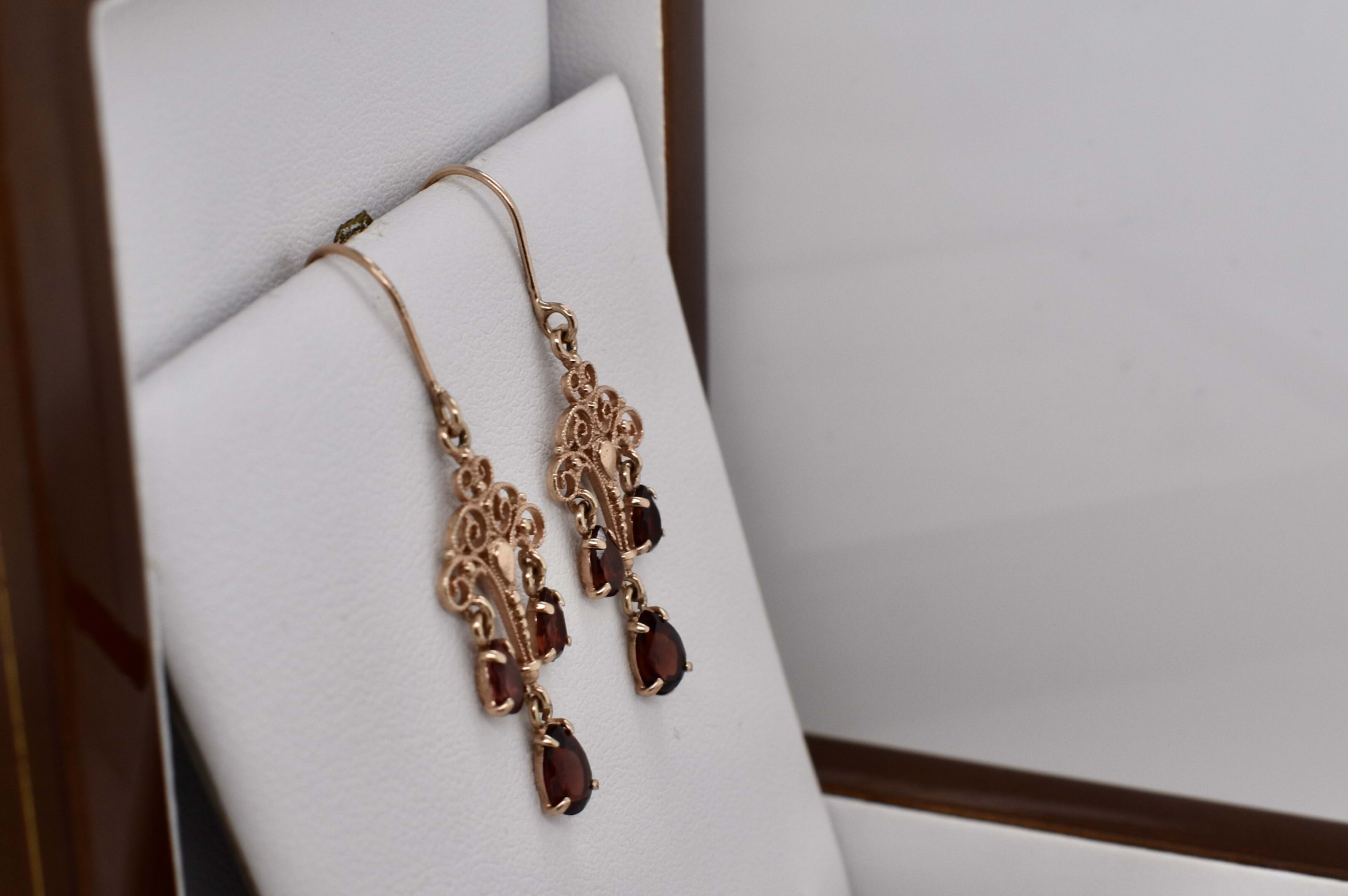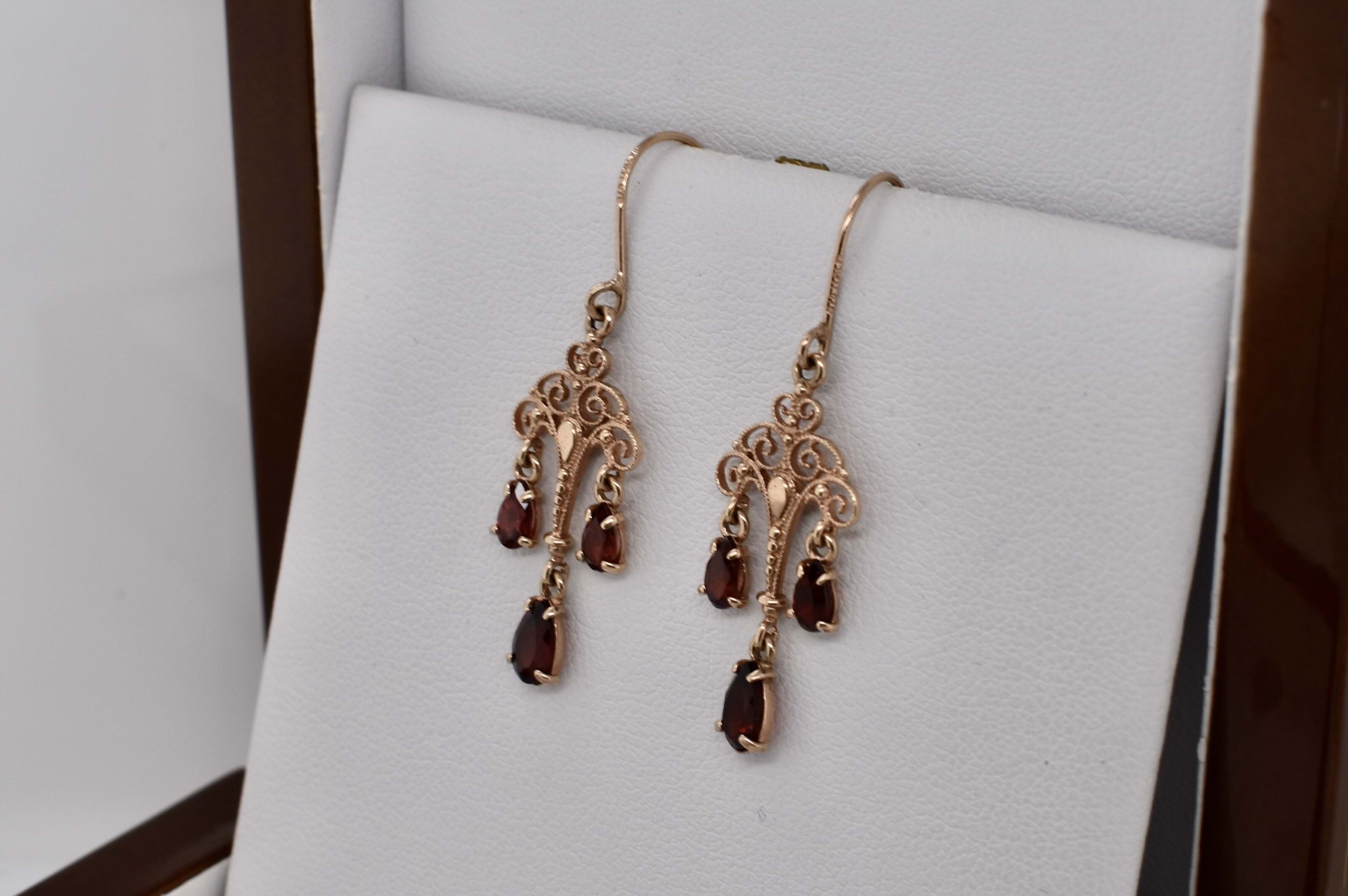 SOLD 9ct Rose Gold Garnet & Filigree Antique Styled Drops