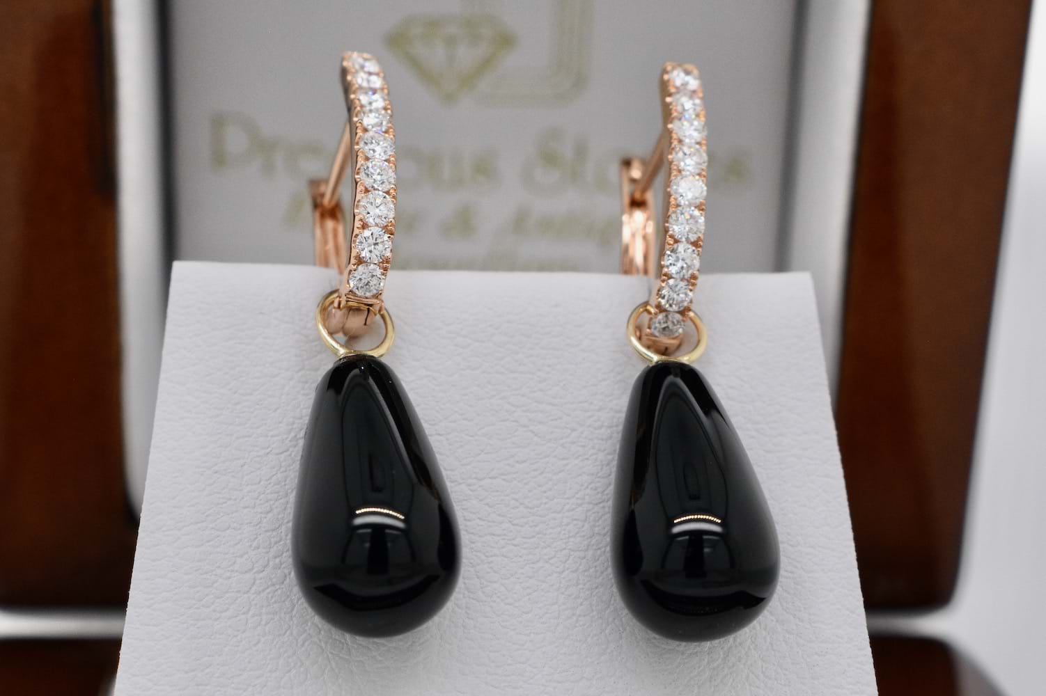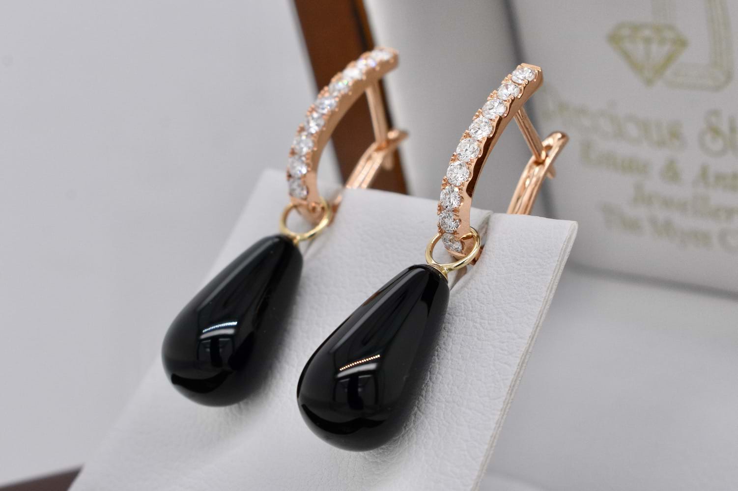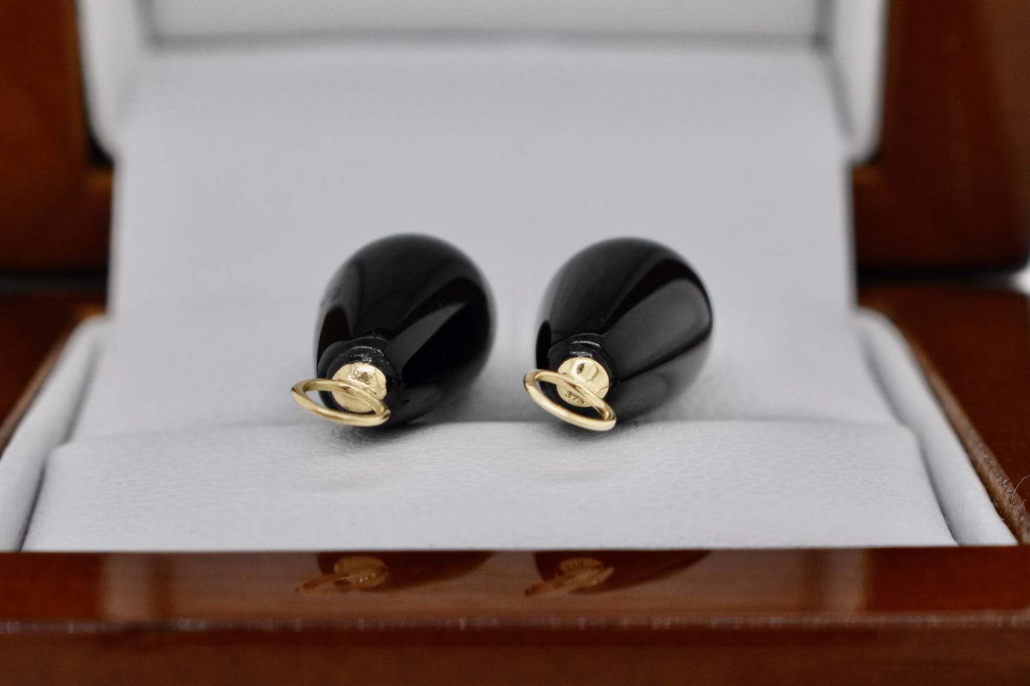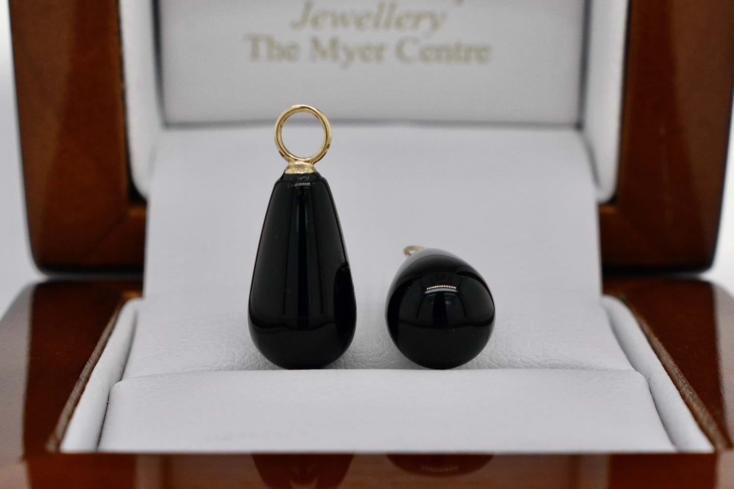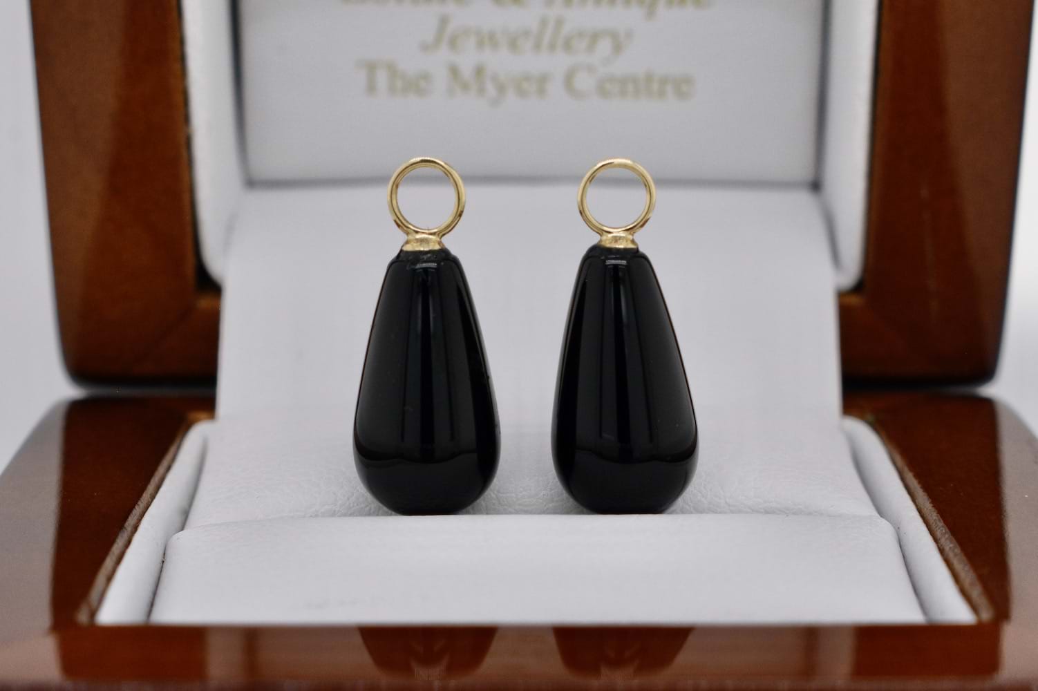 Polished elongated teardrop black onyx beads measuring 15x8mm set with a simple 9ct yellow gold loop intended to suspend from diamond huggies, bring in your huggies to see if they fit or see our range of diamond huggies available in store! Diamond huggies pictured are available for separate purchase.