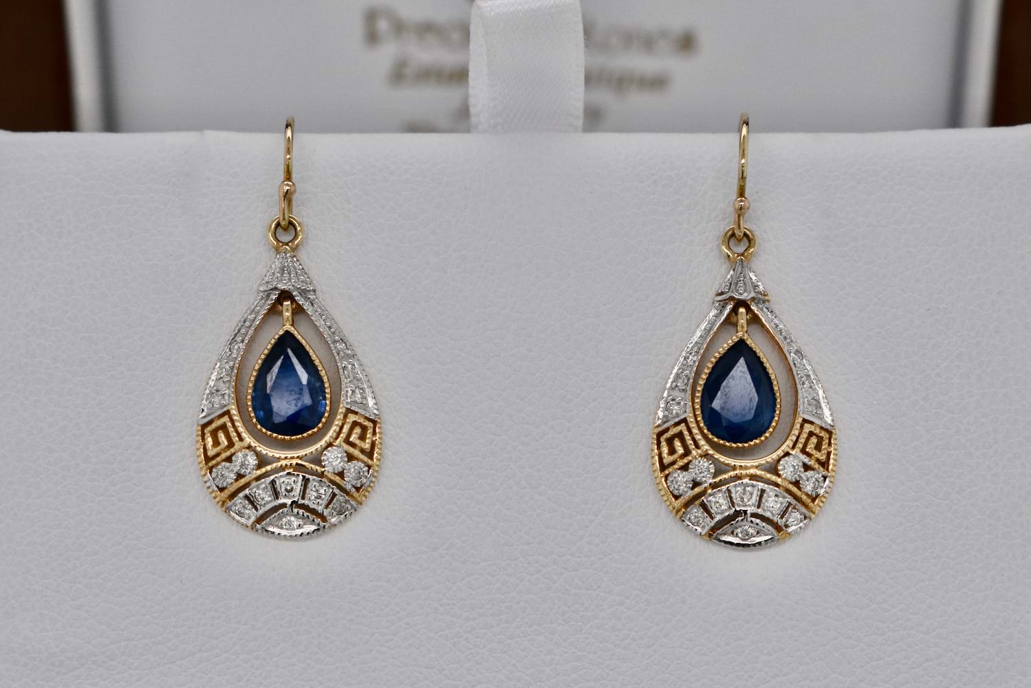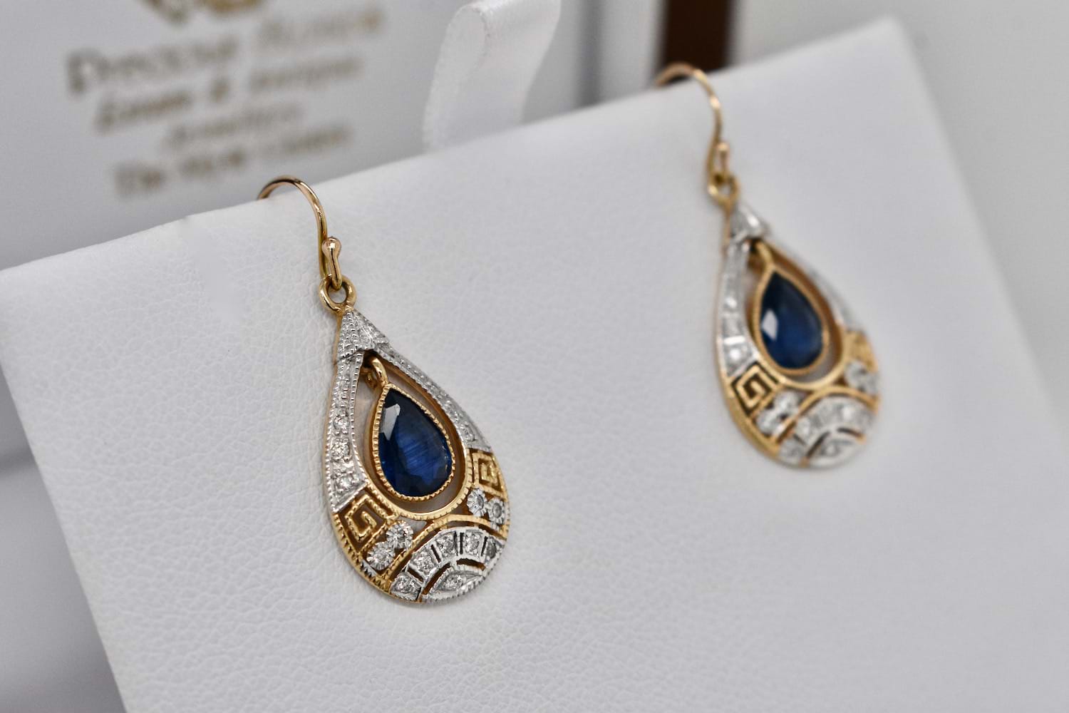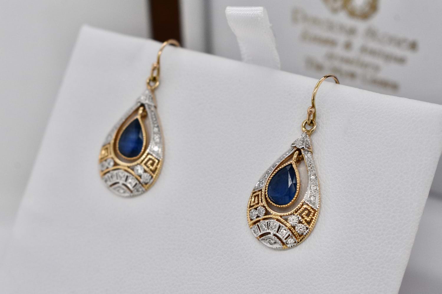 Stunning and feminine drop earrings crafted in 9ct yellow gold and suspended from a shepherd hook fitting. These earrings feature a pearshape blue sapphire bezel set in yellow gold in the centre of a geometric diamond set, rhodium plated, surround. Two sapphires equal 1.30cts and total diamond content equals 0.16cts. Independent Valuation Supplied