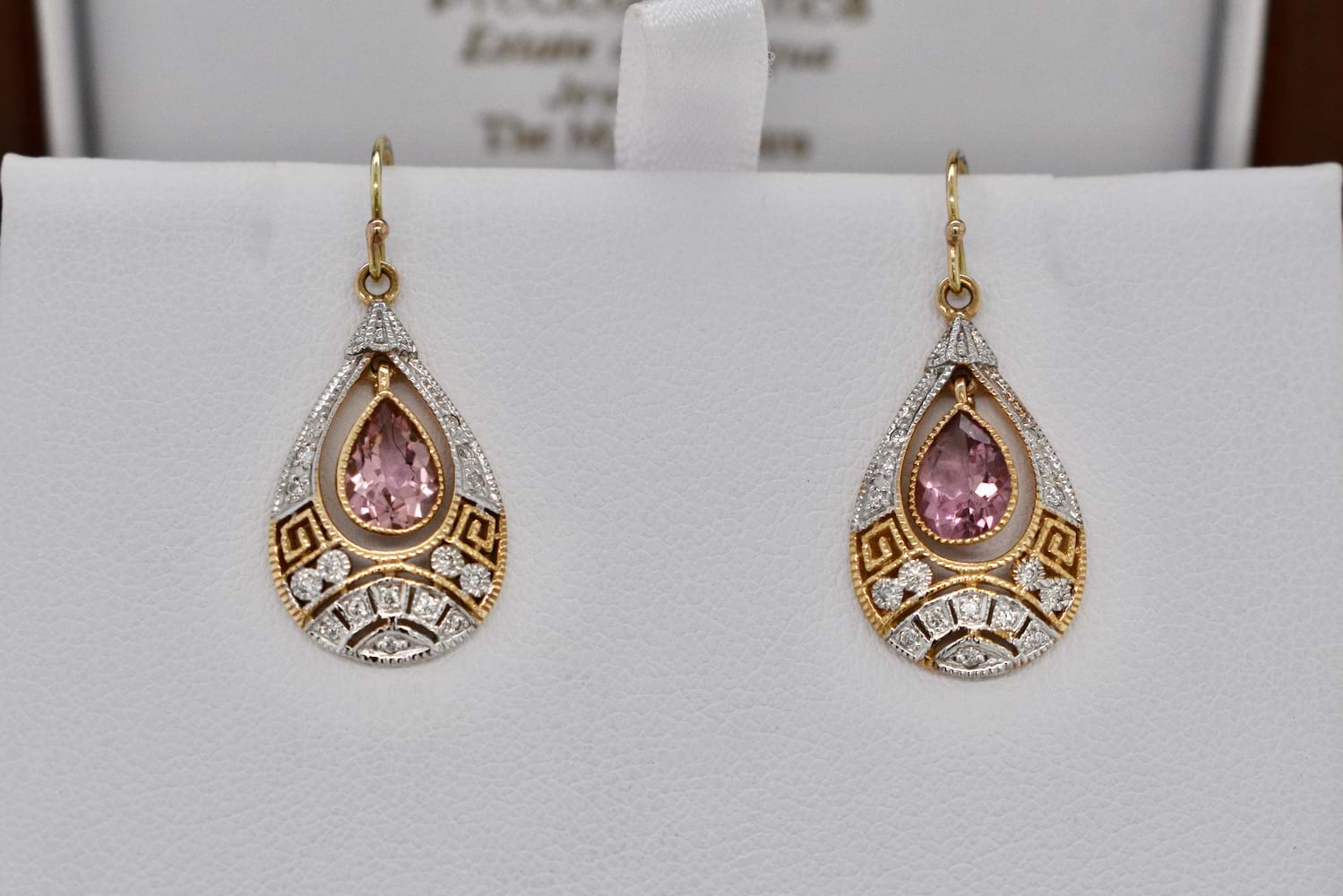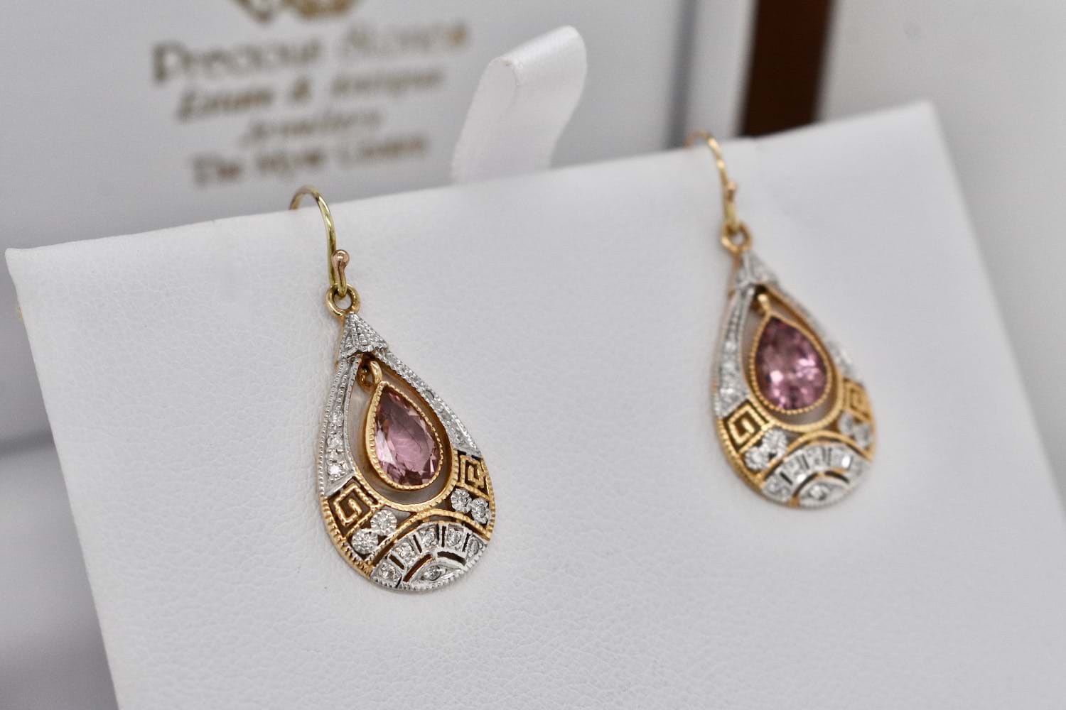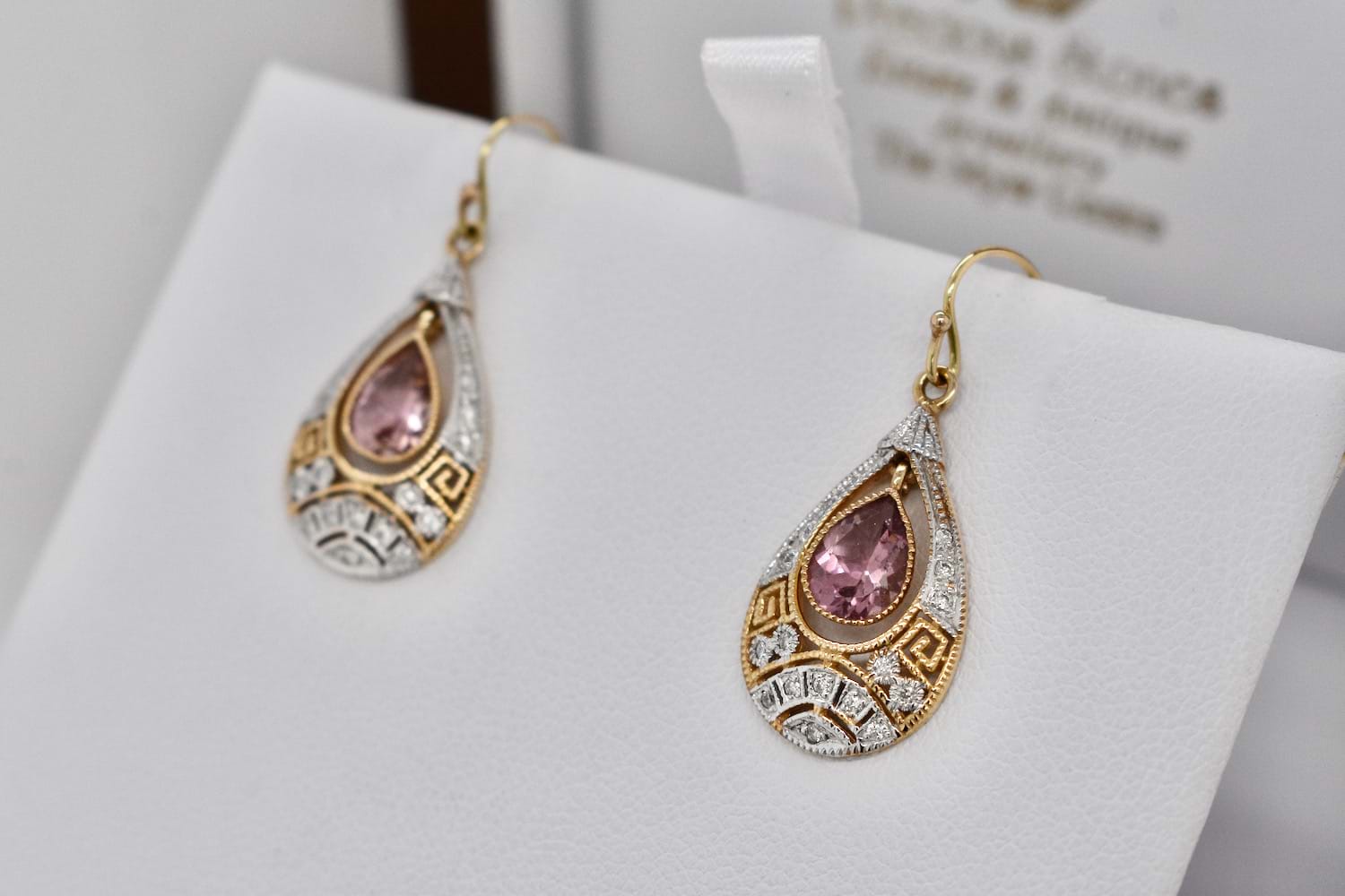 Stunning and feminine drop earrings crafted in 9ct yellow gold and suspended from a shepherd hook fitting. These earrings feature a pearshape pink tourmaline bezel set in yellow gold in the centre of a geometric diamond set, rhodium plated, surround. Two pink tourmalines equal 1.35cts and total diamond content equals 0.16cts. Independent Valuation Supplied
