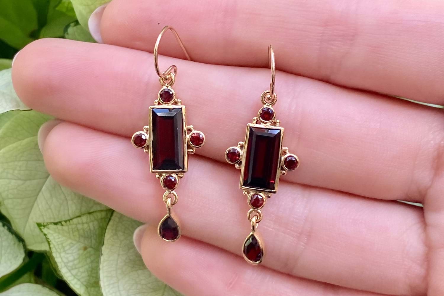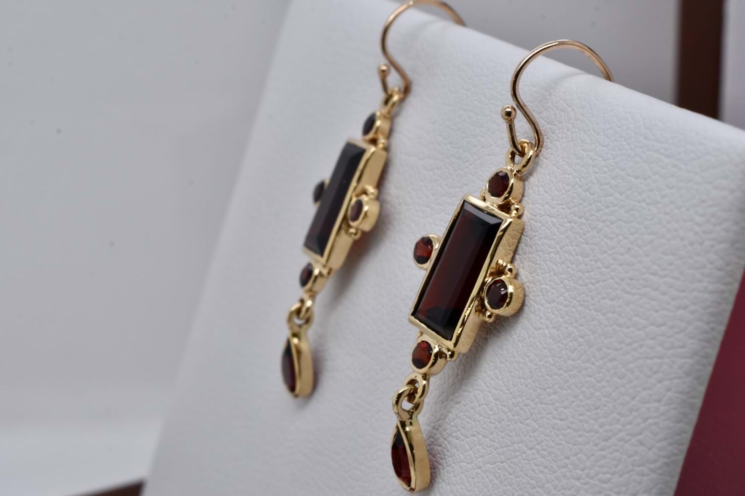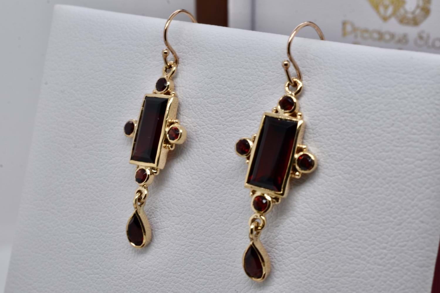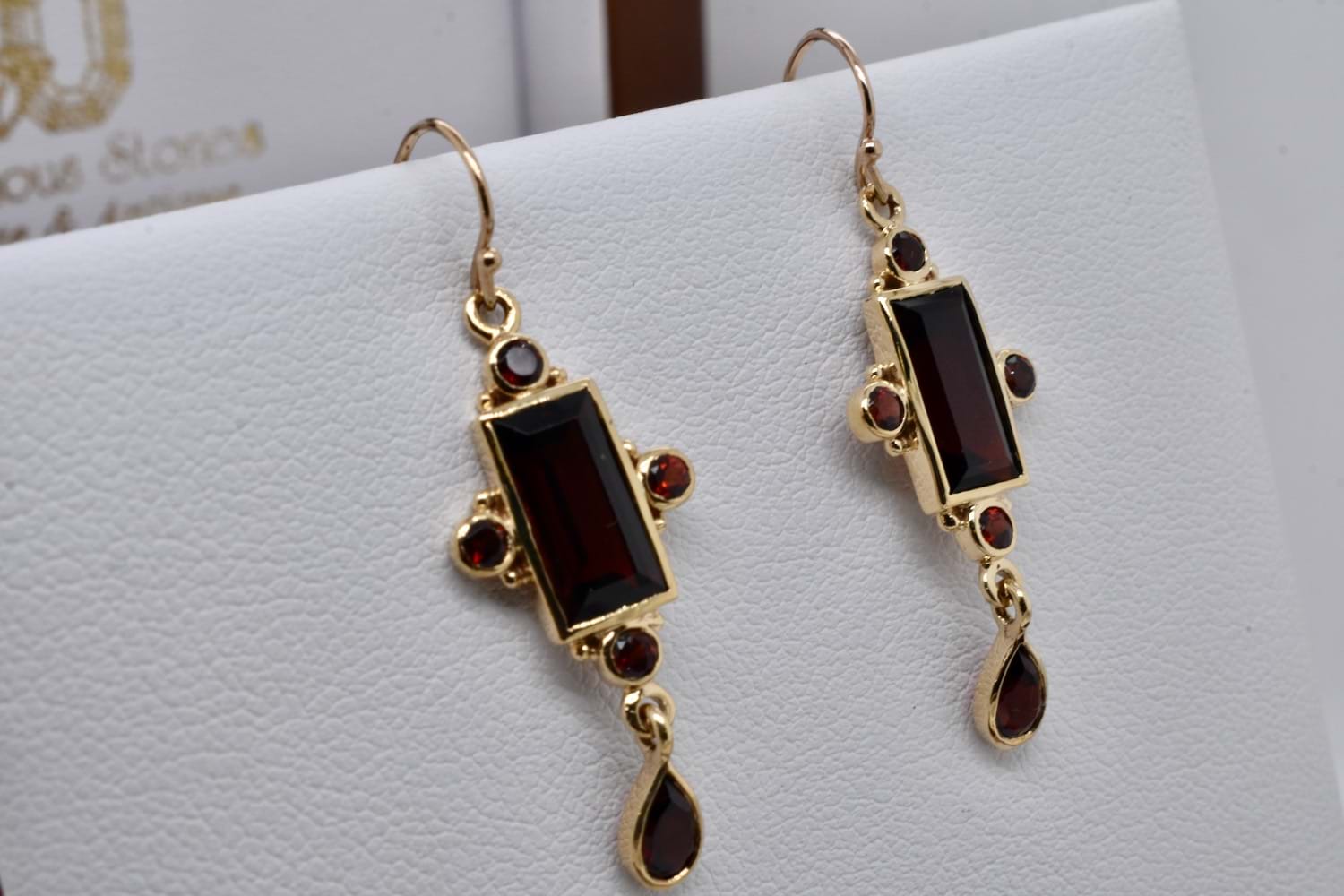 This pair of gorgeous antique style 9ct yellow gold earrings has an impressive 4.70ct of garnets, with a centre emerald cut garnet measuring approx. 9 x 7.5mm in a bezel setting, with four round garnets to each side and an additional pear shape drop, with shepherd hooks