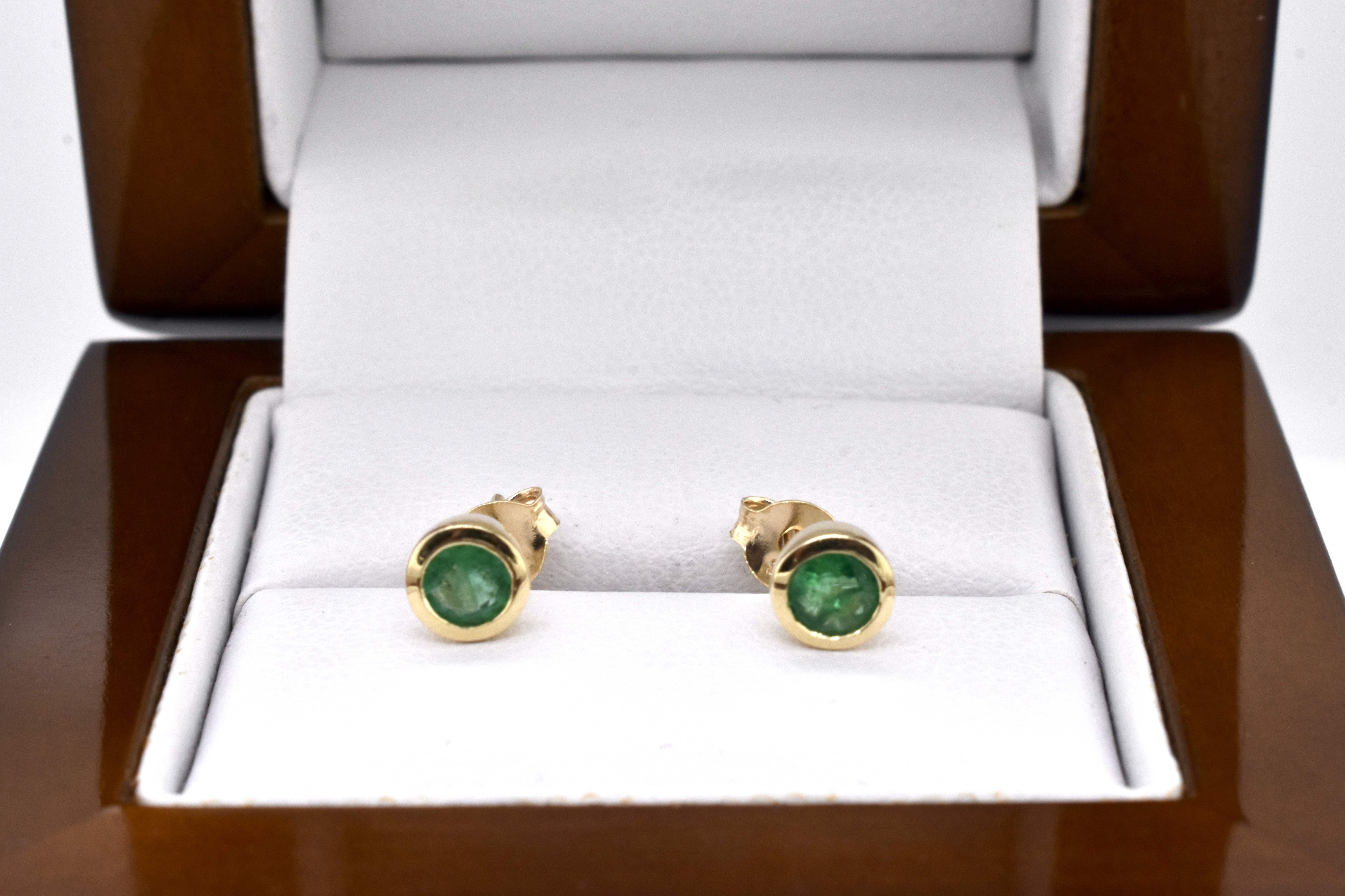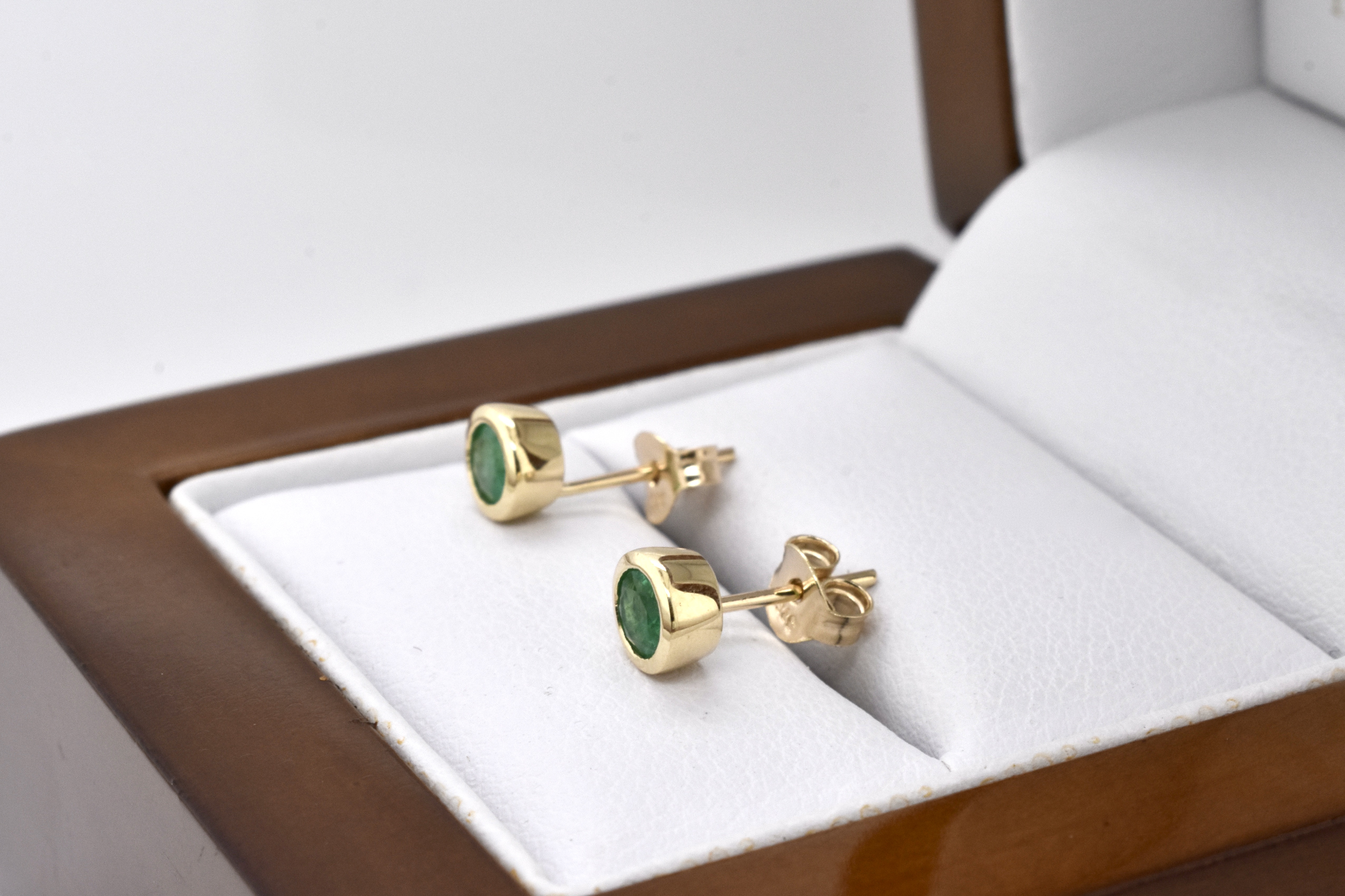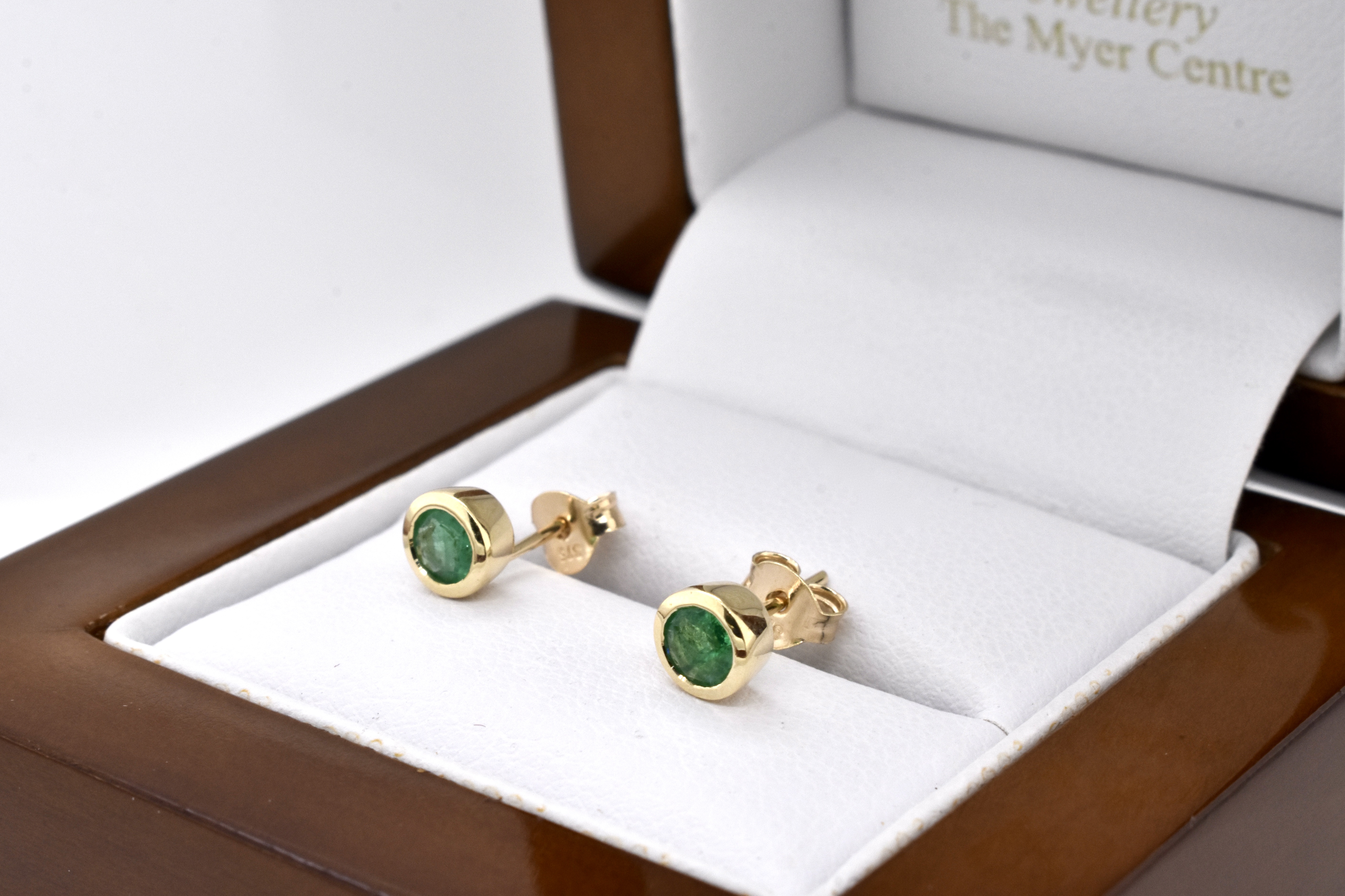 This contemporary pair of 9ct yellow gold studs are set with 4mm round mid green emeralds, bezel set with post and butterfly fittings