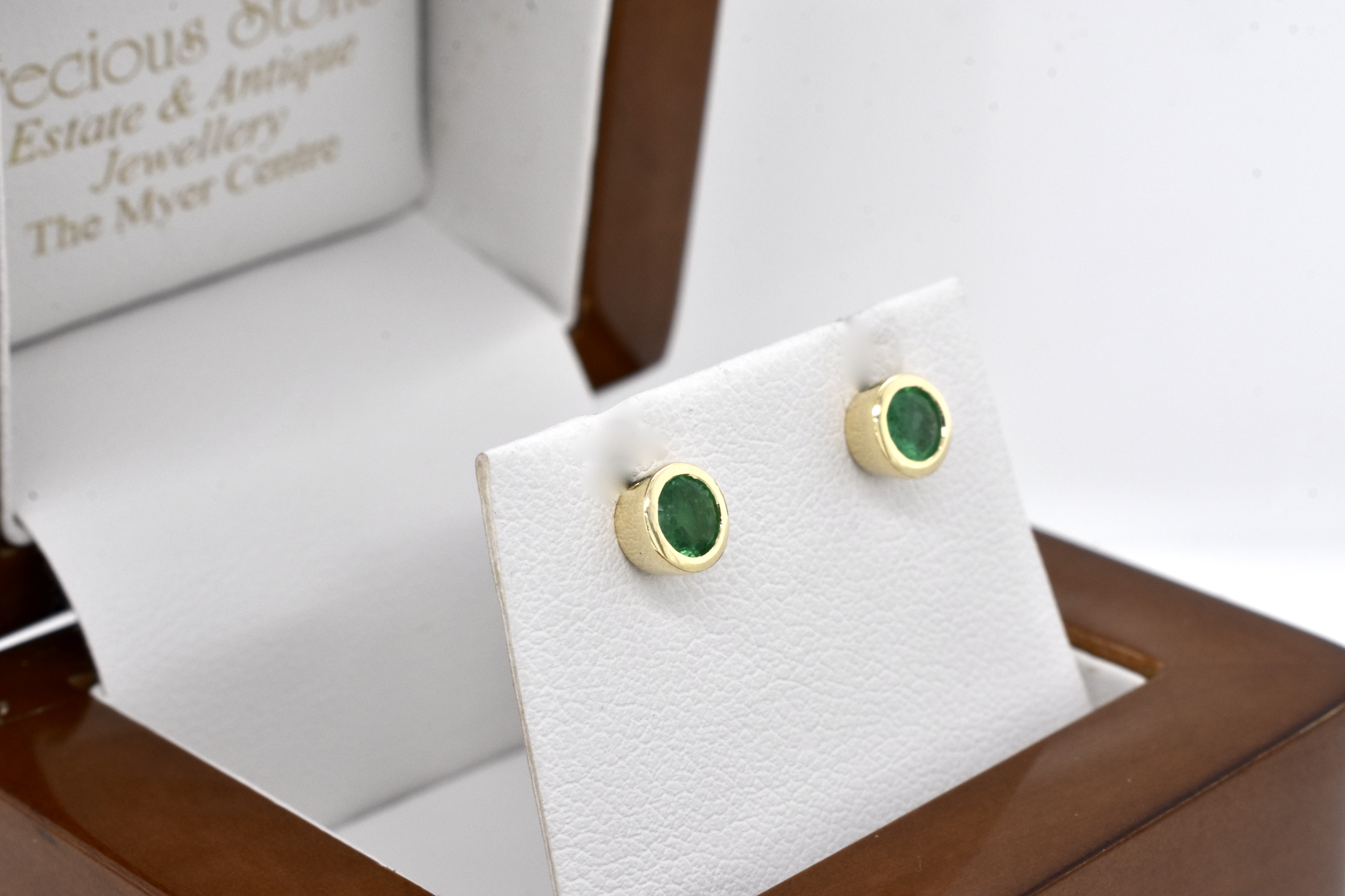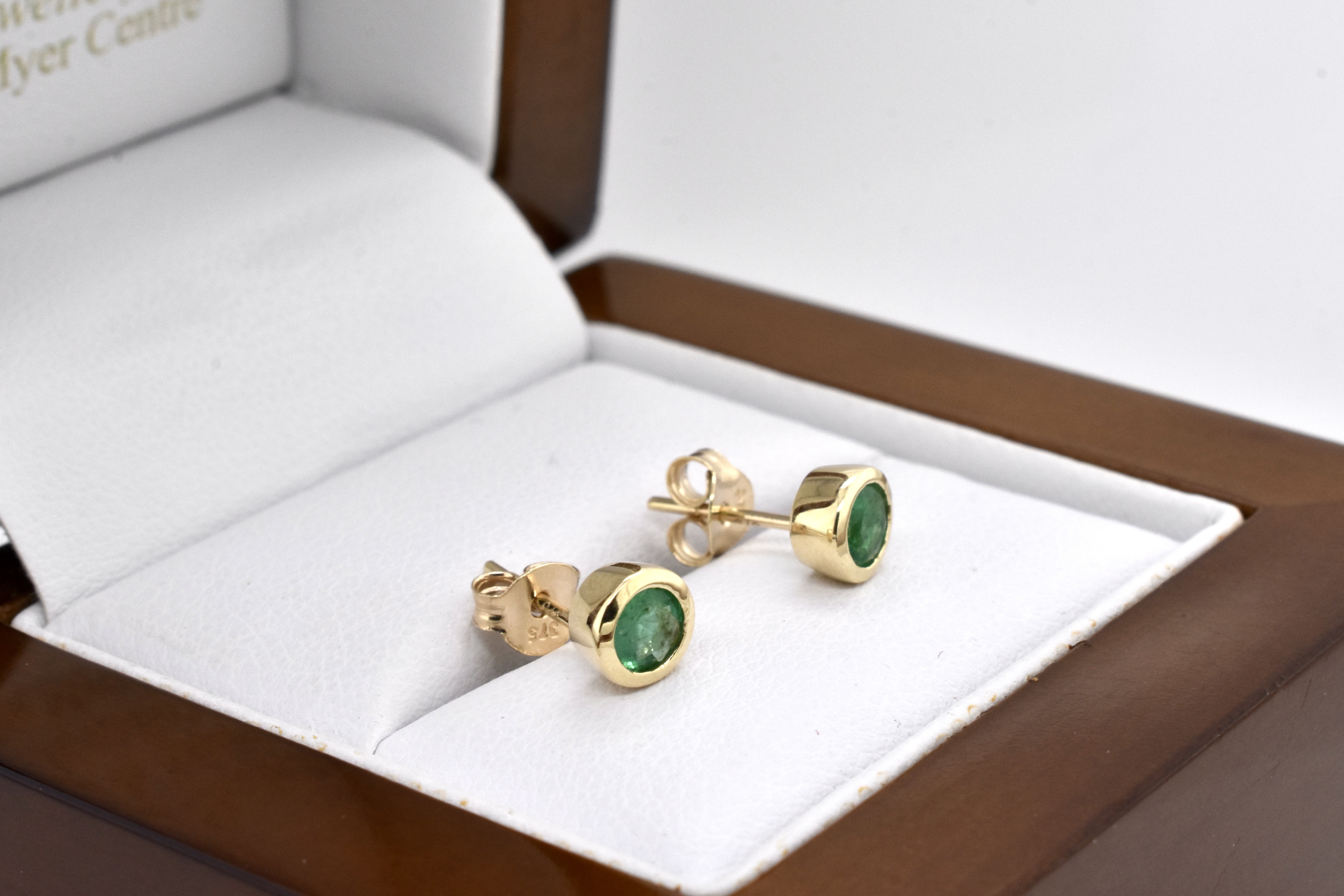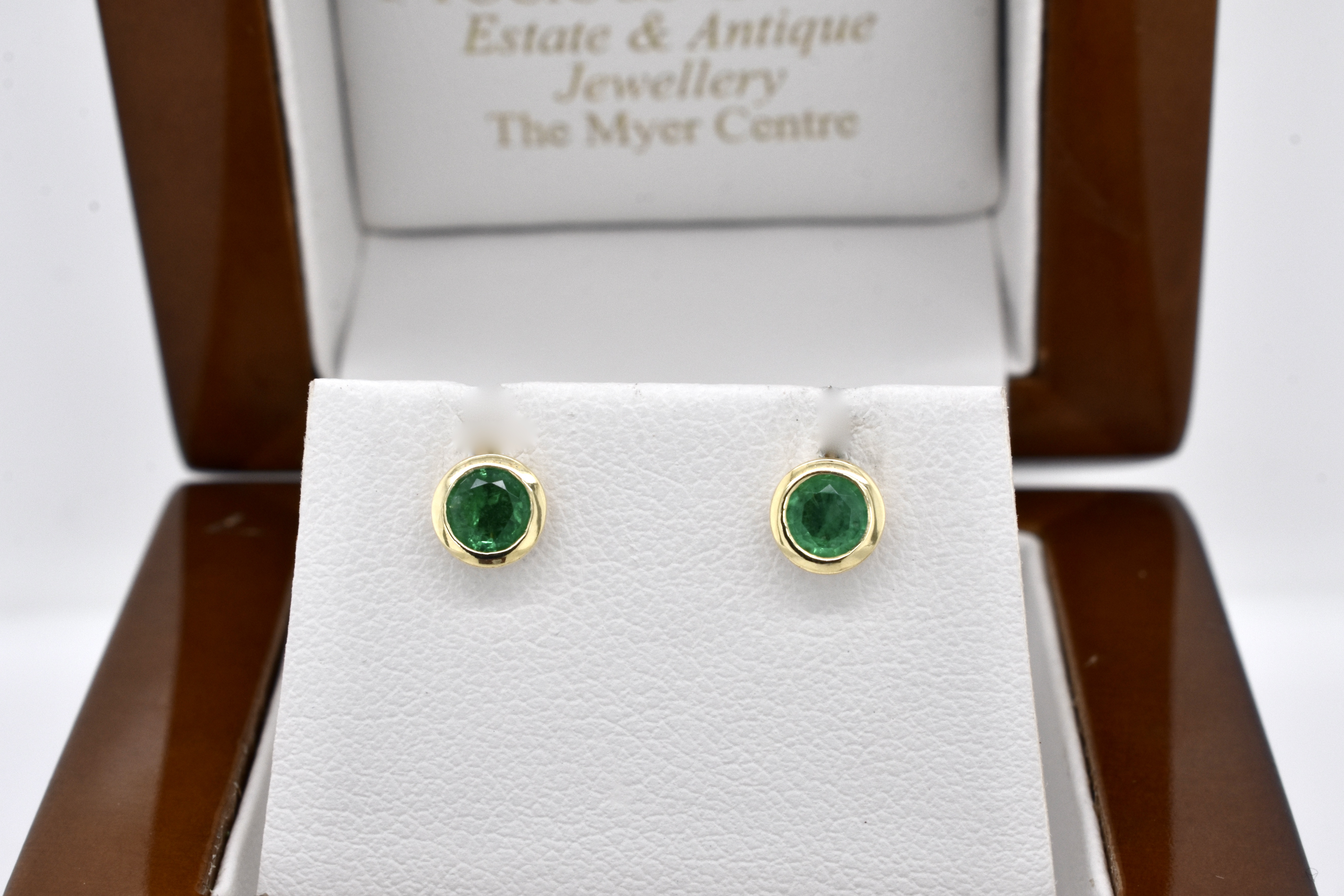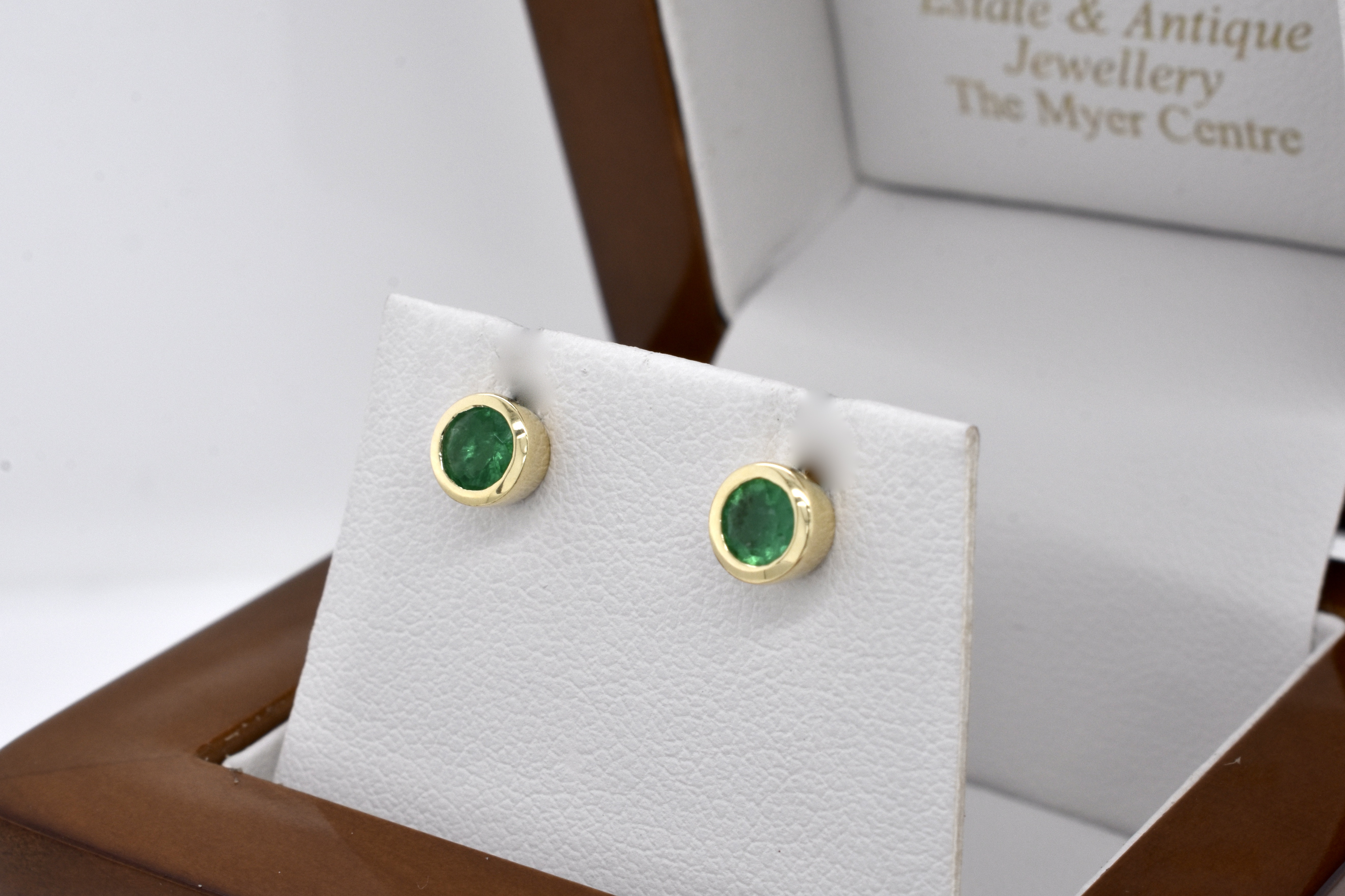 This contemporary pair of 9ct yellow gold studs are set with 4mm round mid green emeralds, bezel set with post and butterfly fittings