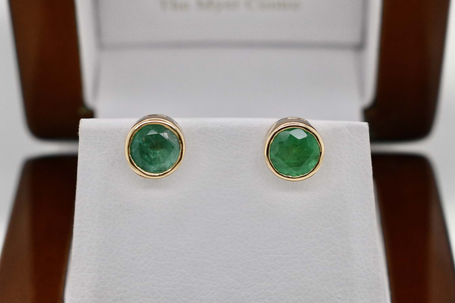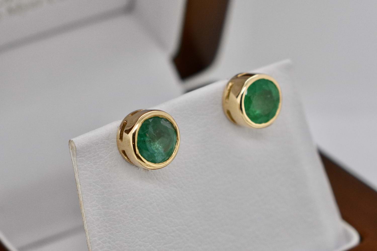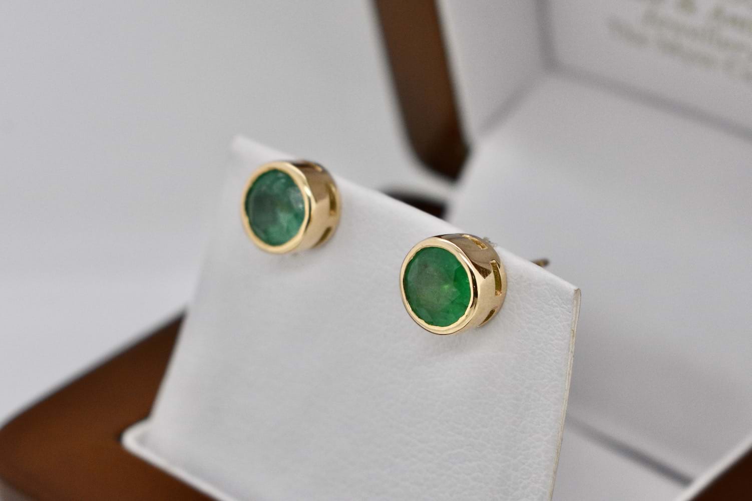 Bezel set 9ct yellow gold stud earrings with 5.8mm round emeralds with post and butterfly fittings
