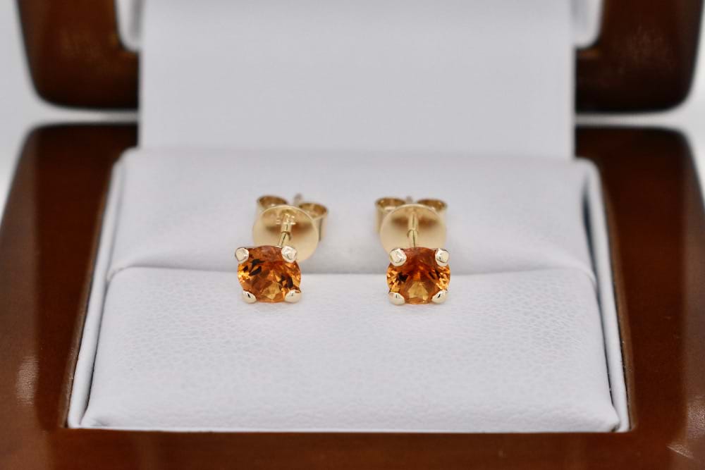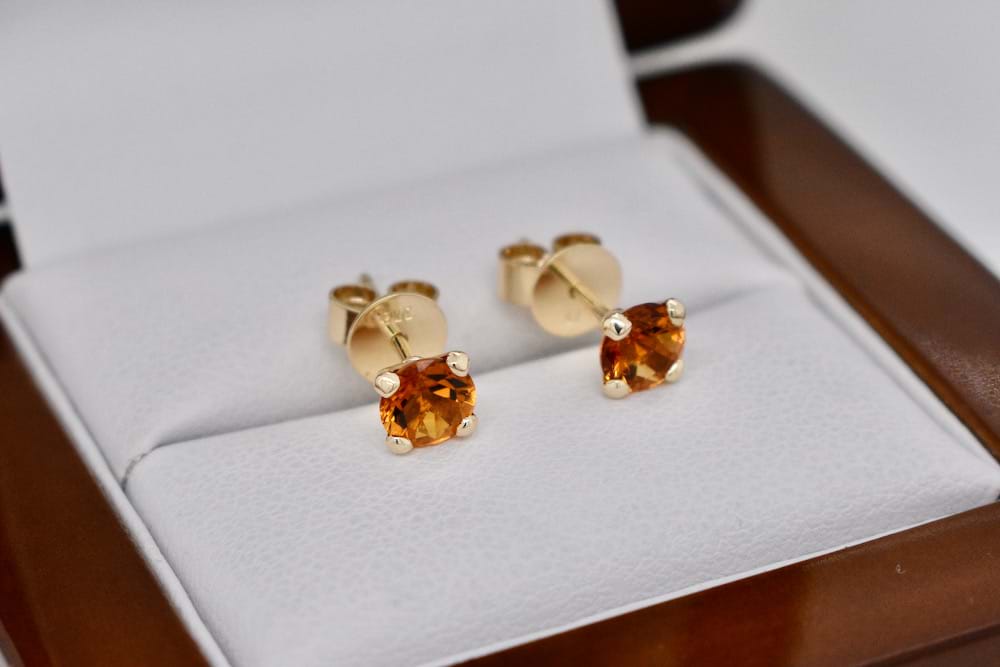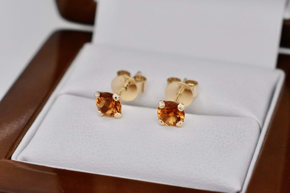 Handmade 9ct yellow gold stud earrings featuring 5mm round faceted citrines