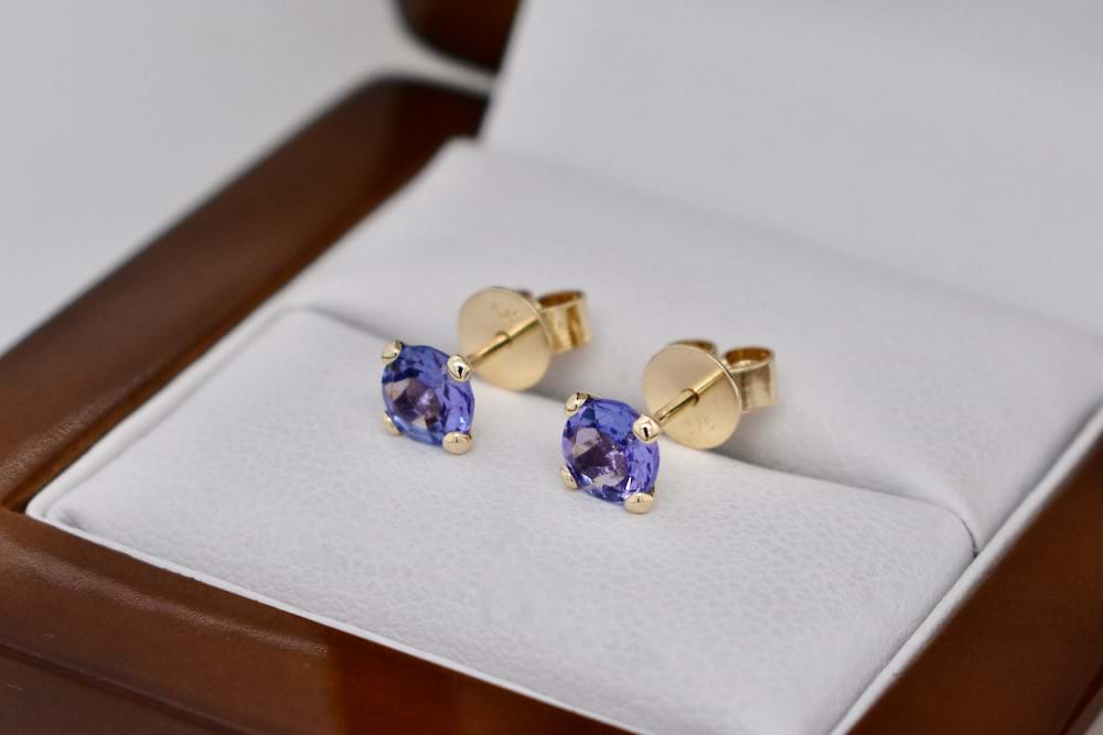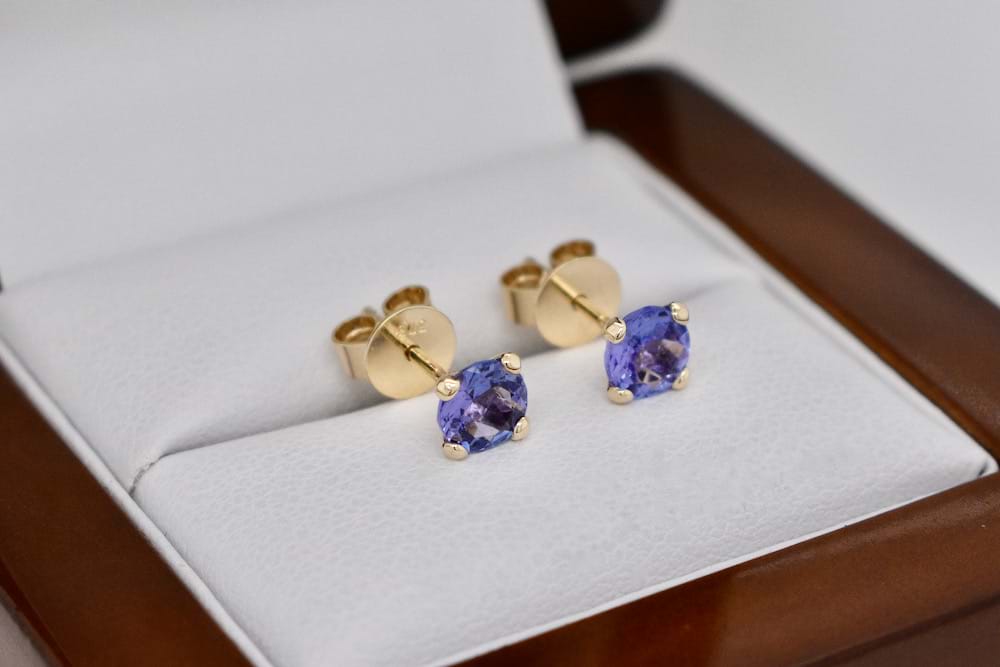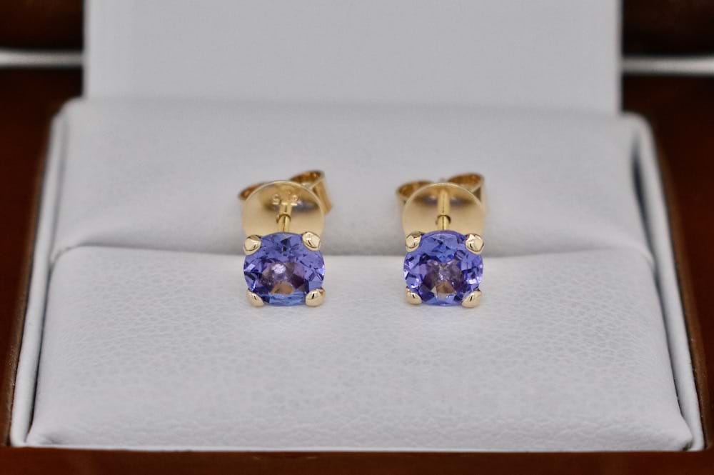 Lilac and beautiful tanzanites measuring 5mm round set into handmade 9ct yellow gold four claw stud settings with high quality butterfly fittings