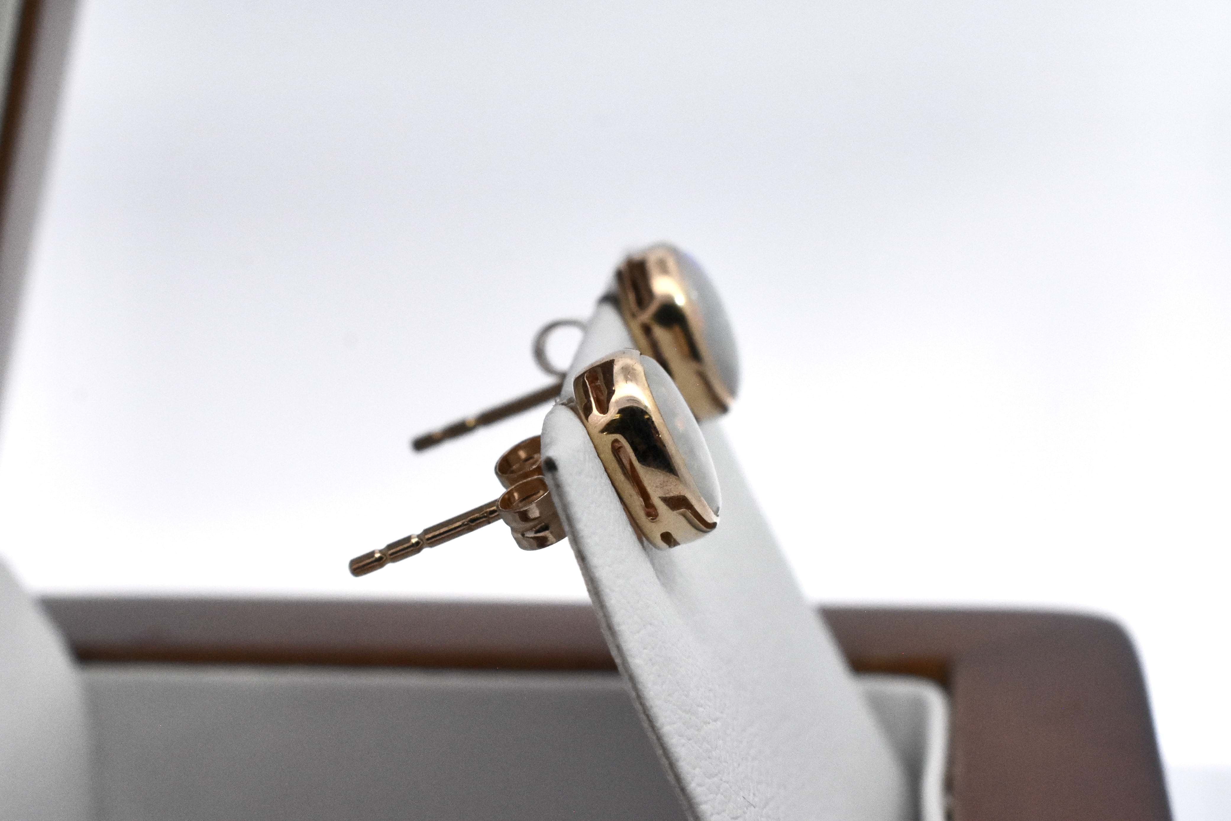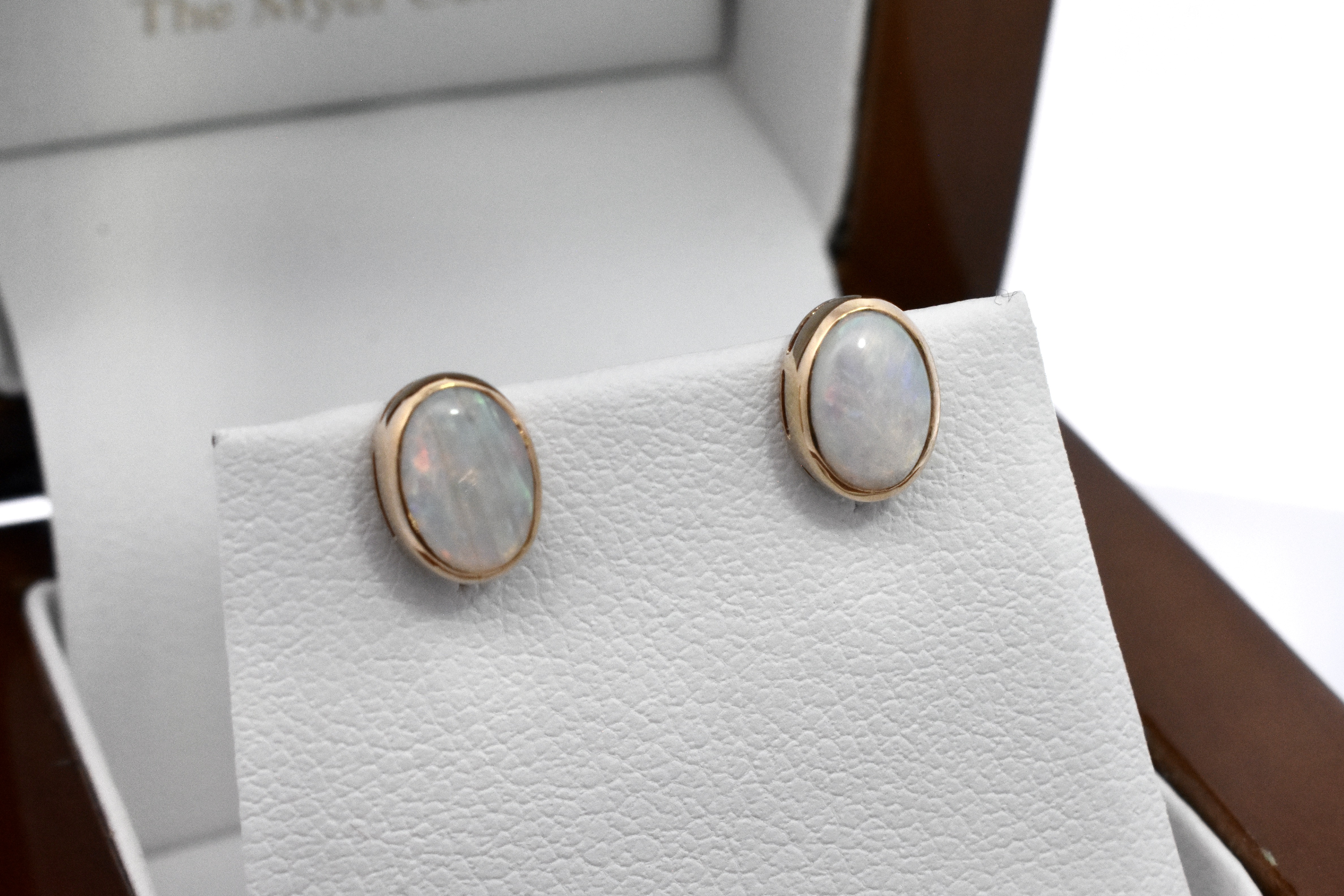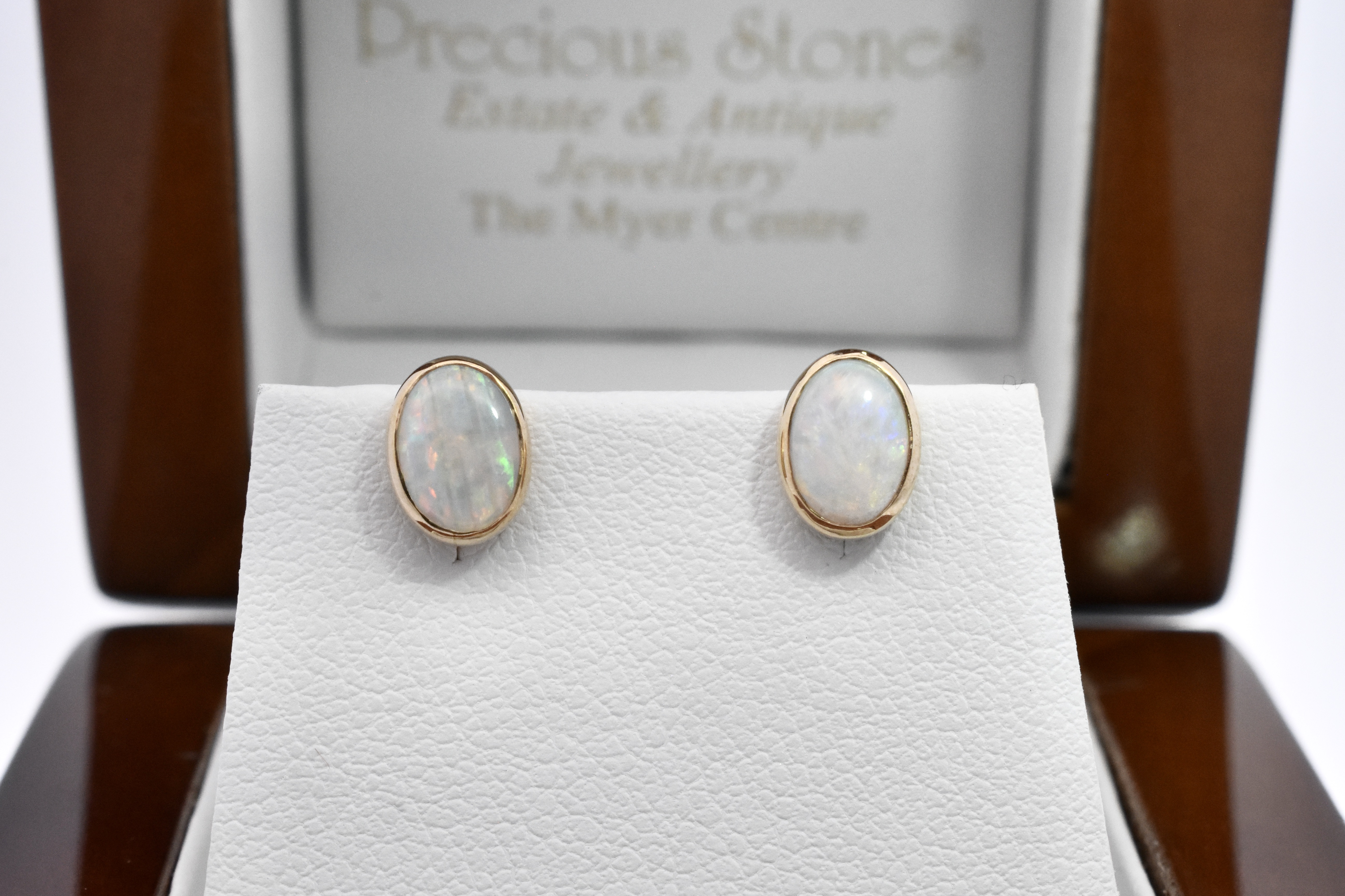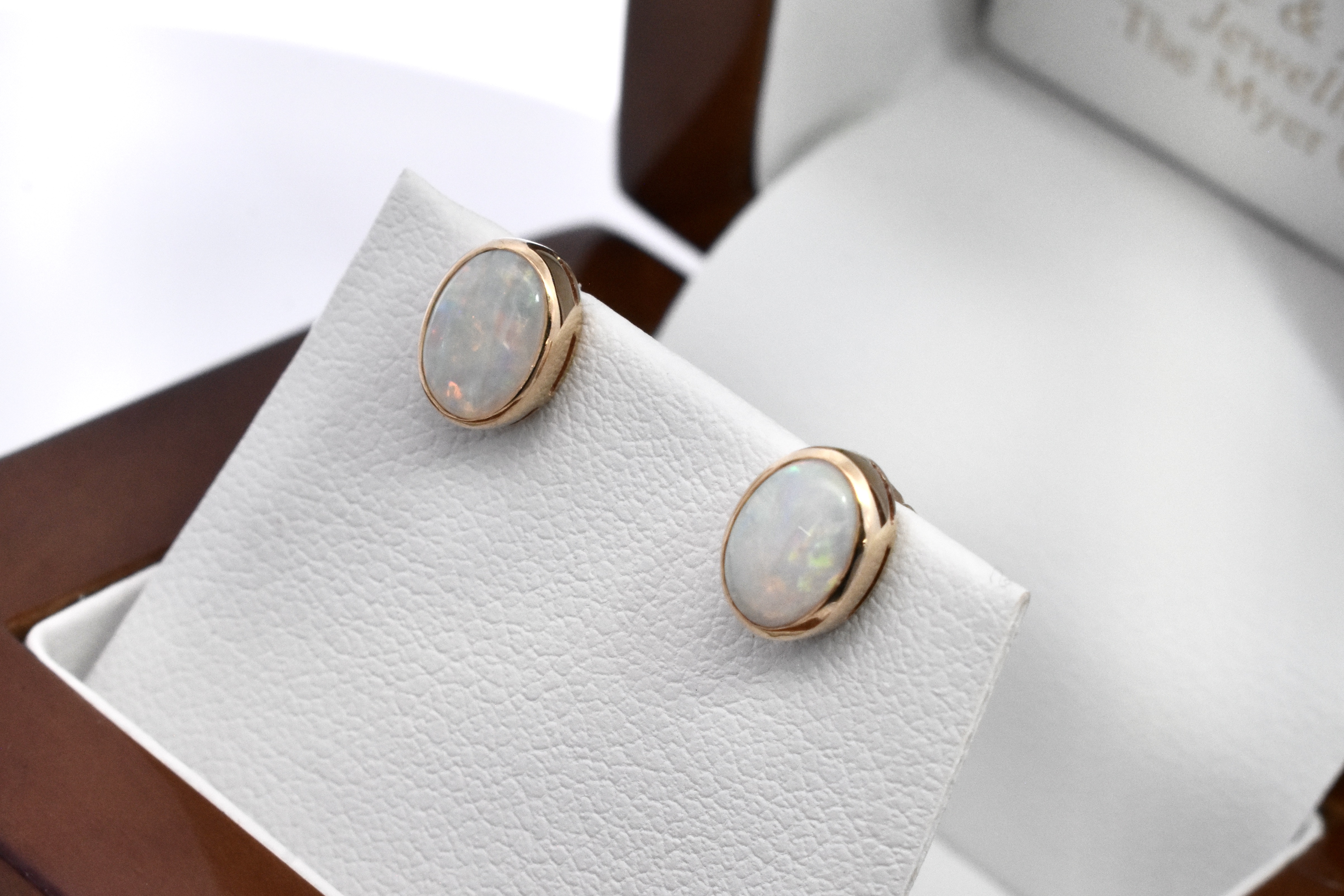 A simple pair of 9ct yellow studs, set with a stunning pair of oval shaped solid white Coober Pedy opals with gorgeous flashes of red, orange, yellow, green and blue in cutout detail bezel settings with post and butterfly fittings. Opals measure approx. 7 x 5mm