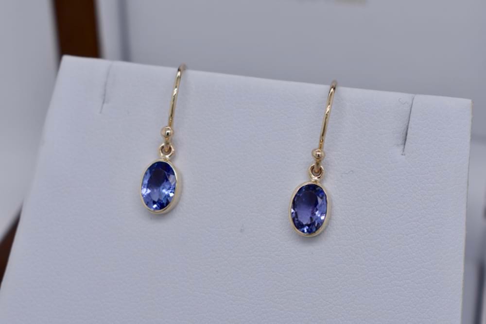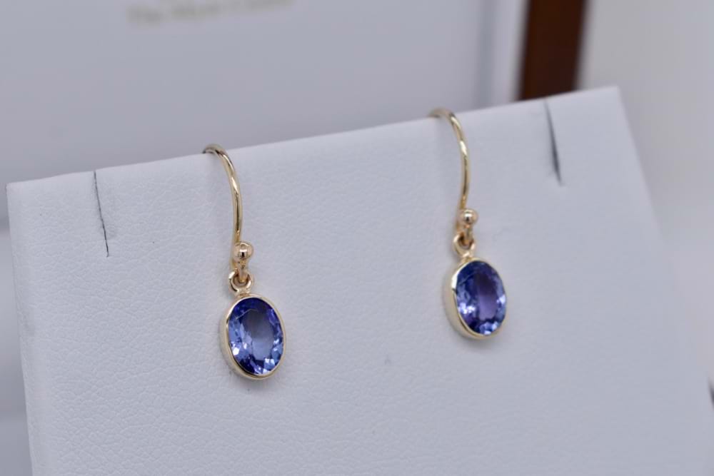 9ct yellow gold handmade earrings featuring a pair of pretty oval, faceted, tanzanites in bezel settings suspended from shepherd hooks. Stones measures 7x5mm