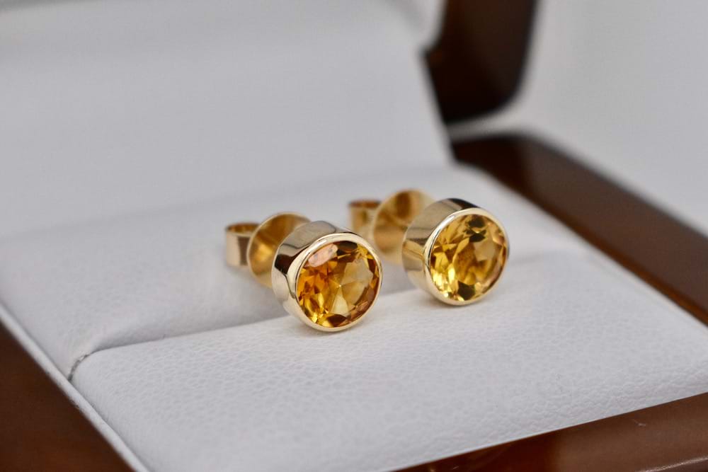 Striking 7mm round faceted citrines set into handmade 9ct yellow gold bezel settings with post and high quality butterfly fittings