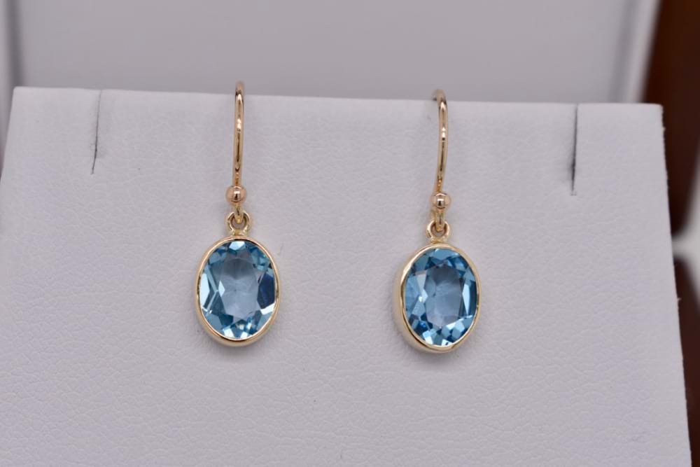 9ct yellow gold handmade bezel set drop earrings set with two oval Sky Blue Topaz measuring 9.5x7.5mm and suspended from shepherd hook fittings