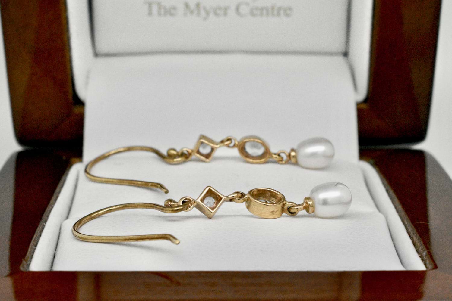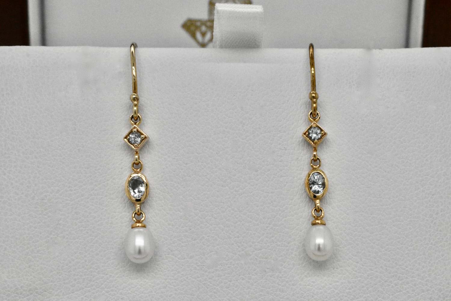 Pretty and understated 9ct yellow gold drop earrings featuring two bezel set sky blue topaz with a lustrous oval freshwater pearl drop at the bottom with shepherd hook fittings