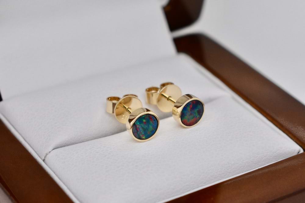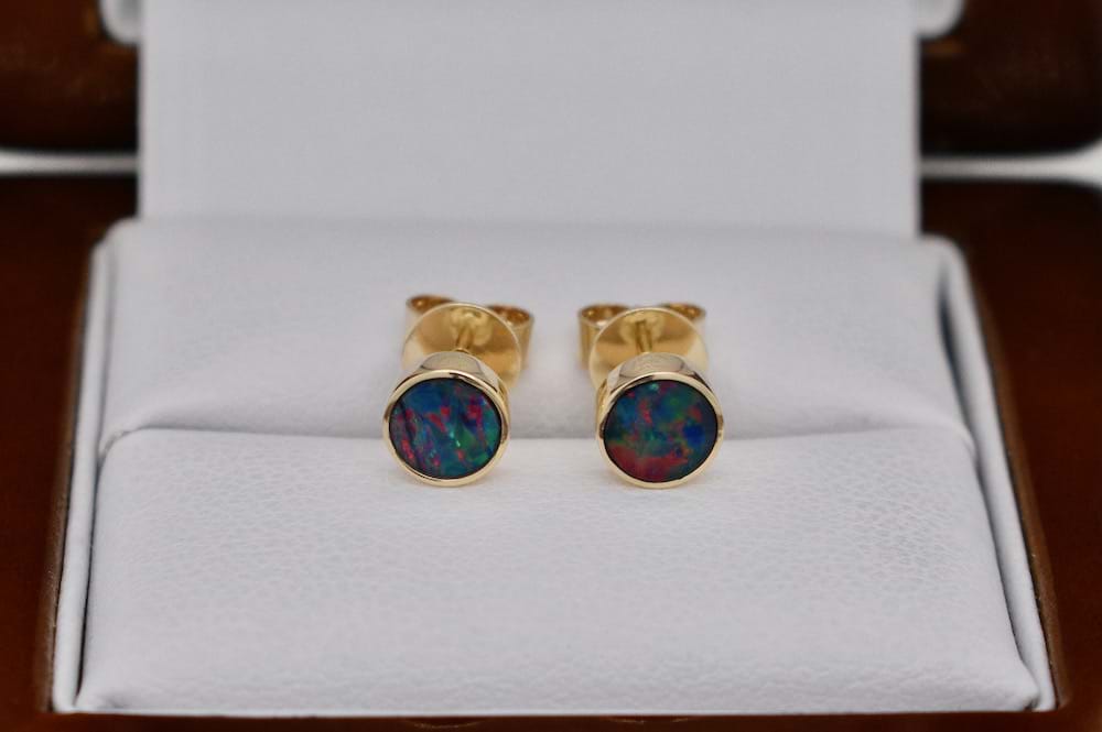 Handmade in 9ct yellow gold these bezel set stud earrings feature opal doublets that consist of an opal crystal top and a boulder opal base with strong red, green and blue flashes. The doublets measure 6mm round