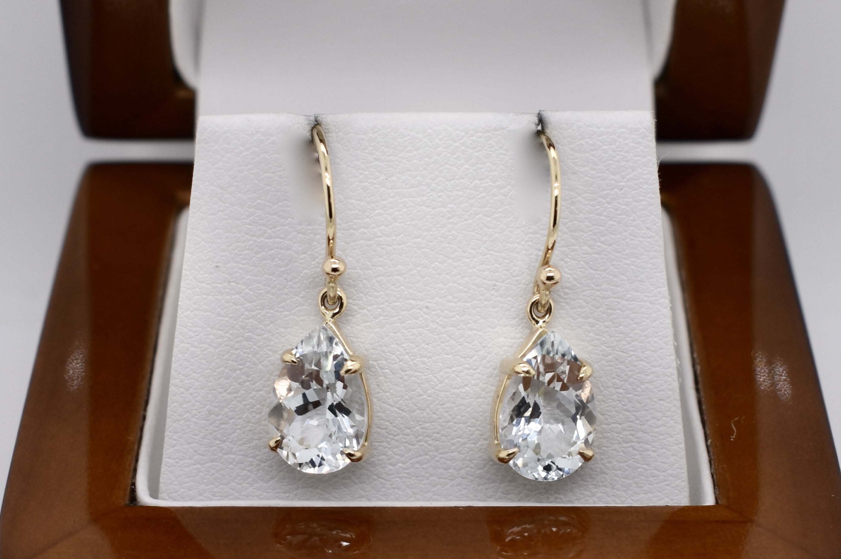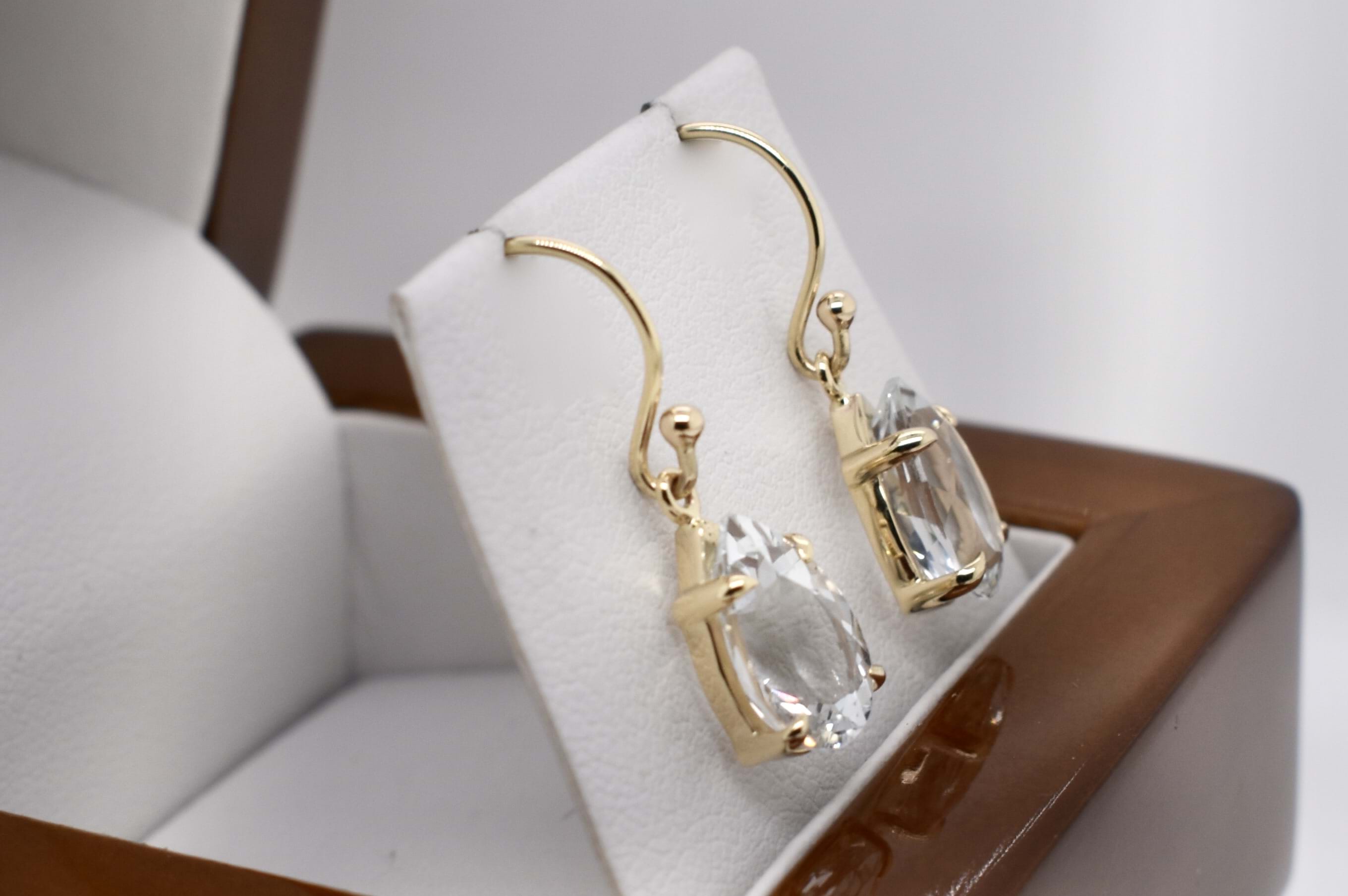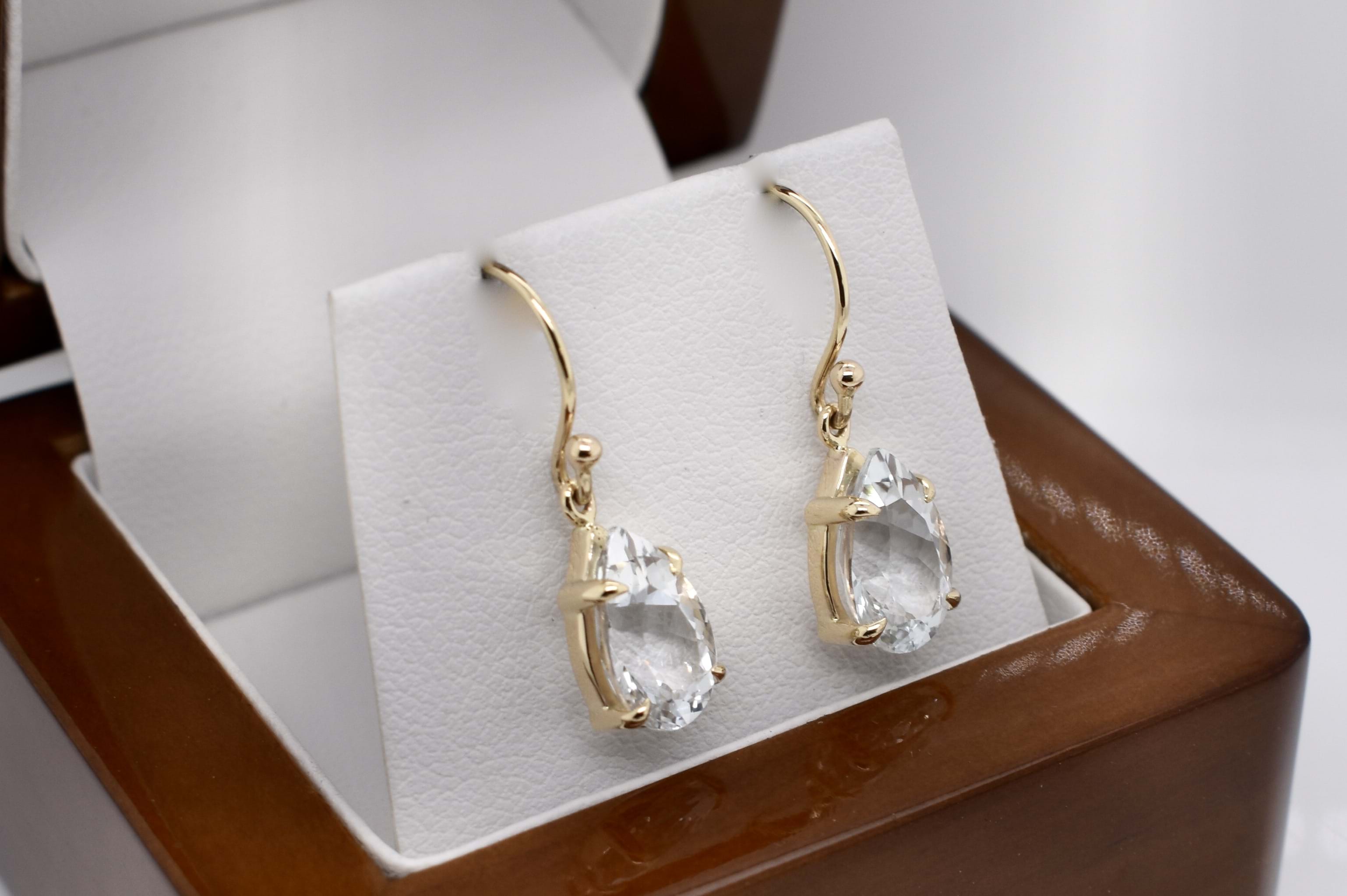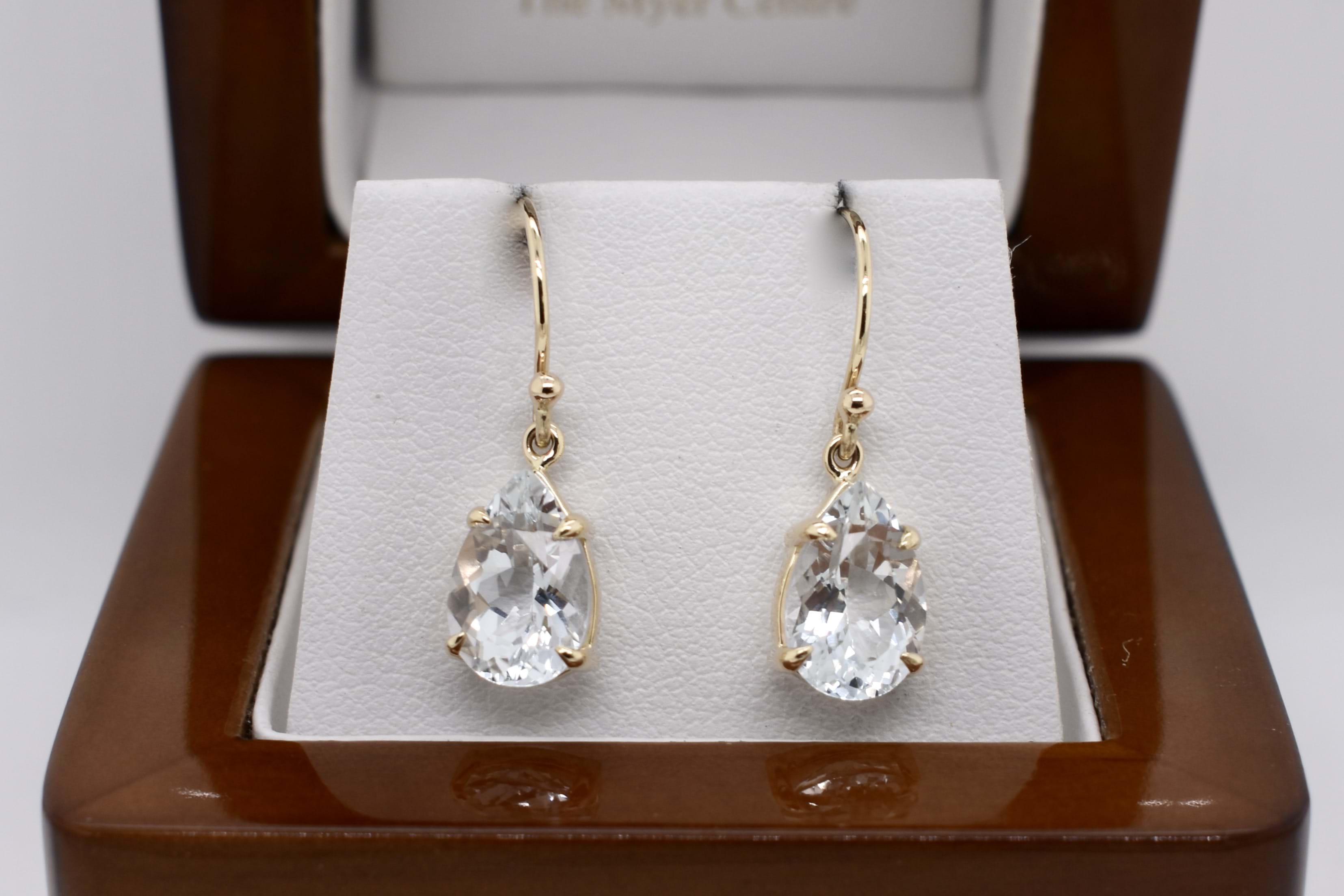 These elegant colourless topaz drops, are pearshape and four claw set, in 9ct yellow gold. Measuring 10.7x7.5mm and finished with plain gold shepherd hook fittings.