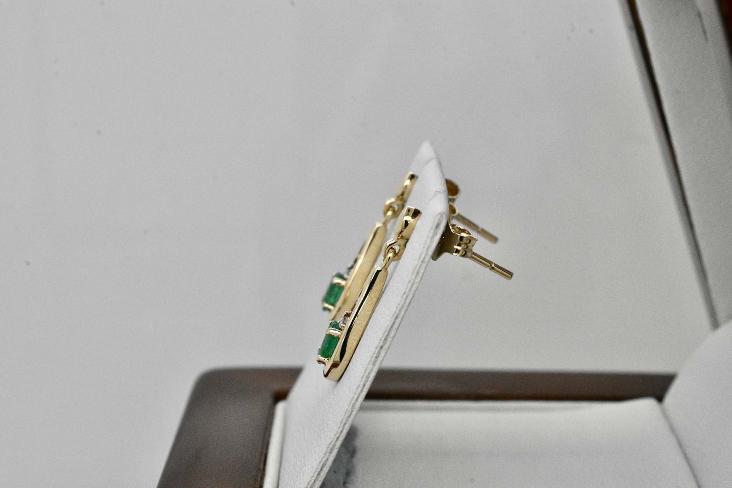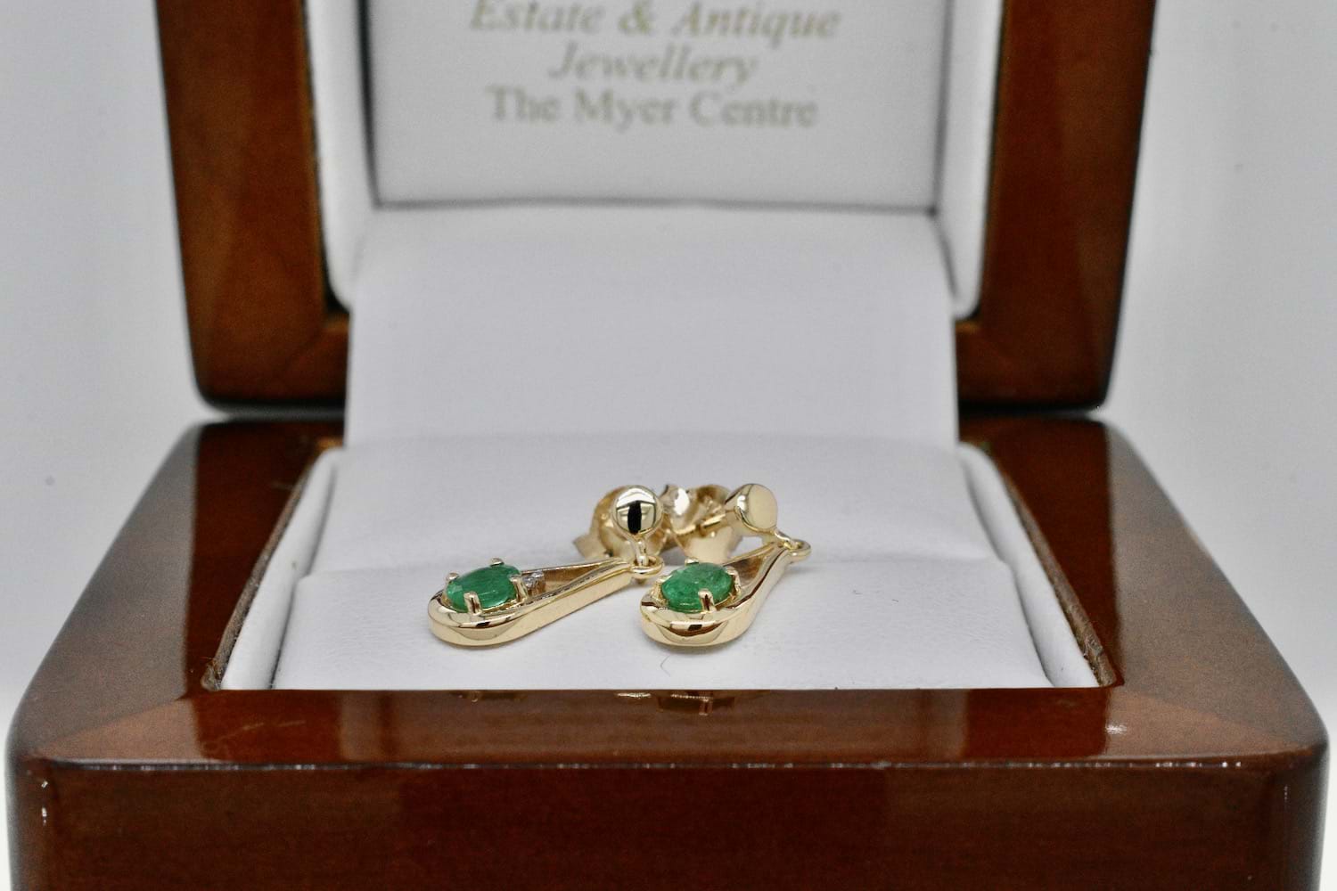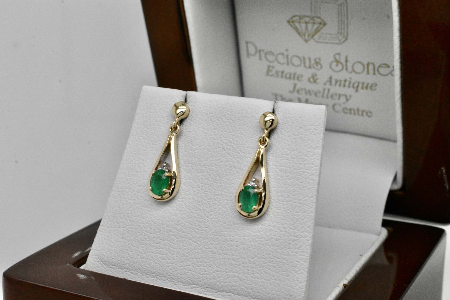 A simple yet refined pair of 9ct yellow gold earrings set with two 4 x 3mm oval mid-light green emeralds and a white diamond as a sparkly accent, set into an elongated teardrop shape surround and suspended from simple polished round studs with post and butterfly fittings