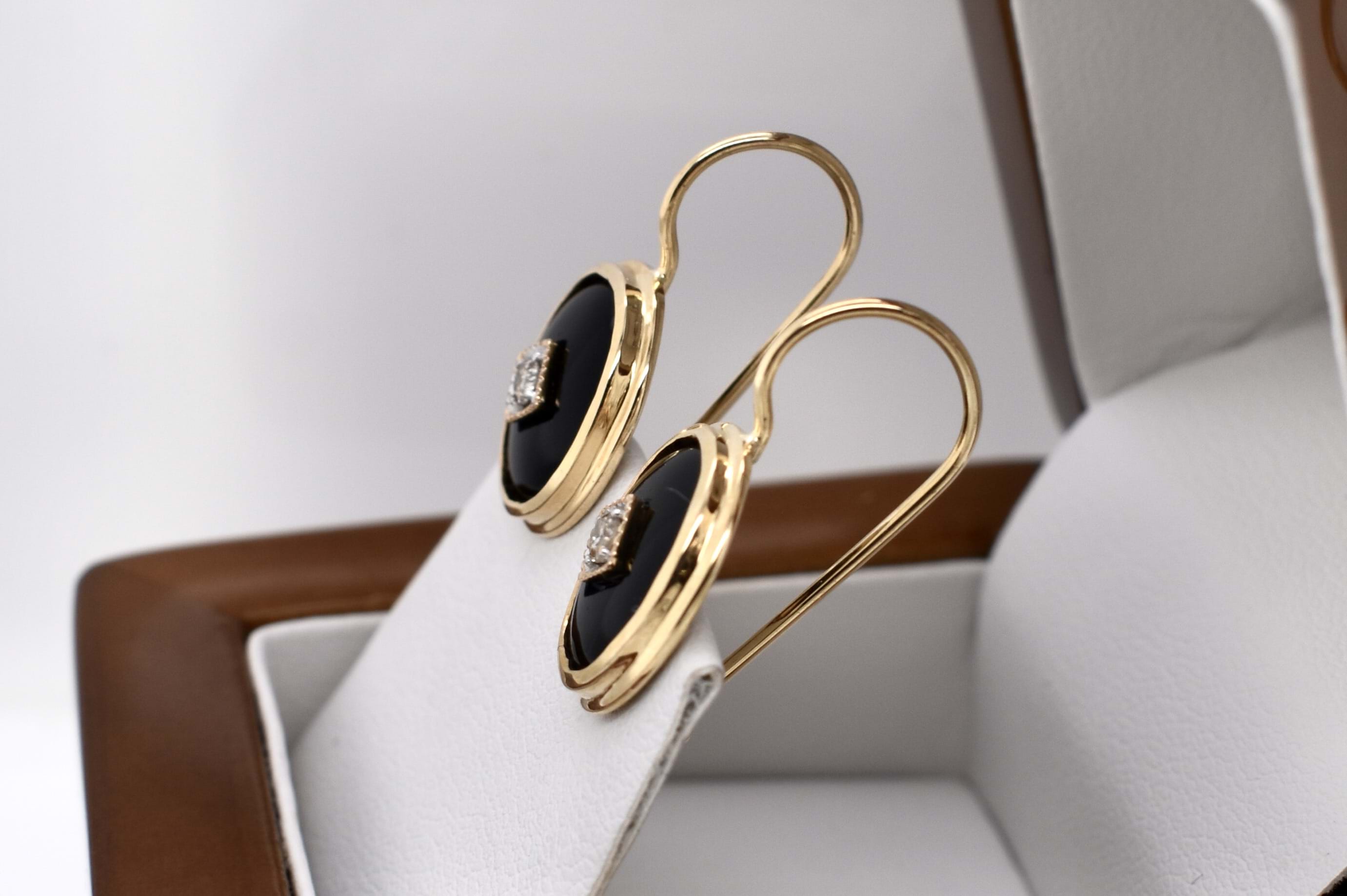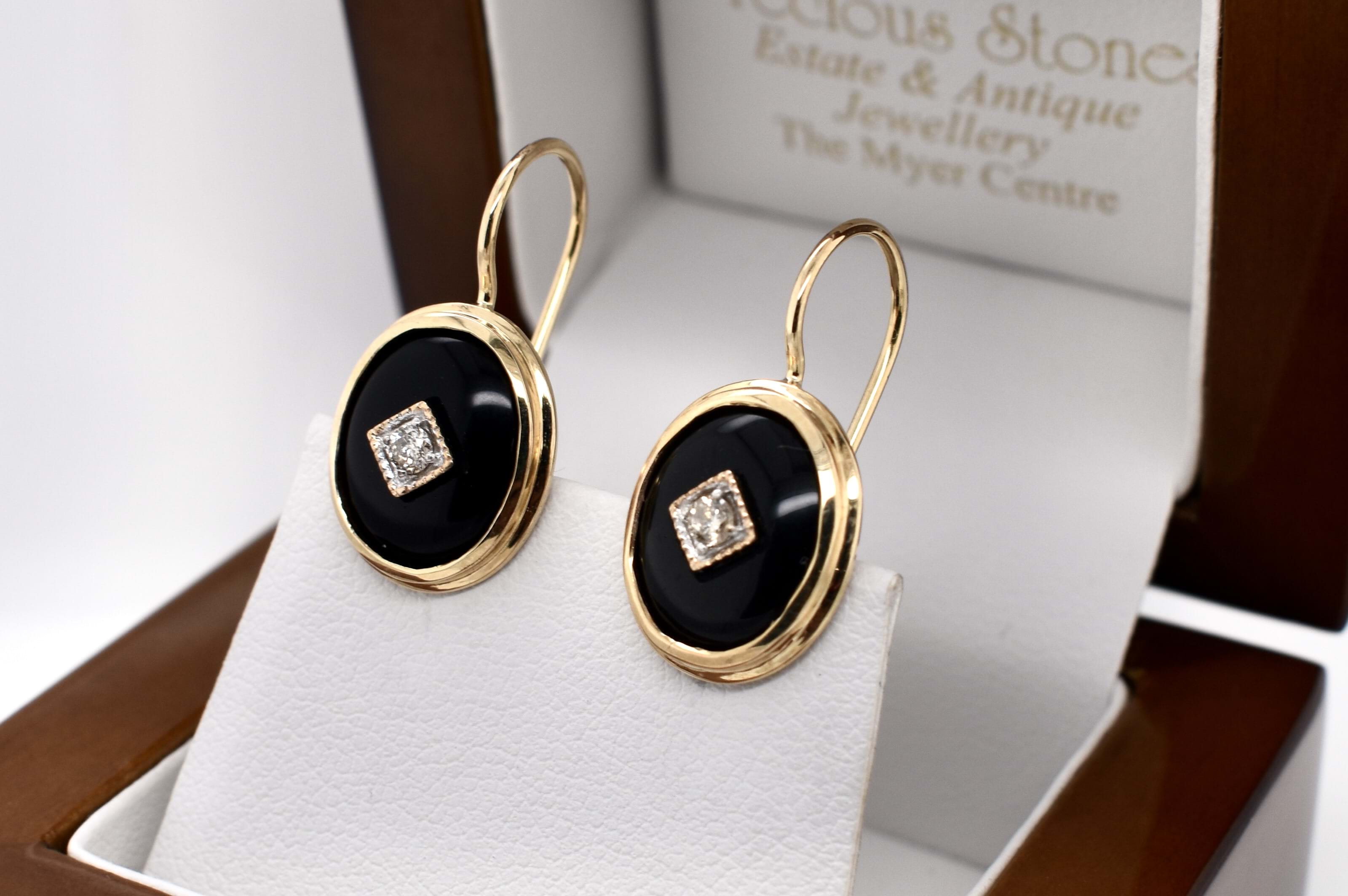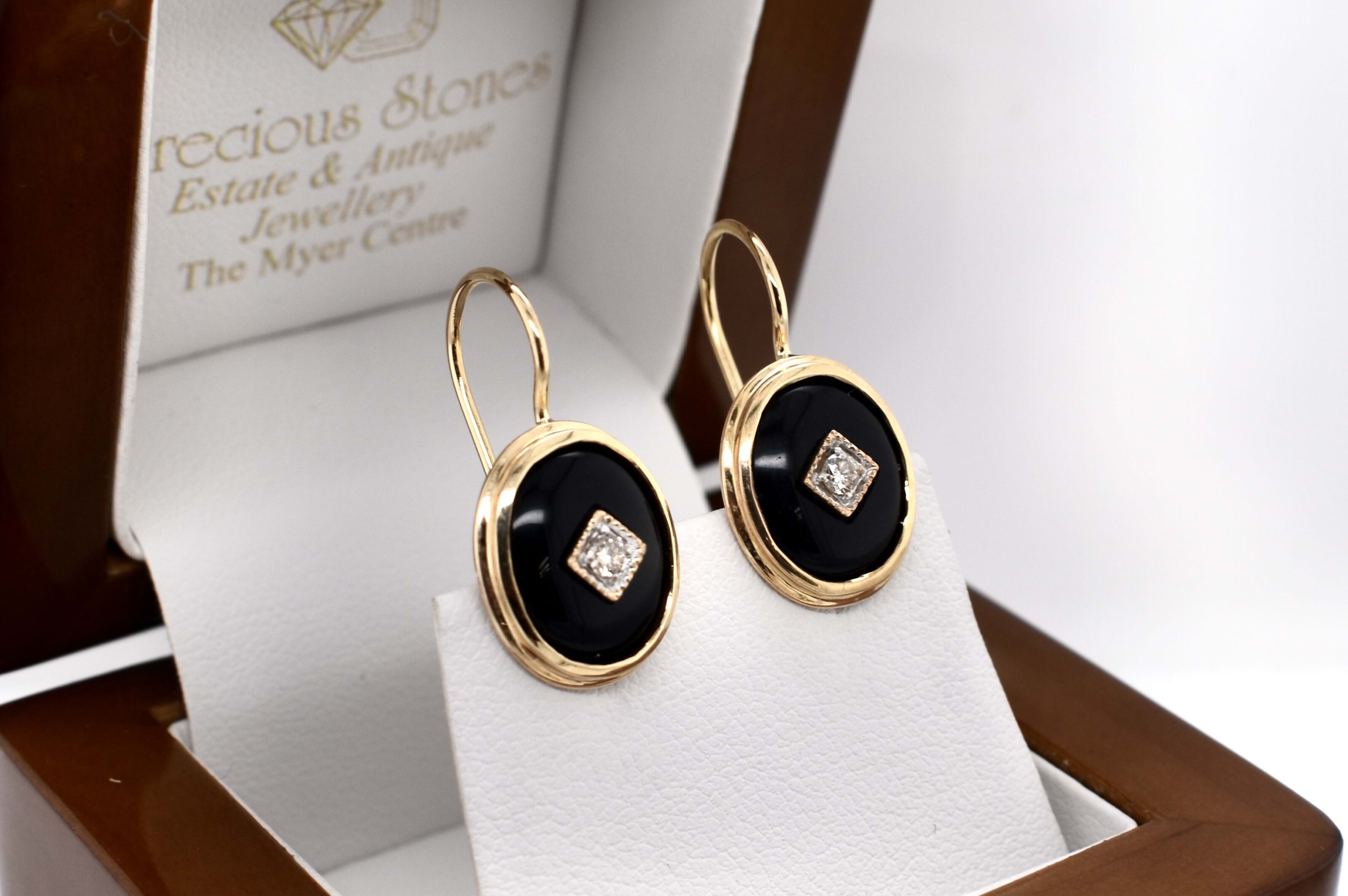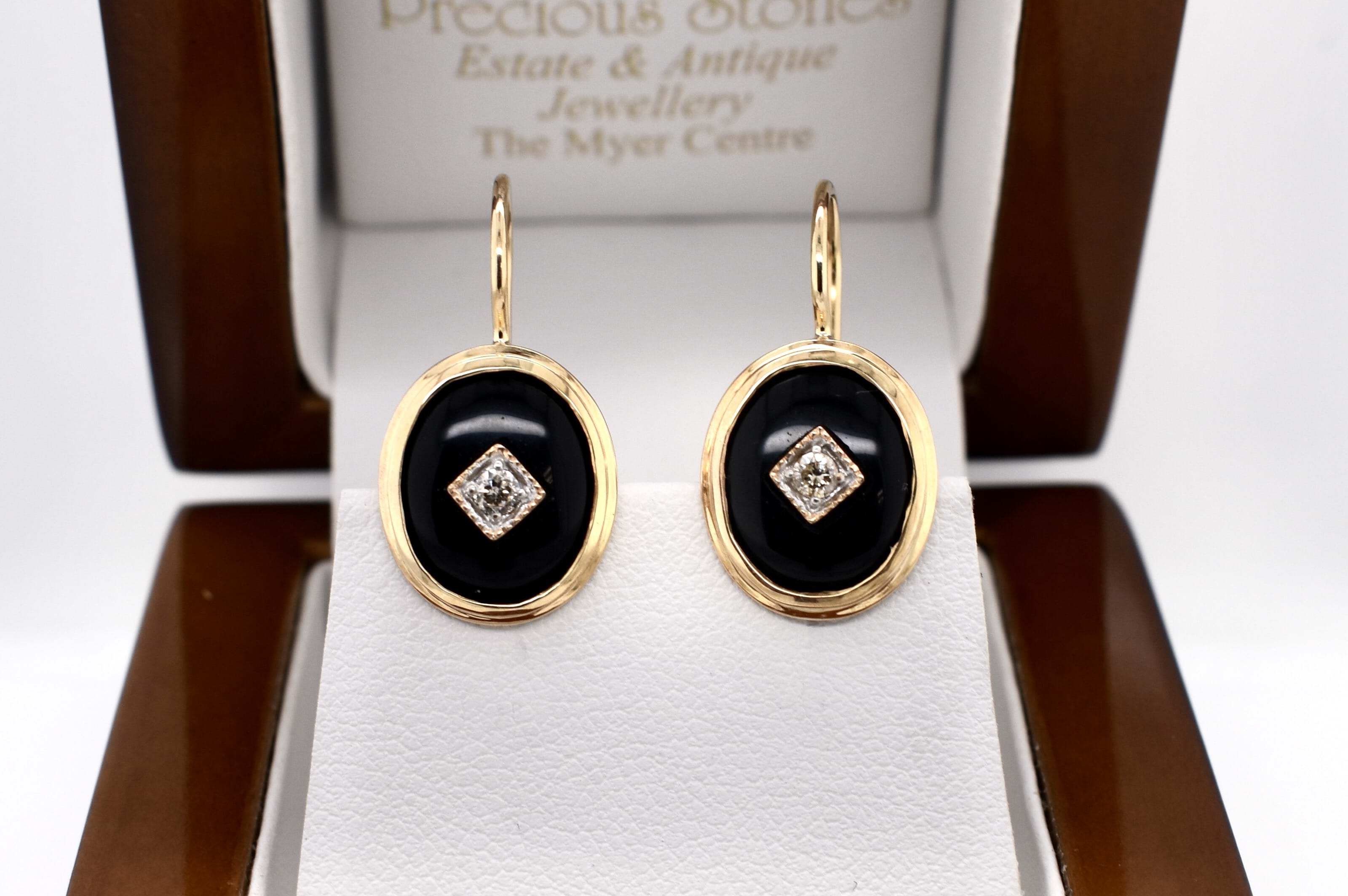 SOLD 9ct Yellow Gold Onyx & Diamond Oval Drop Earrings
