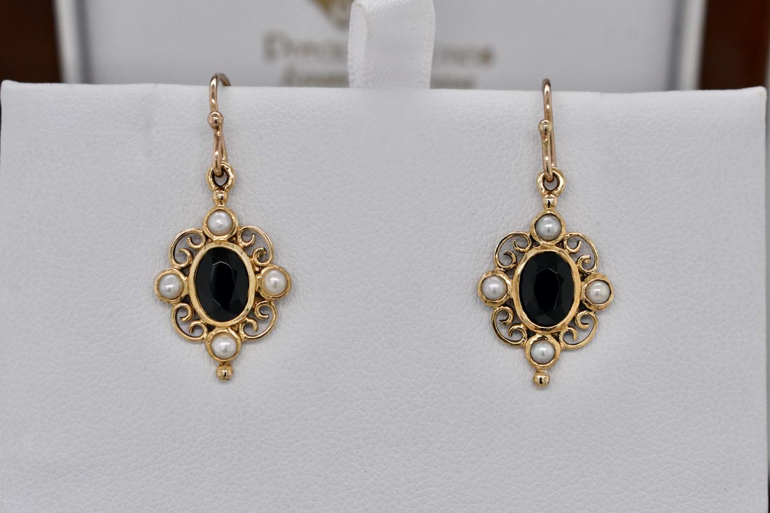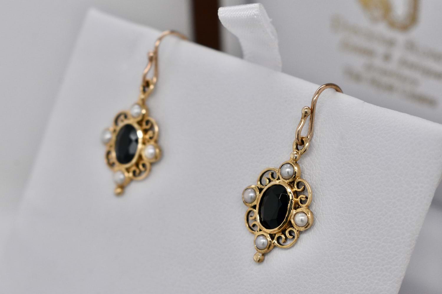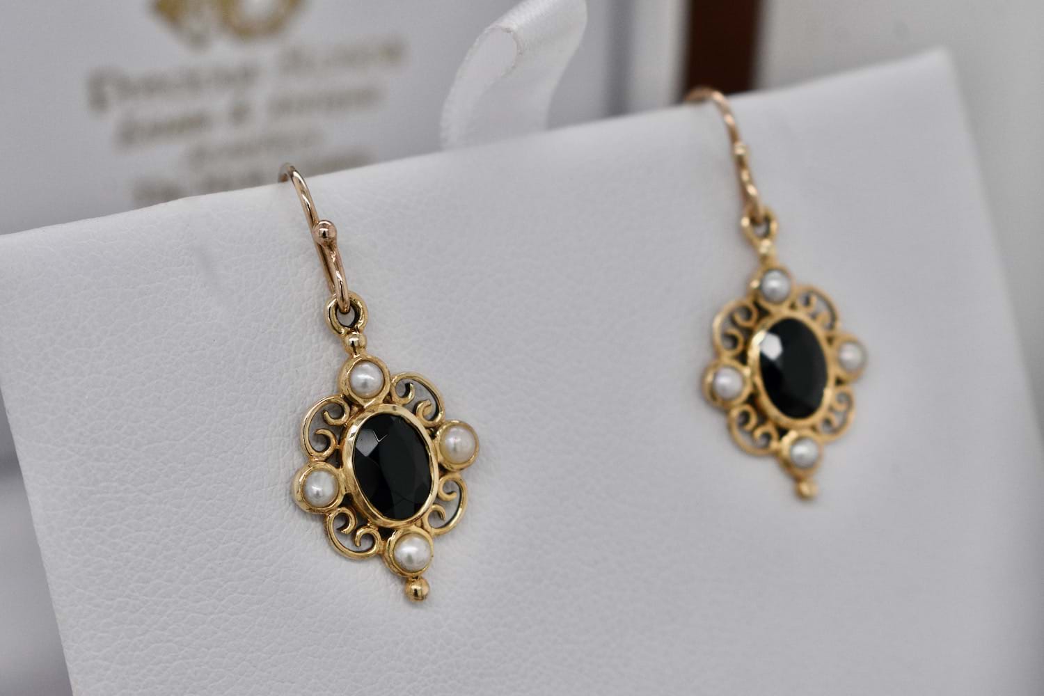 Vintage inspired 9ct yellow gold filigree drop earrings with oval rub over onyx surrounded by scroll filigree with a seed pearl set at top, bottom, left and right and suspended from shepherd hook fittings. Earring pendants measure 18x12mm
