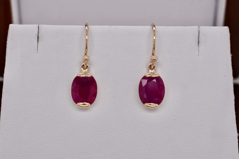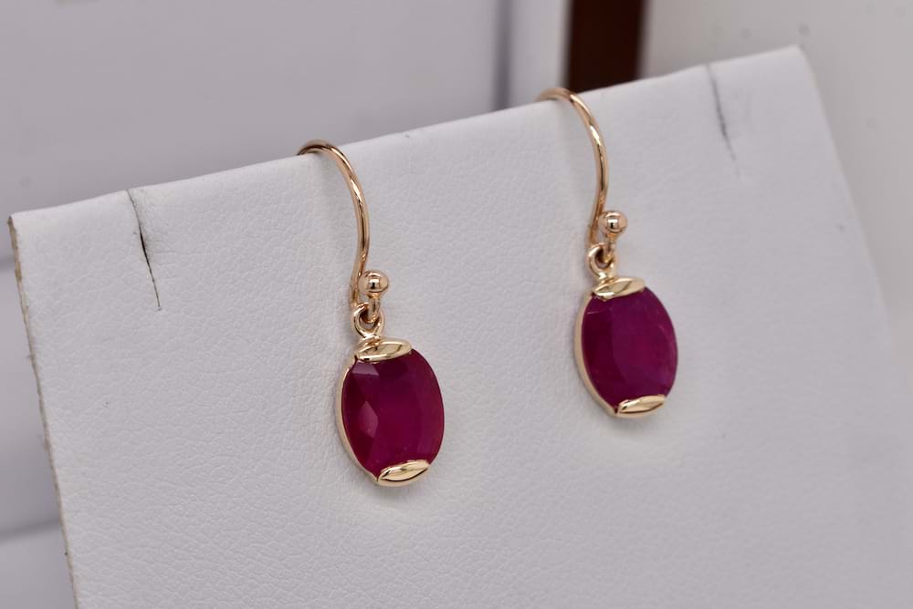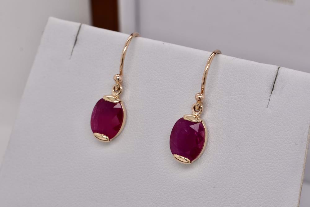Handmade 9ct yellow gold part bezel set drop earrings featuring natural, opaque, rubies measuring 9x7mm oval suspended from shepherd hook fittings. Matching pendant (20299026) is available for separate purchase