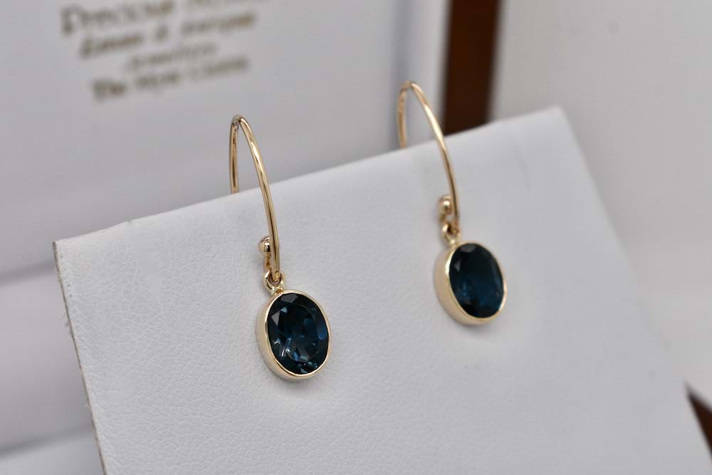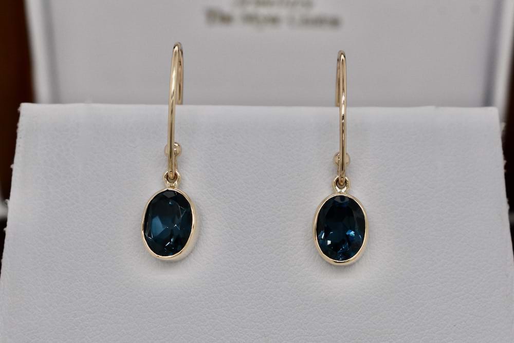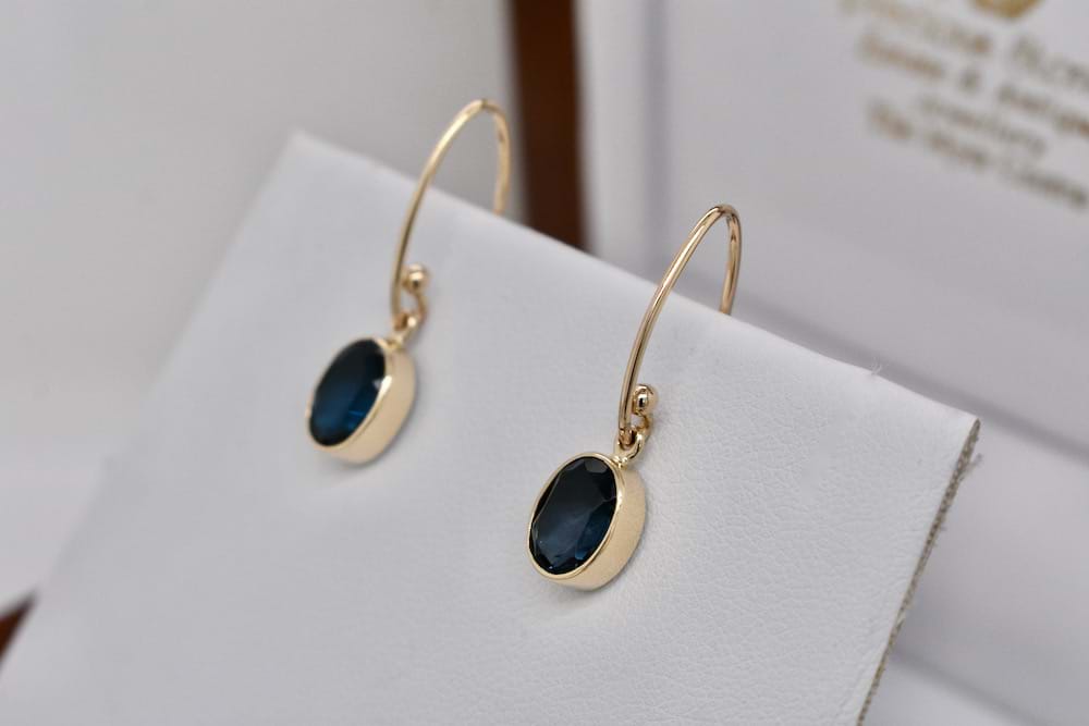 Handmade in 9ct yellow gold these bezel set oval London blue topaz measuring 9x7mm are suspended from elongated V shape hook fittings