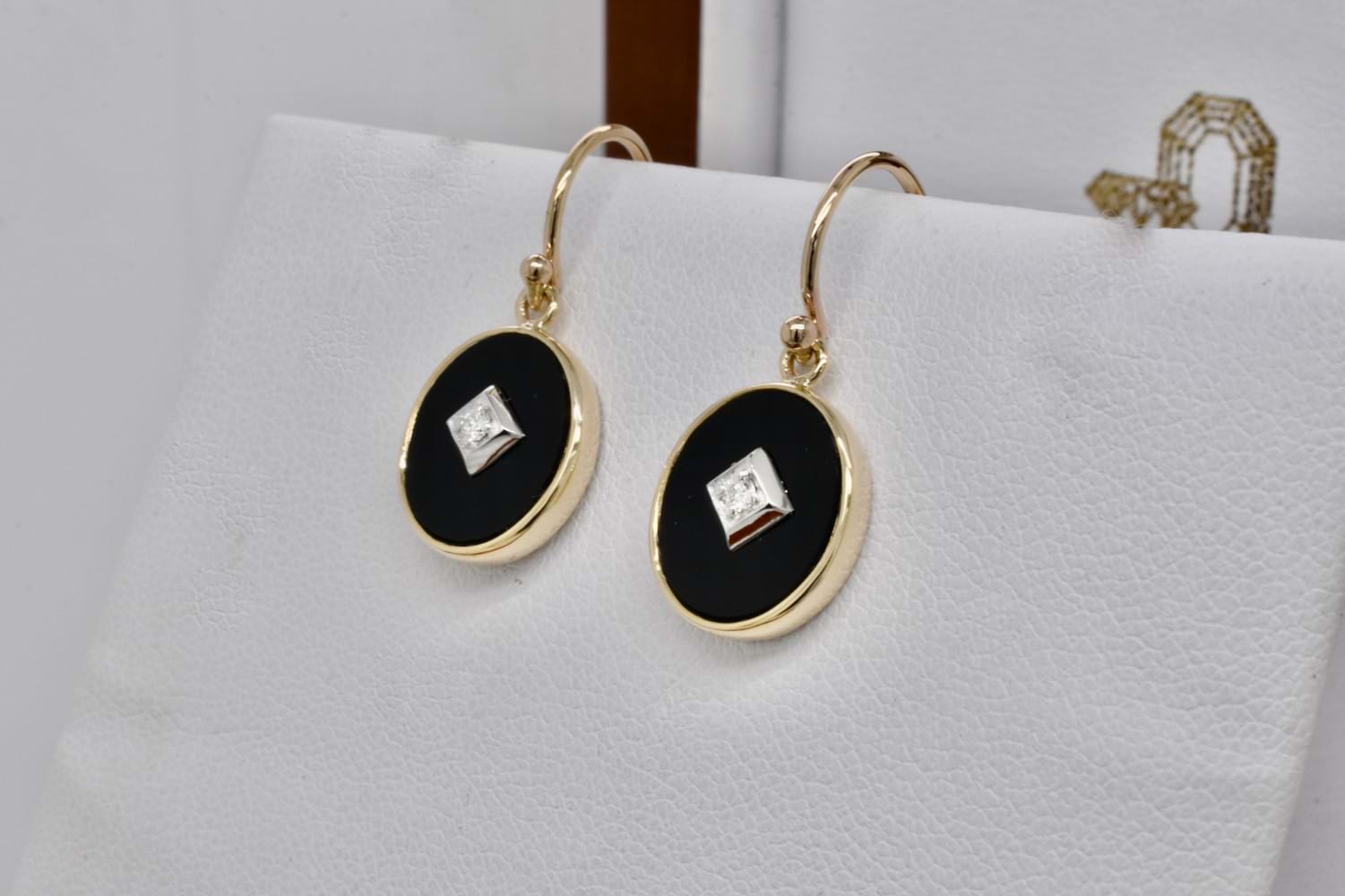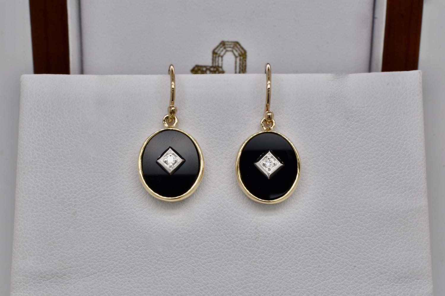 An elegant and classic pair of drop earrings crafted in 9ct yellow gold, featuring oval pieces of onyx measuring approximately 13 x 11mm and set with a sparkling diamond bezel set in the centre. With shepherd hook fittings