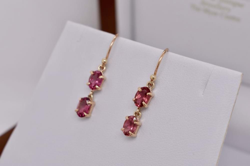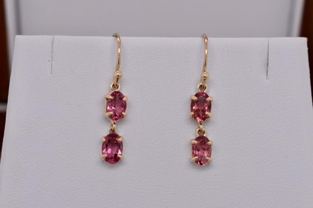9ct yellow gold handmade earrings featuring two pairs of pretty oval, faceted, pink tourmalines in four claw settings in an elegant vertical drop design and suspended from shepherd hooks. Stones measures 6x4mm