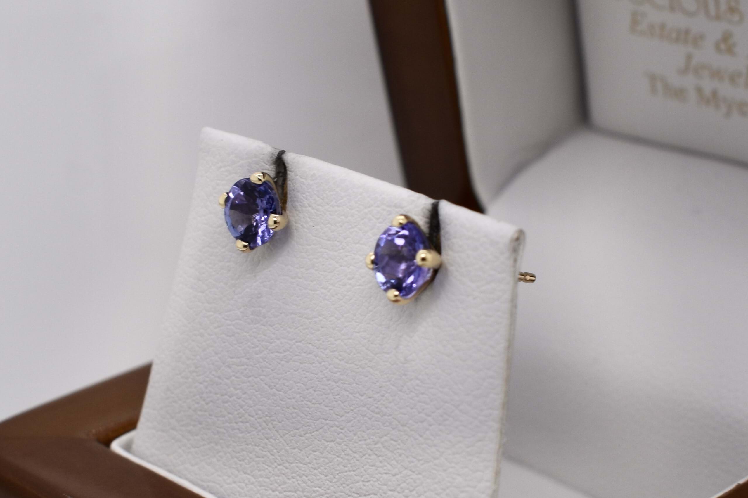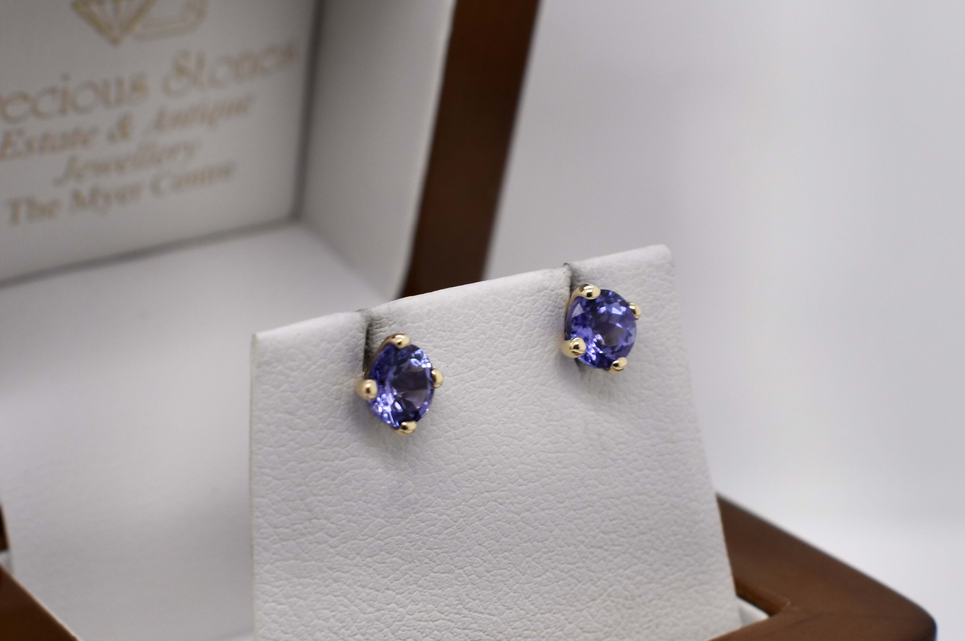 Simple and stunning 5.2mm round tanzanite stones, four claw set with simple post and butterfly settings, in 9ct yellow gold. The perfect everyday pair with a pop of colour.