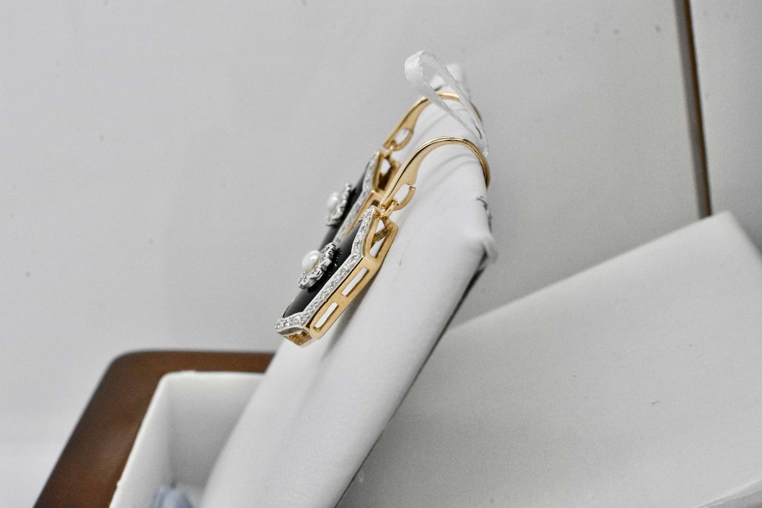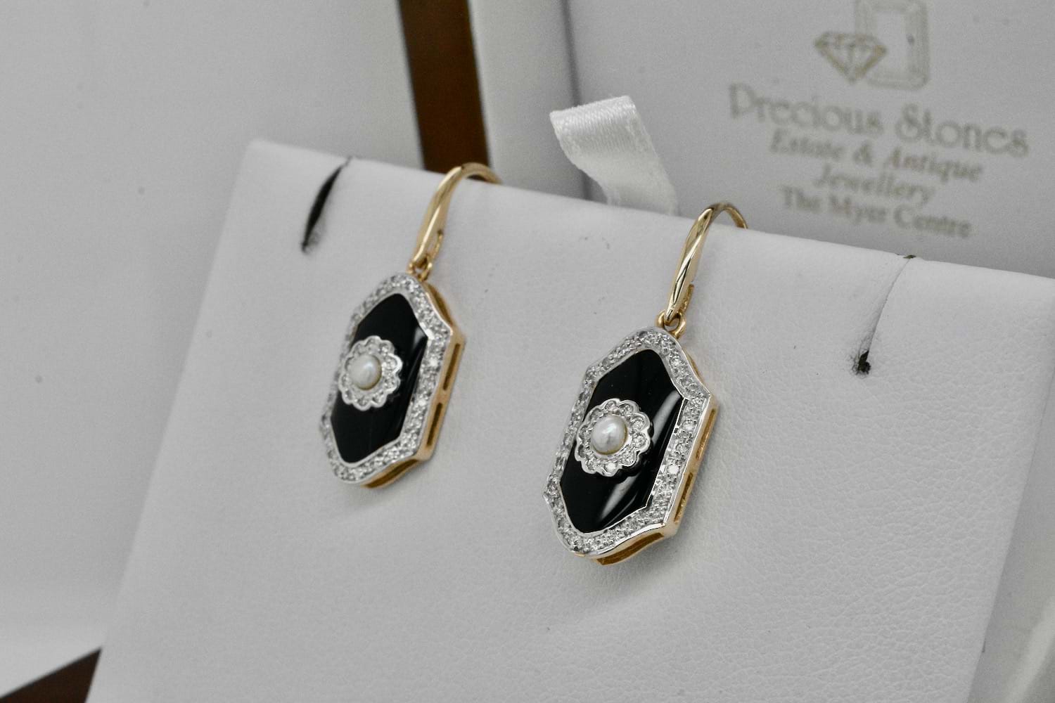 SOLD 9ct Yellow & White Gold Onyx, Seed Pearl & Diamond Earrings