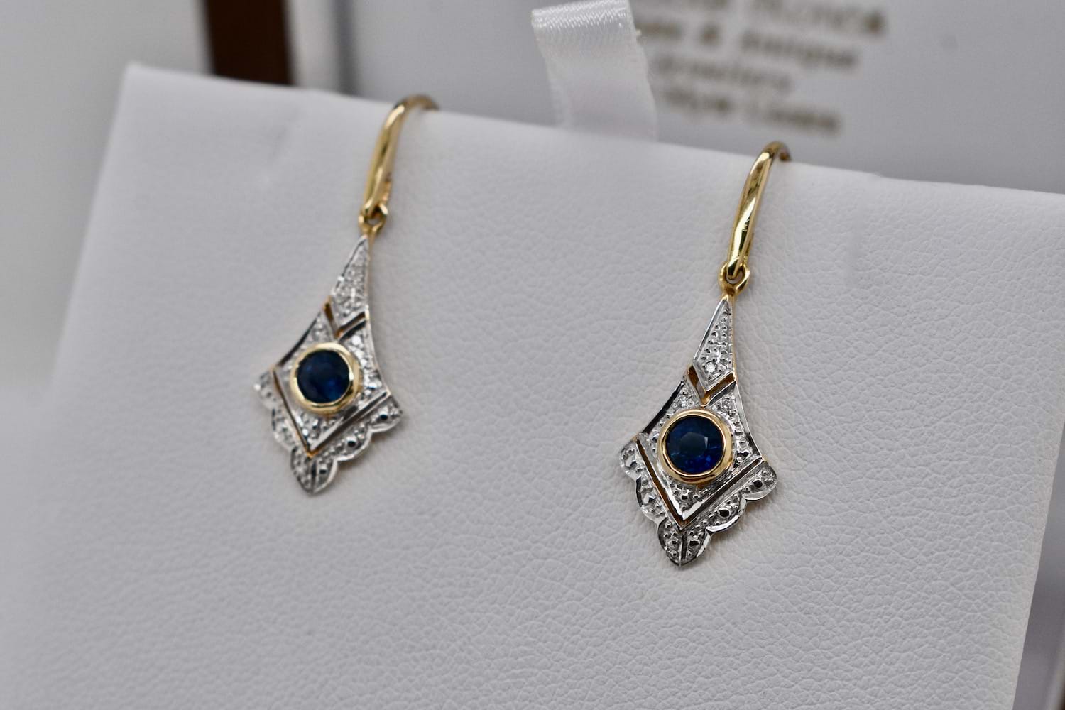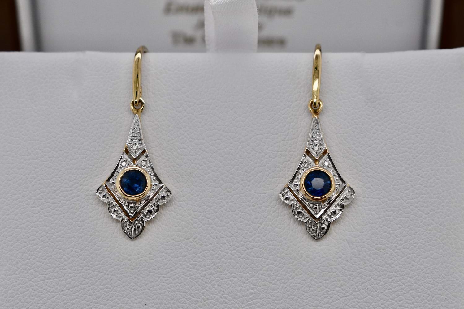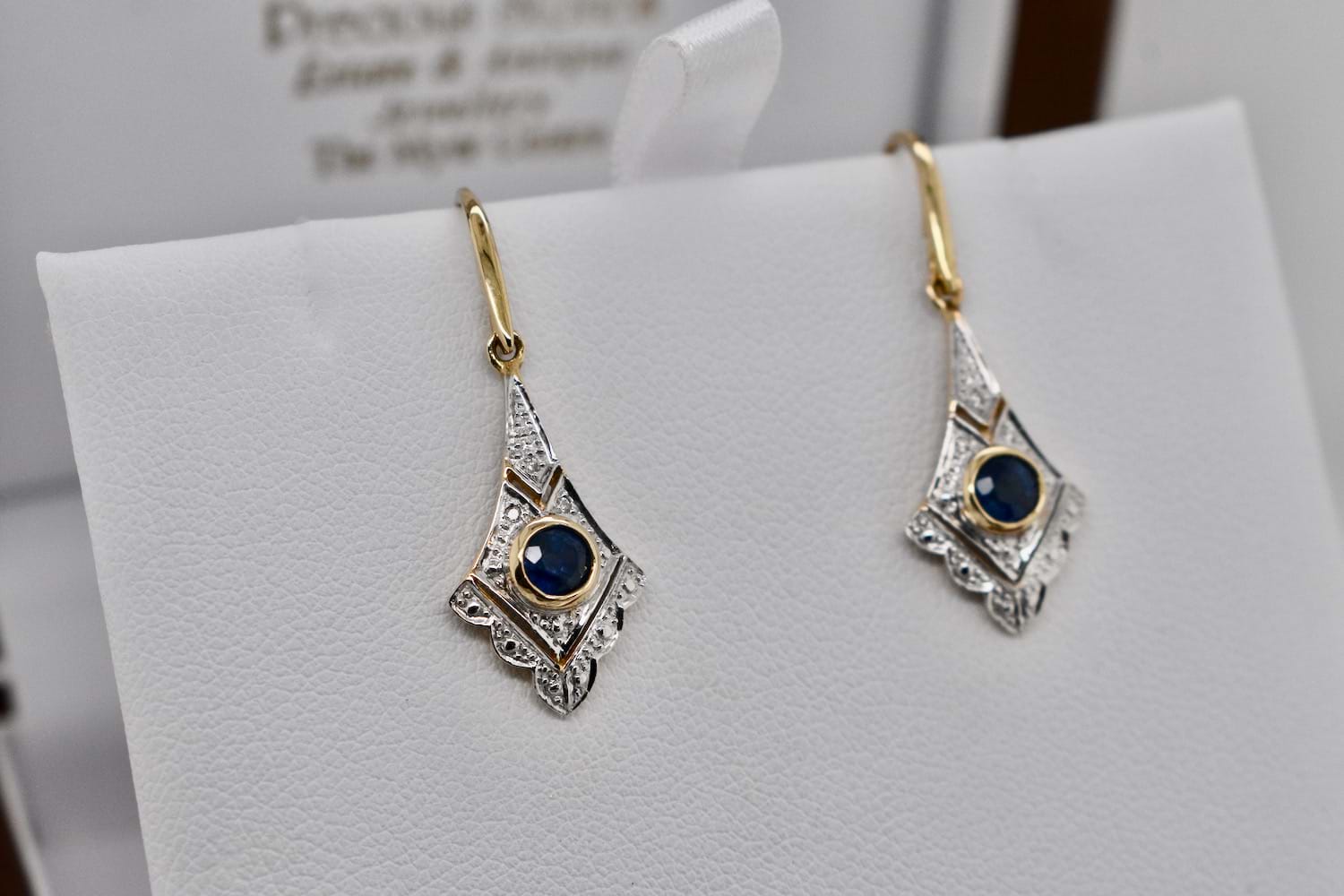 These unusual and striking Art Deco inspired earrings feature two 4mm round sapphires at the centre, bezel set with a compliment of 6 diamonds set into a scalloped cut out white gold design suspended from yellow gold shepherd hooks