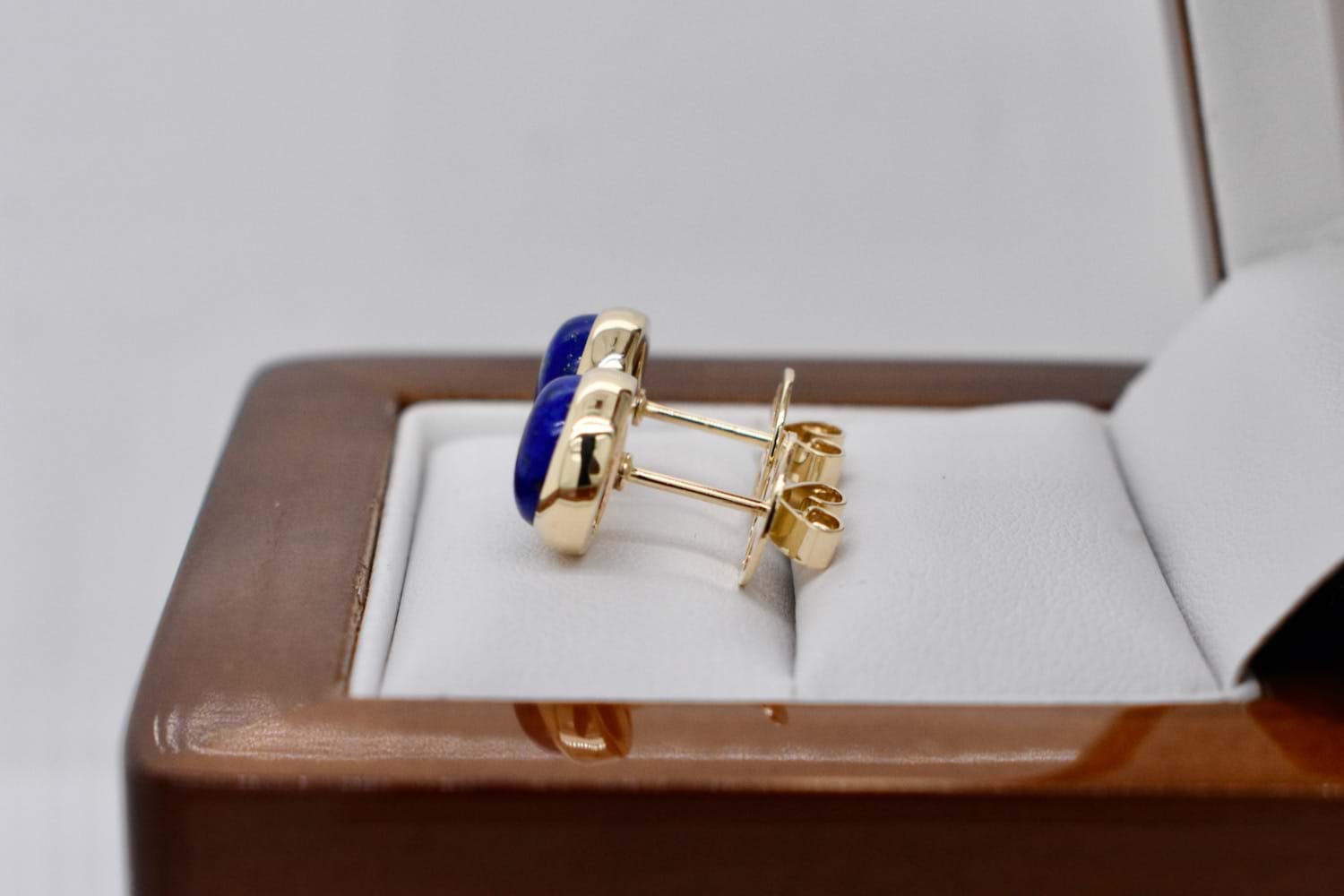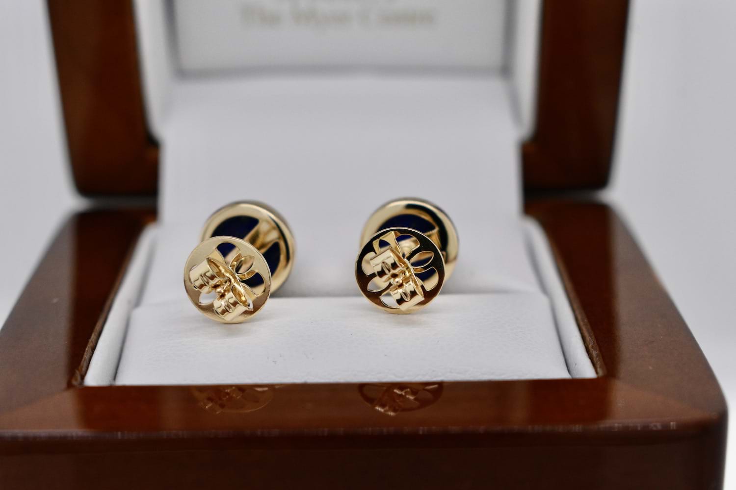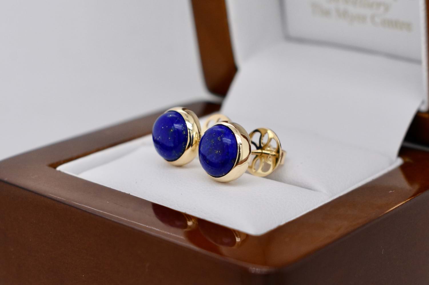 Handmade 9ct yellow gold bezel set Lapis measuring approx. 10mm round with stud post and butterfly fittings