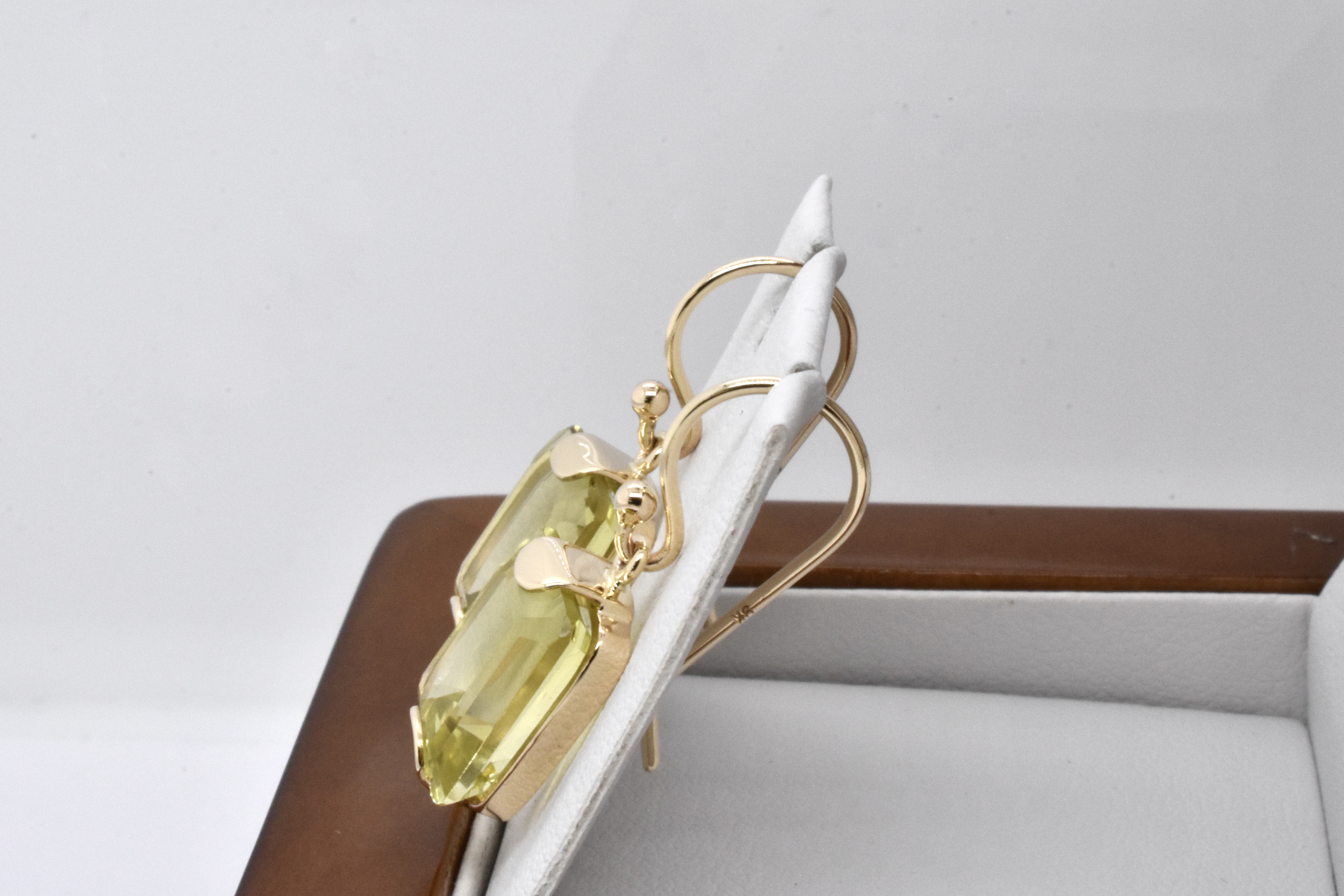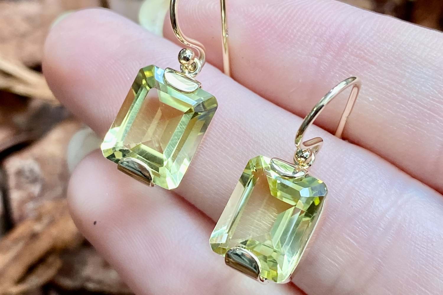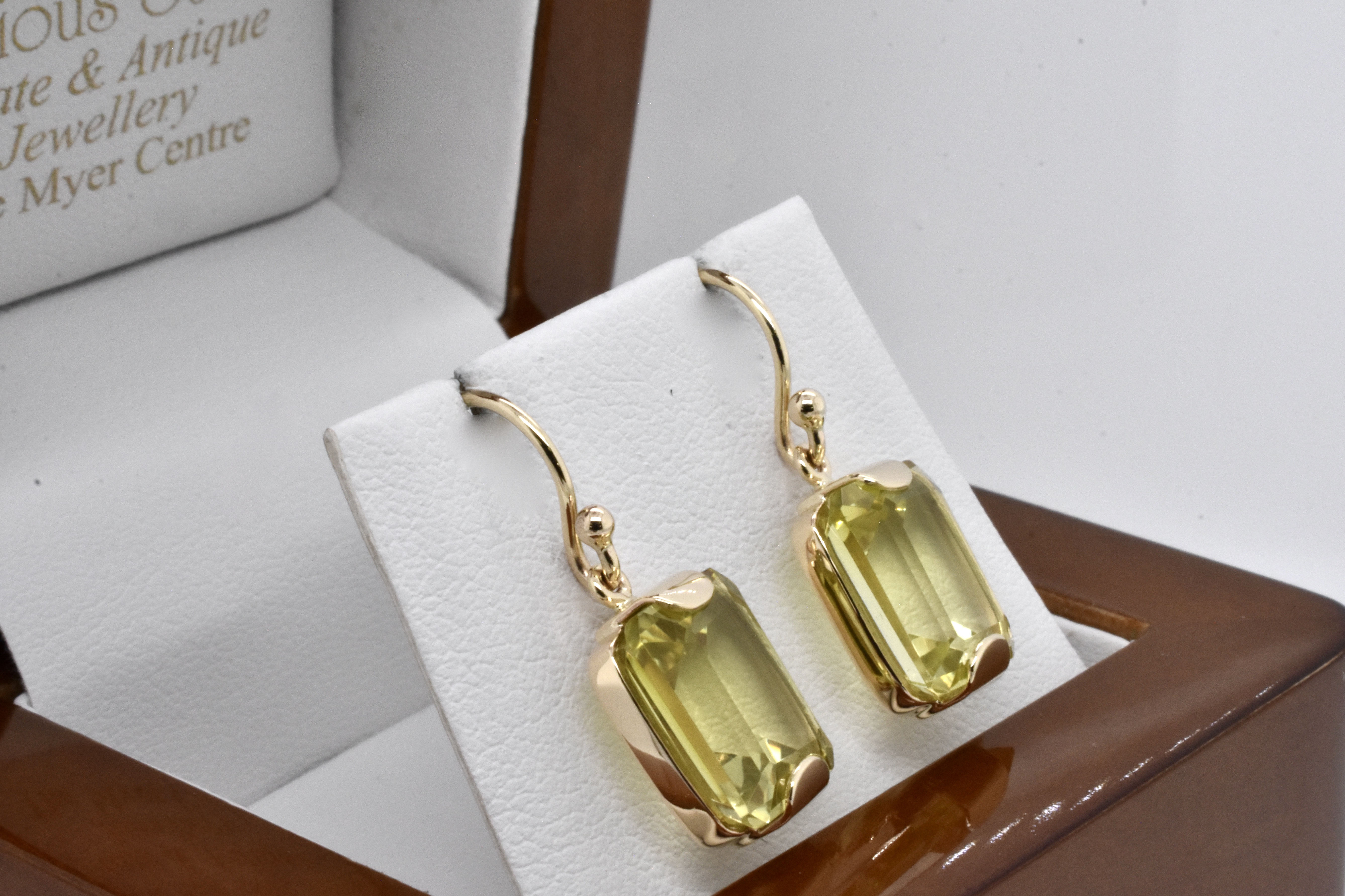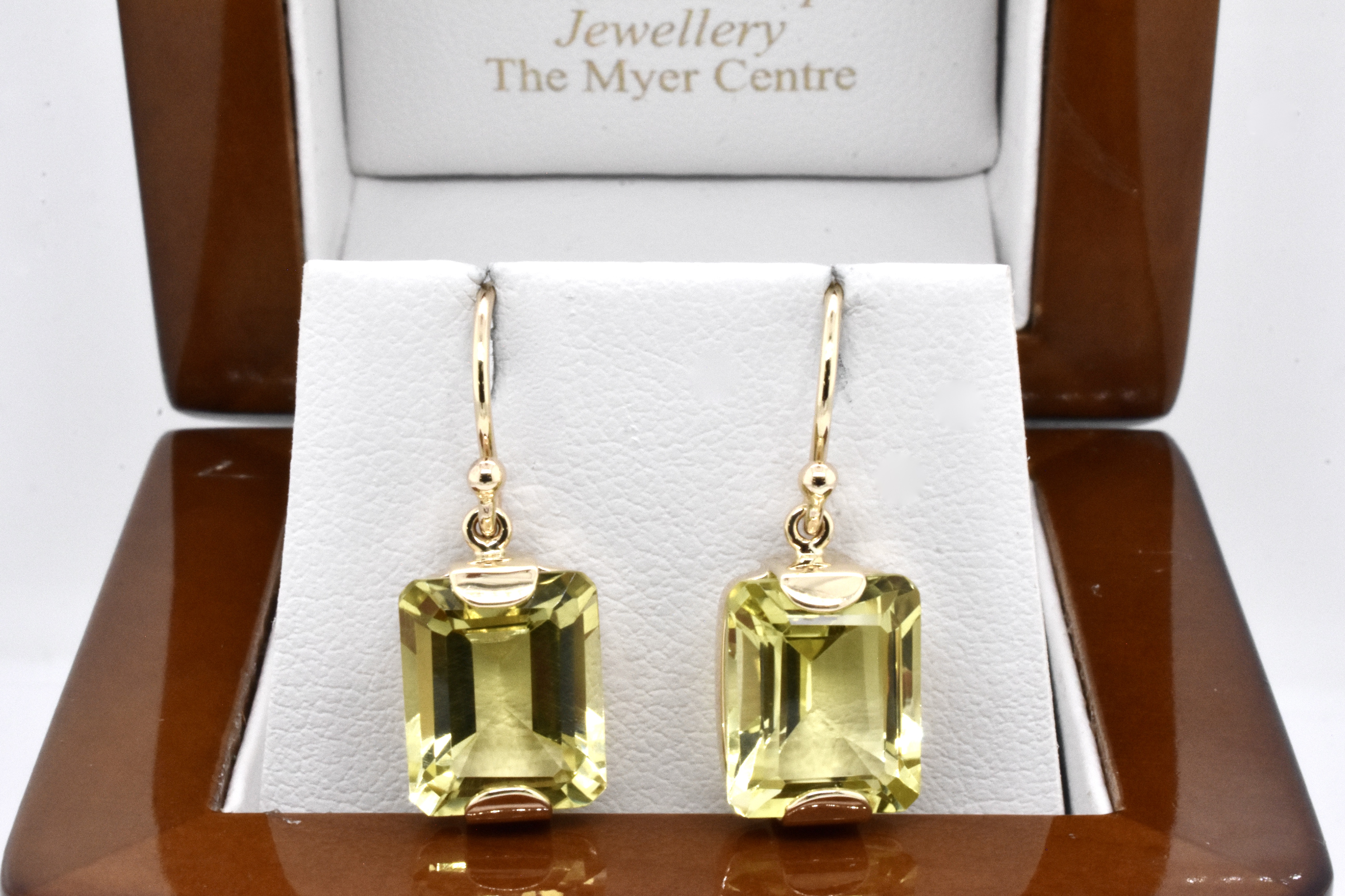 A gorgeous, sizeable pair of earrings handmade in 9ct yellow gold with approx. 12 x 9mm emerald cut lemon quartz earrings, semi bezel set with shepherd hooks