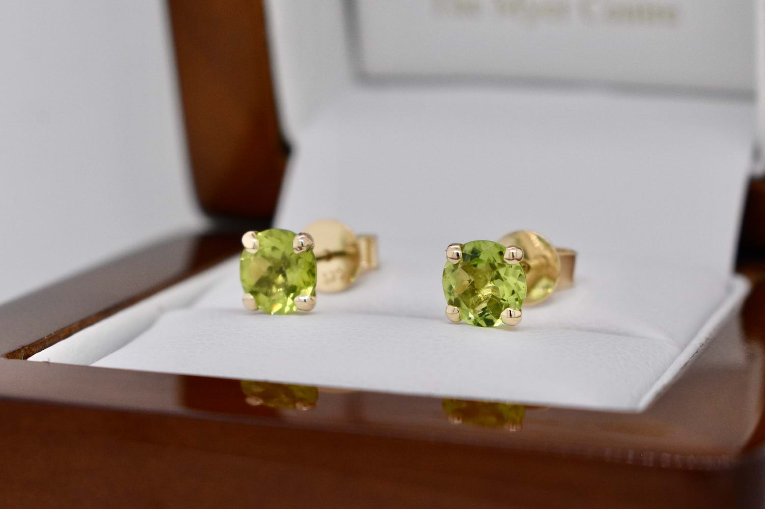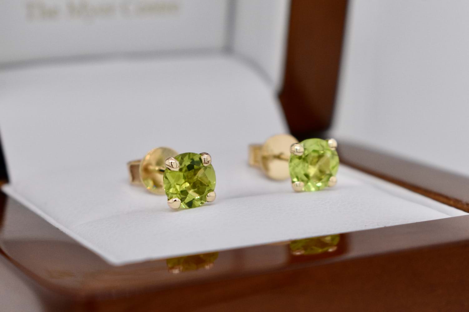 Lovely green peridot stones measuring approx 6mm round set into handmade 9ct yellow gold four claw settings with stud post and butterfly fittings