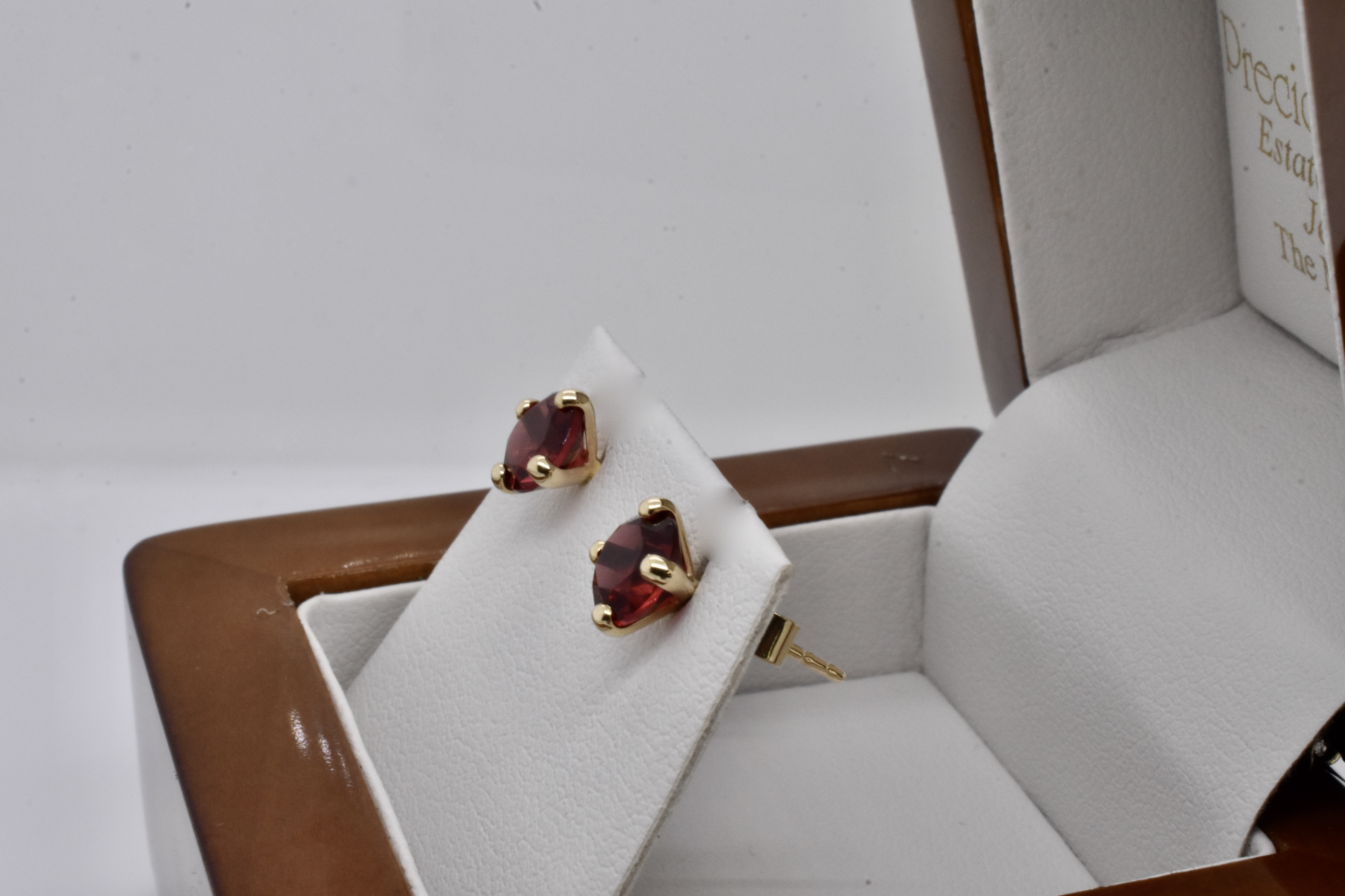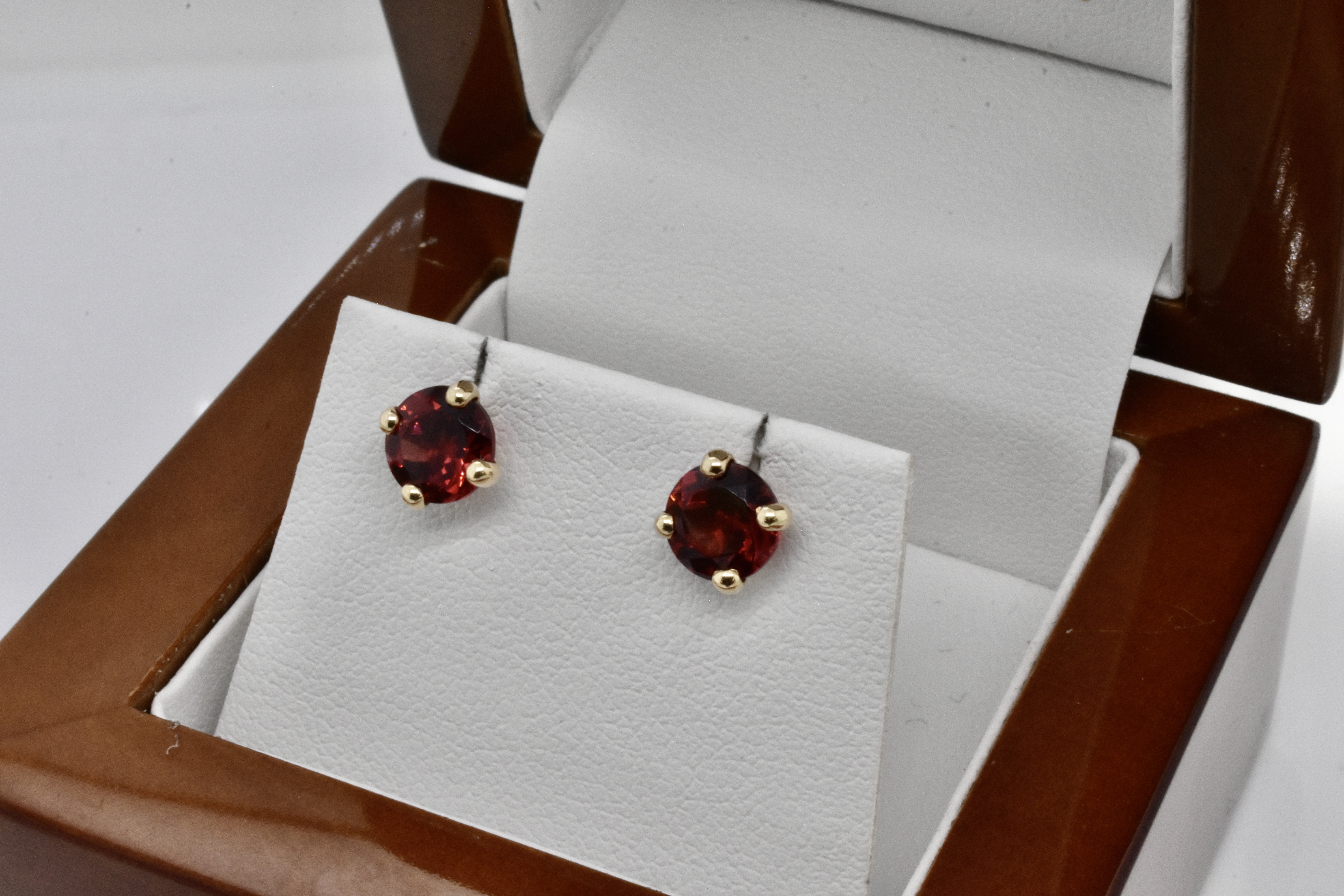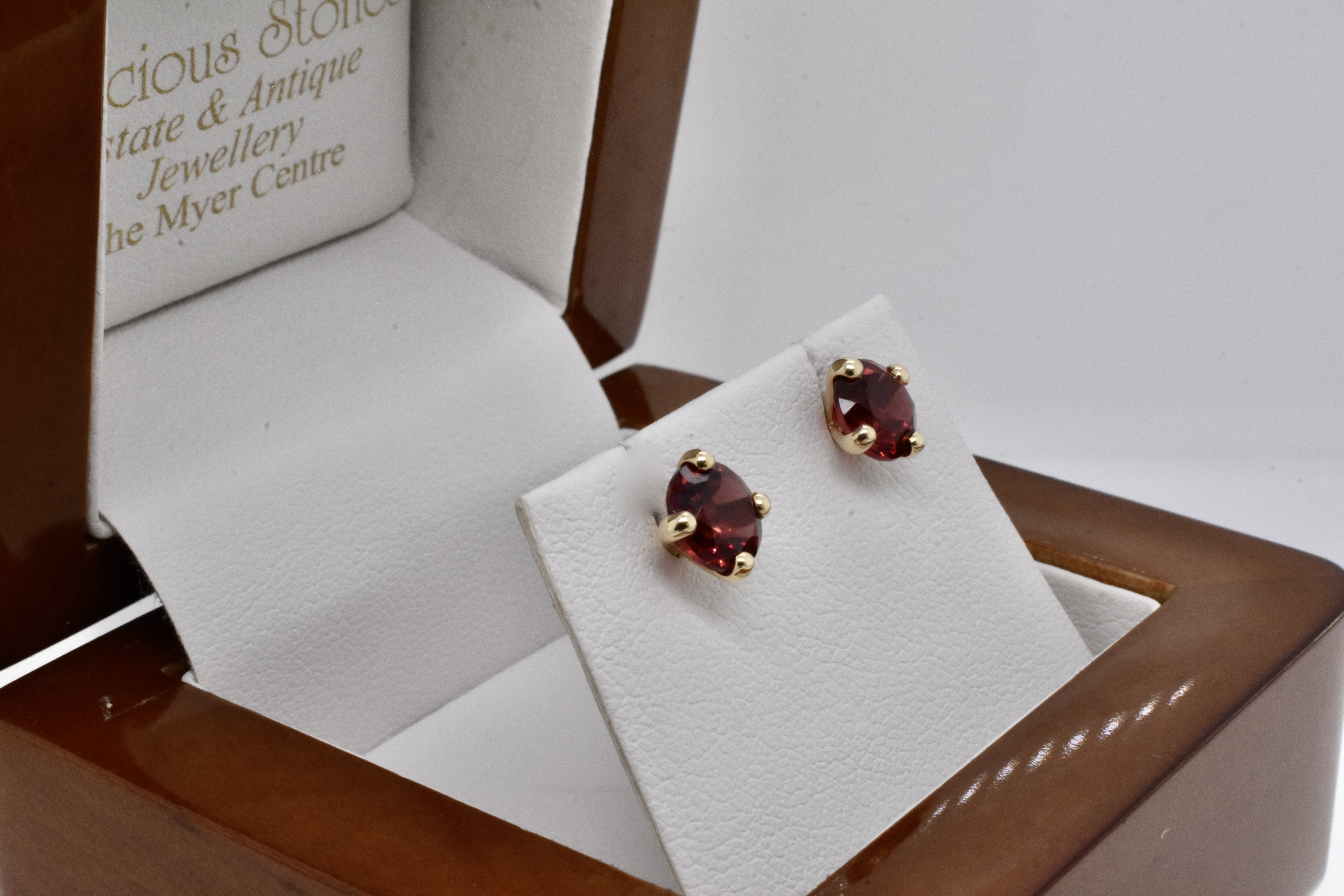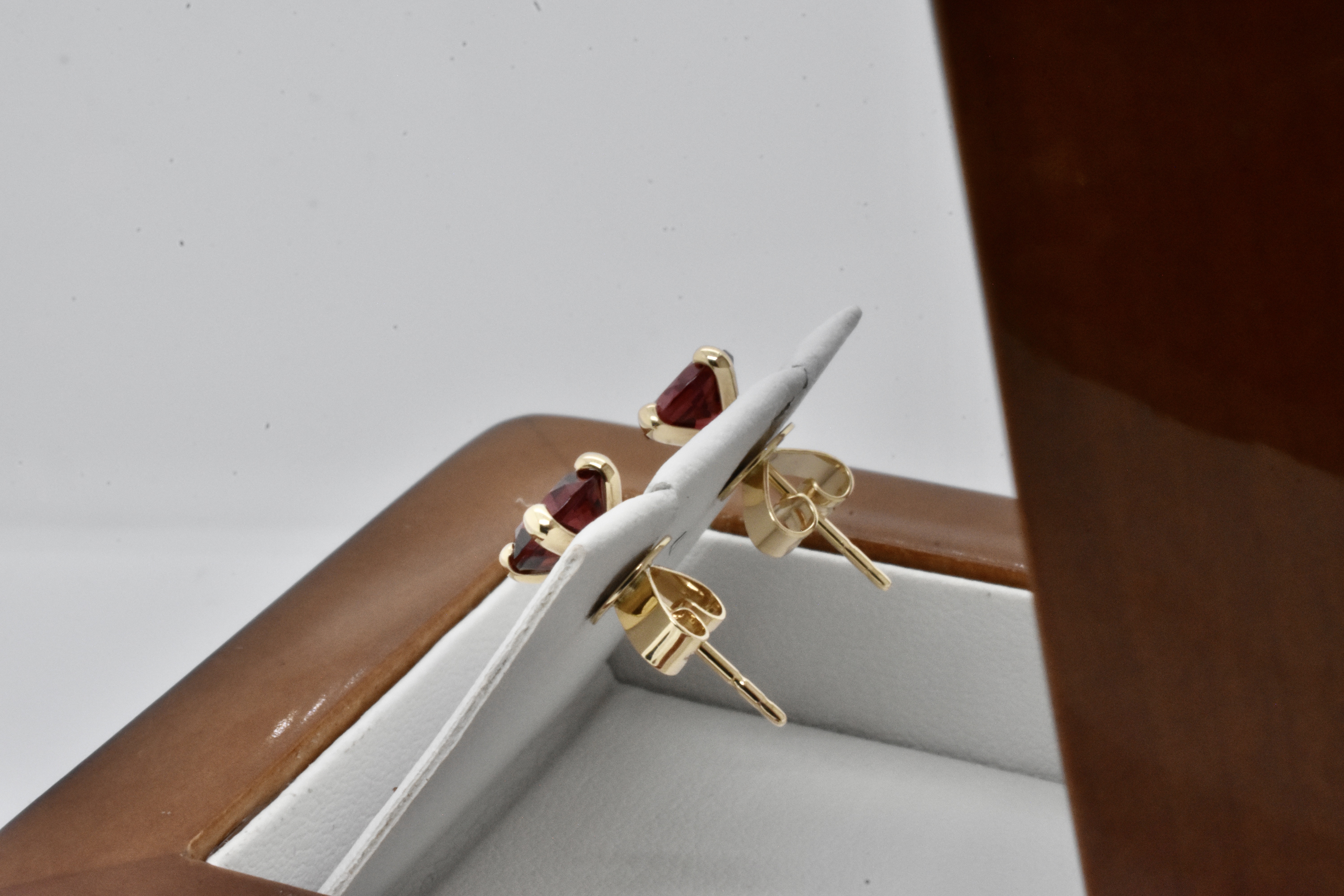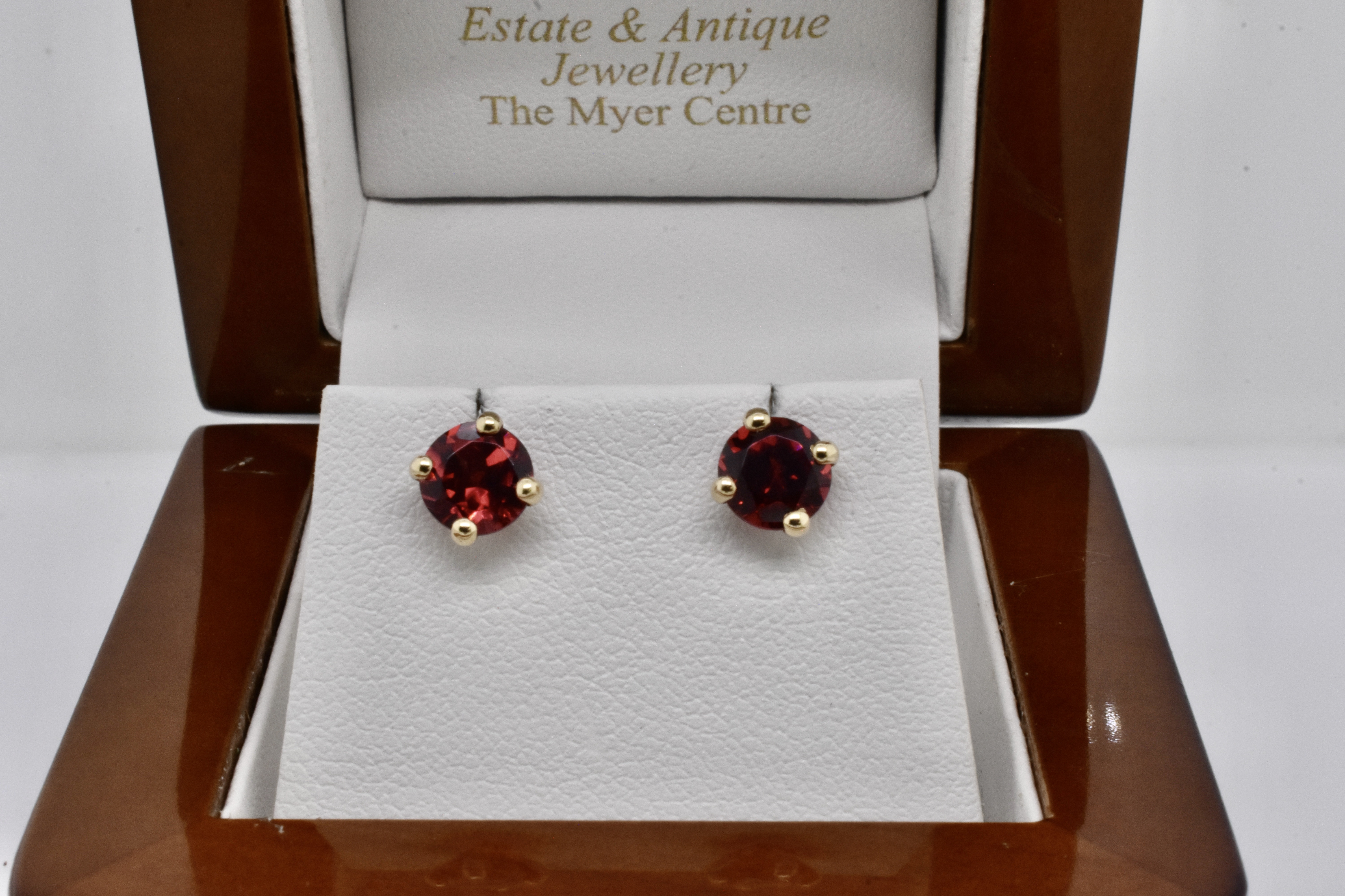 A pretty pair of handmade studs made from 9ct yellow gold with 6mm round garnets, 4 claw set with post and butterfly fittings
