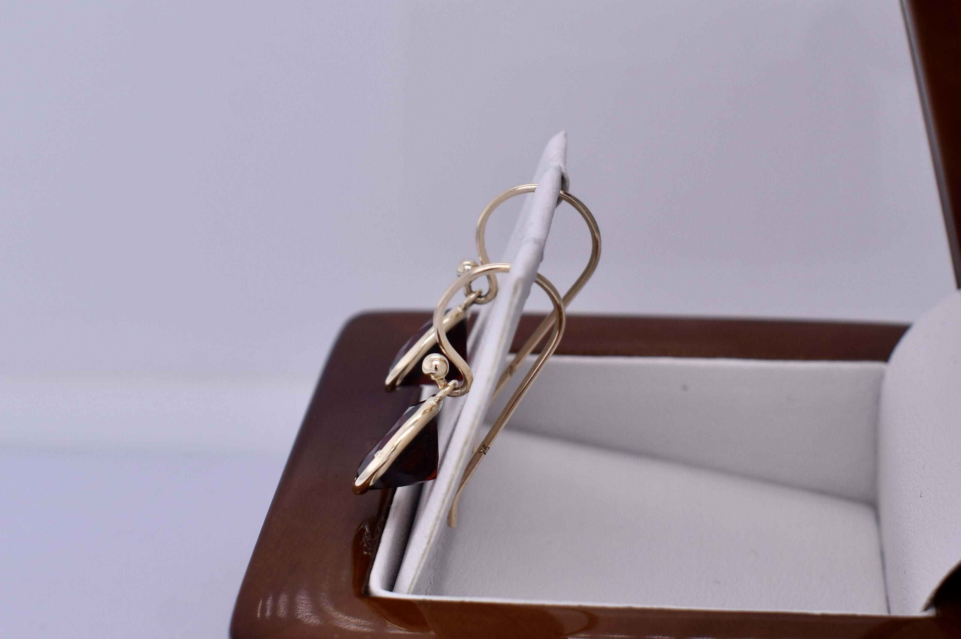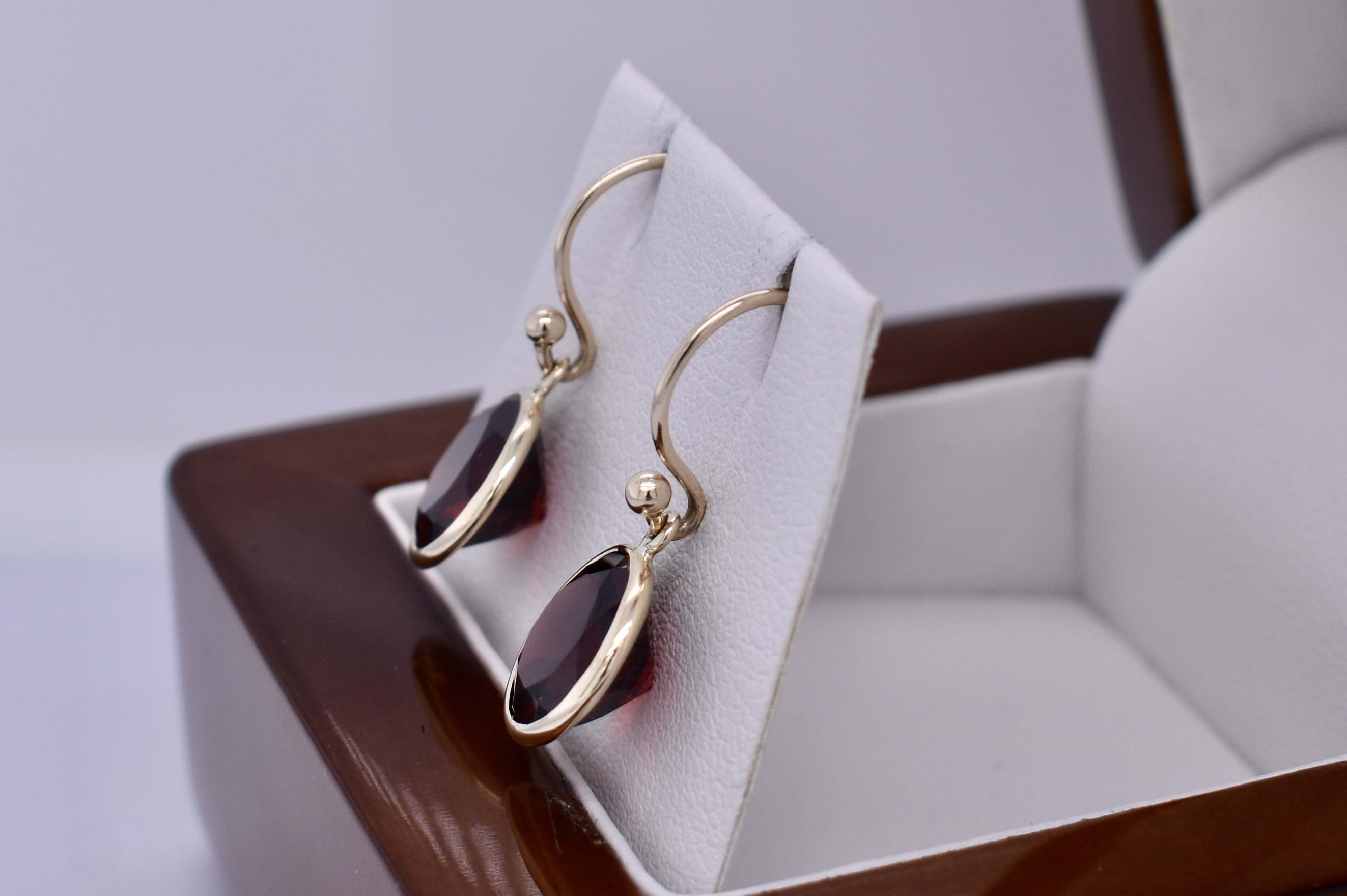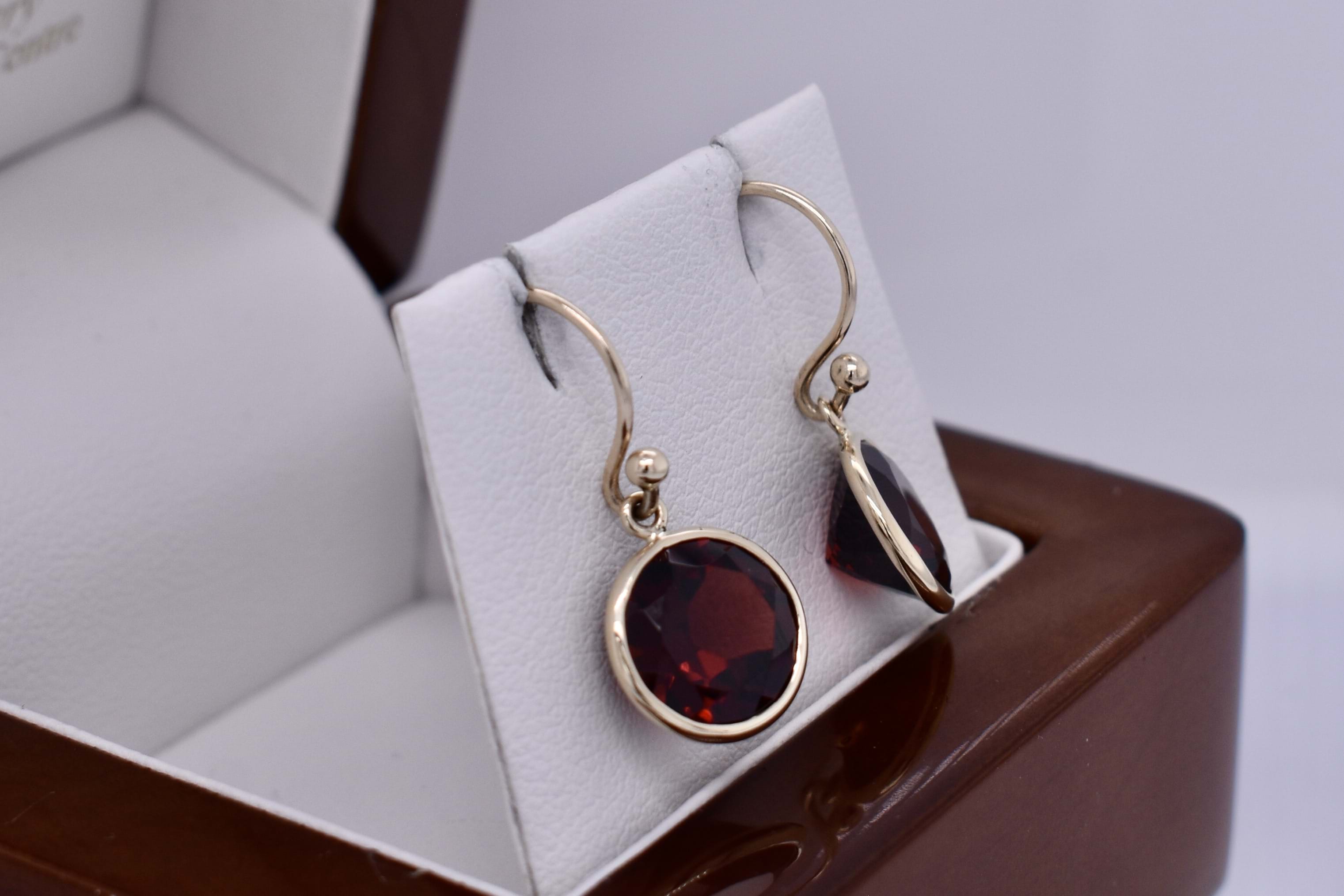This lovely pair of round garnet drop earrings, measure 7.9mm round and are bezel set in handmade 9ct yellow gold, with shepherd hook fittings.